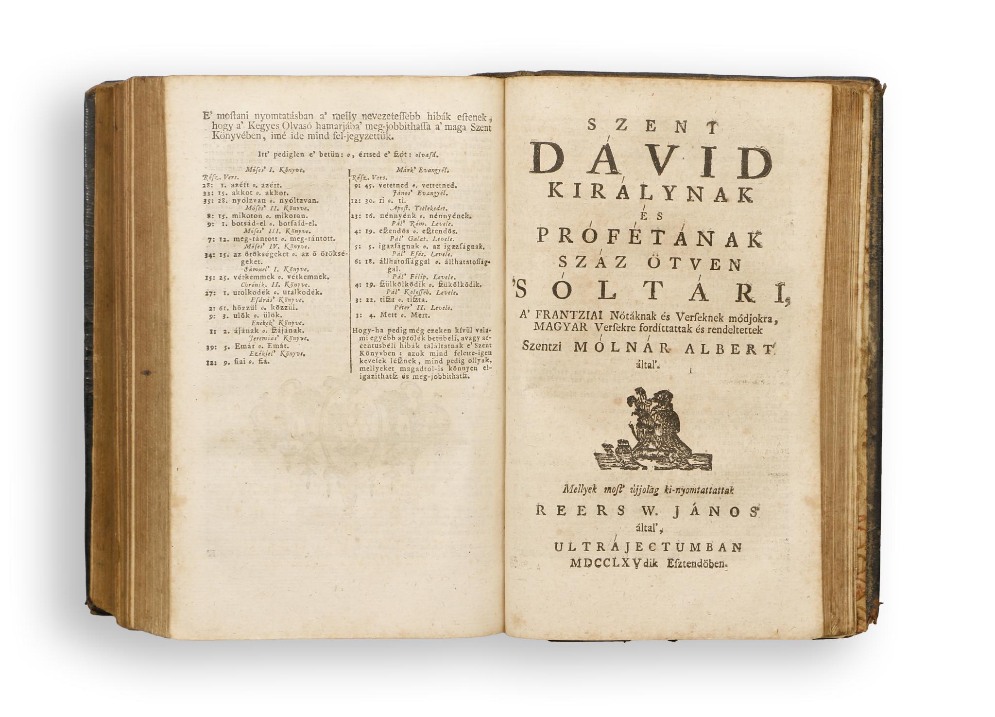 Nyomtattatott Ultrajectumban W. Reers János által 1765 Esztendőben. 1 rézmetszetű díszcímlap (az 1747-es kiadást követő, M: Johannes van Hiltrop) + 1197 p. + 104 + [6] p. (a végén Szentzi Molnár Albert zsoltáros könyve)