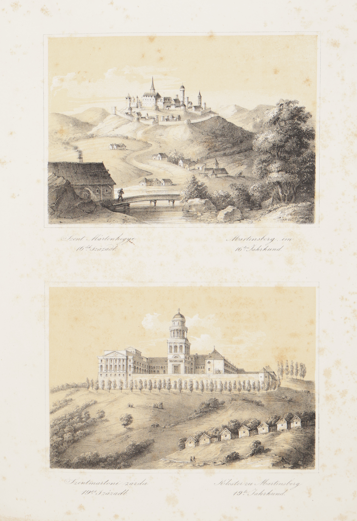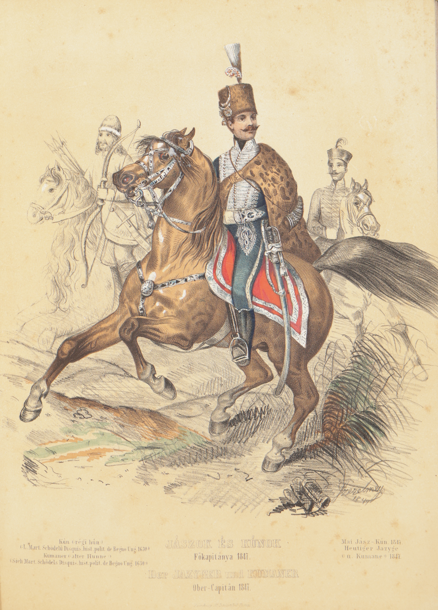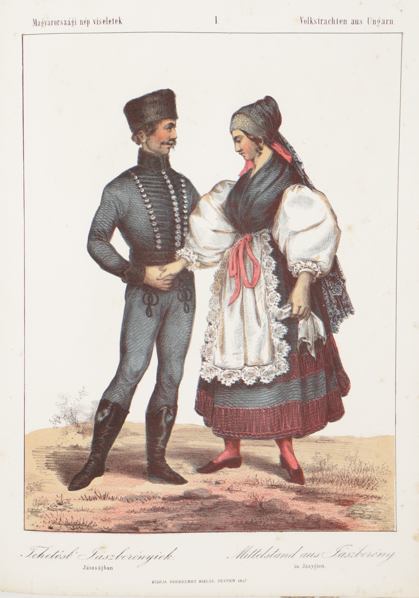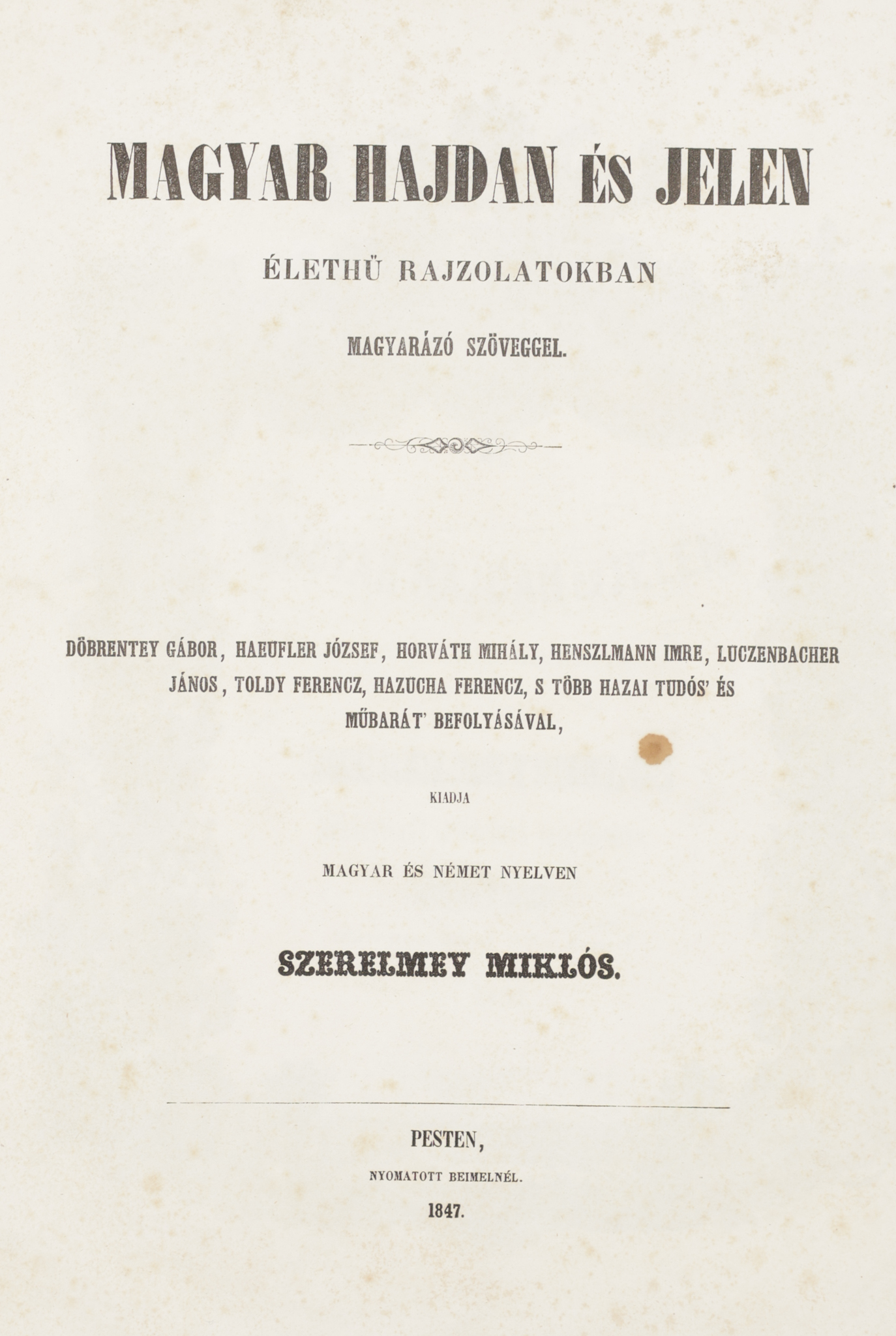 1847 Pesten, Beimel, [Landerer és Heckenast ny.]Szerelmey Miklós Magyar hajdan és jelen. Élethű rajzolatokban. Magyarázó szöveggel. Döbrentey Gábor, Haeufler József, Horváth Mihály, Henszlmann Imre, Luczenbacher János, Toldy Ferencz, Hazucha Ferencz s több hazai tudós és műbarát befolyásával, kiadja – –. Pesten, 1847, Beimel. [Landerer és Heckenast ny.] 1t. (kőnyomatú, színes díszcímlap)+1t. (ajánlás)+[4]+40p.+ 25t. (kőnyomat, 7 színes).