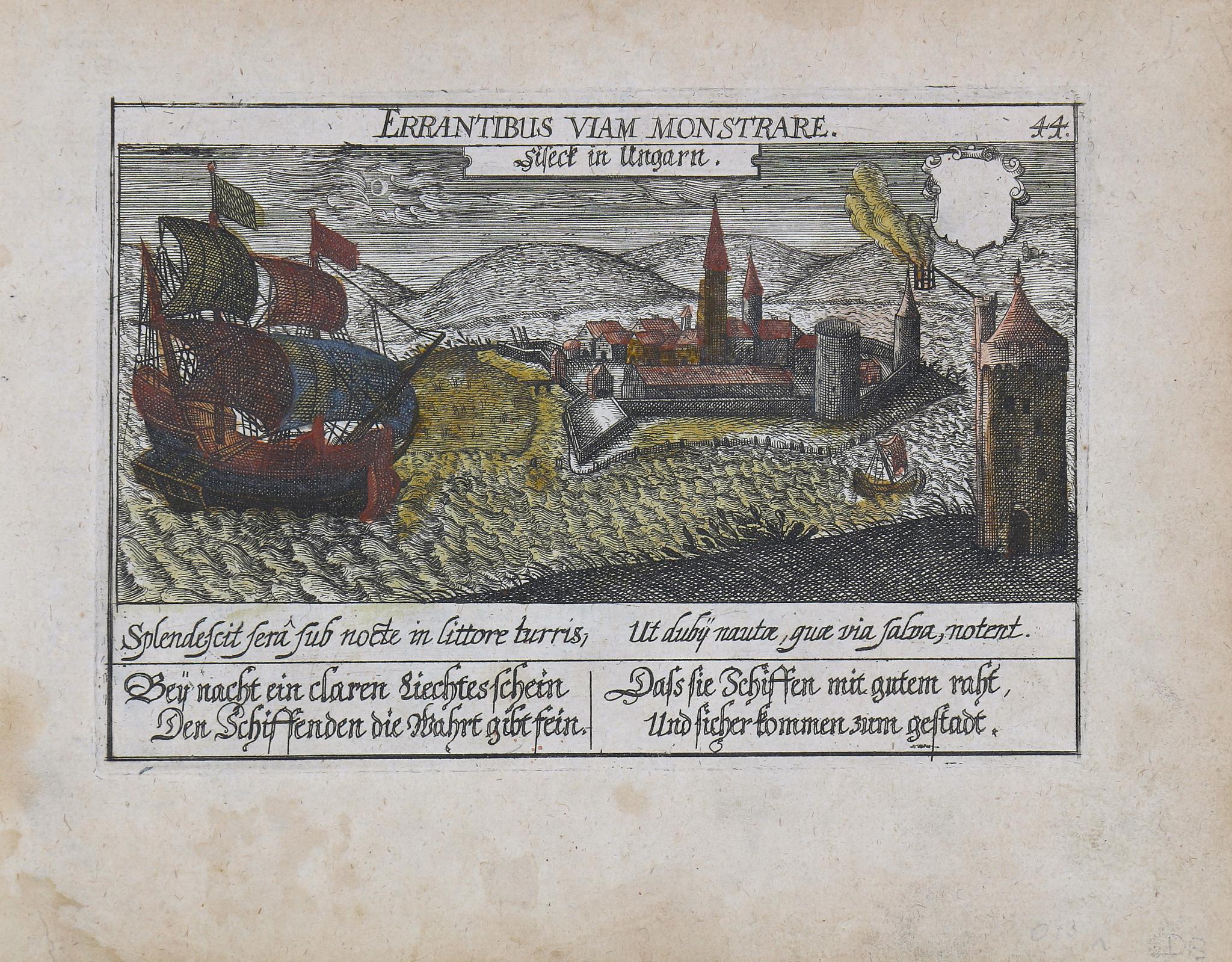 Cím az illusztráció felső részén, közepén. A venduta felett az "Errantibus Viam Monstrare." mottóval. A kép alatt egy erkölcsi mondás olvasható latin és német nyelven. Gyönyörű összkép allegorikus ábrázolással az előtérben.