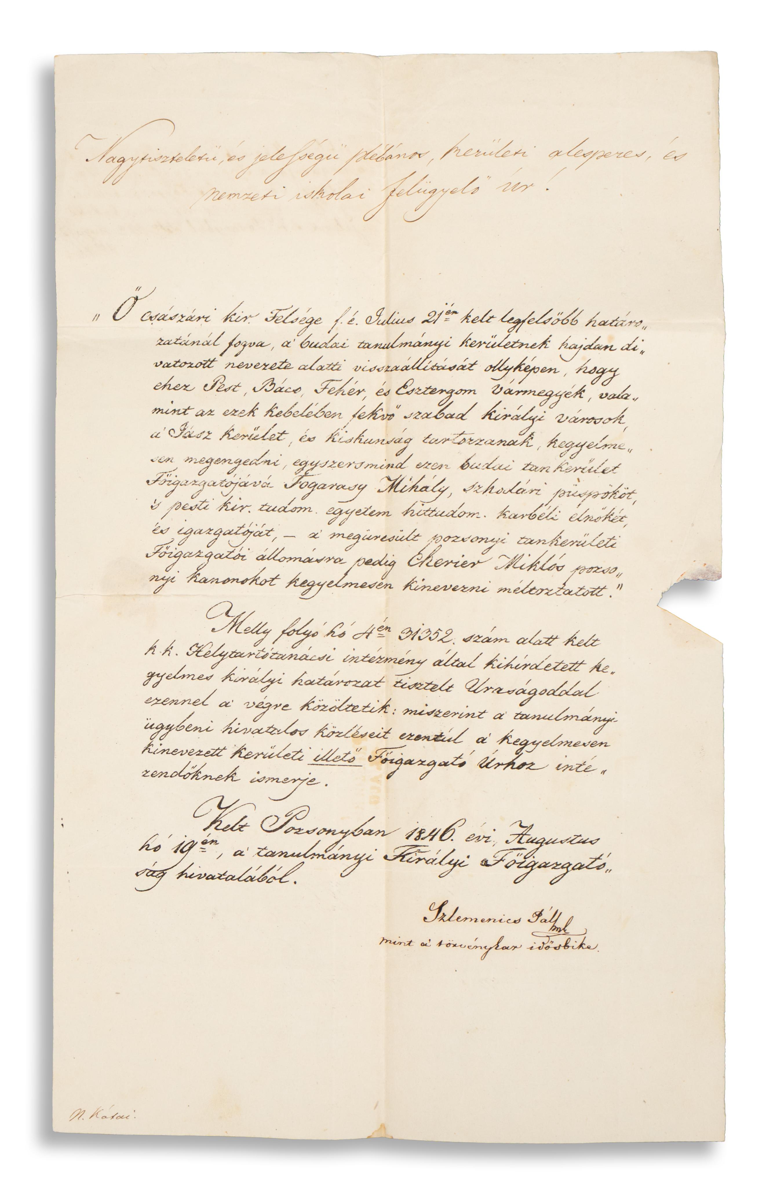 Pozsony, 1846. augusztus 19.A „Nagytiszteletű és jelességű plébános, kerületi alesperes és nemzeti iskolai felügyelő úrnak” címzett, Pozsonyban 1846. augusztus 19-én kelt levelében Szlemenics Pál (1783–1856) jogtudós, szakíró, az MTA tagja, I. Ferenc József azon rendeletéről tájékoztatja Hermann József (1790–1875) püspököt, melyben az uralkodó visszaállítja a hajdani budai tanulmányi kerületet, „olyképpen, hogy ehez Pest, Bács, Fehér és Esztergom Vármegyék, valamint az ezek kebelében fekvő szabad királyi városok, a Jász kerület és Kiskunság tartozzanak …”, illetve melyben ezen budai tankerület főigazgatójává kinevezi Fogarasy Mihály püspököt, a „megüresült pozsonyi tankerületi Főigazgatói állomásra” pedig Cher[r]ier Miklós pozsonyi kanonokot.