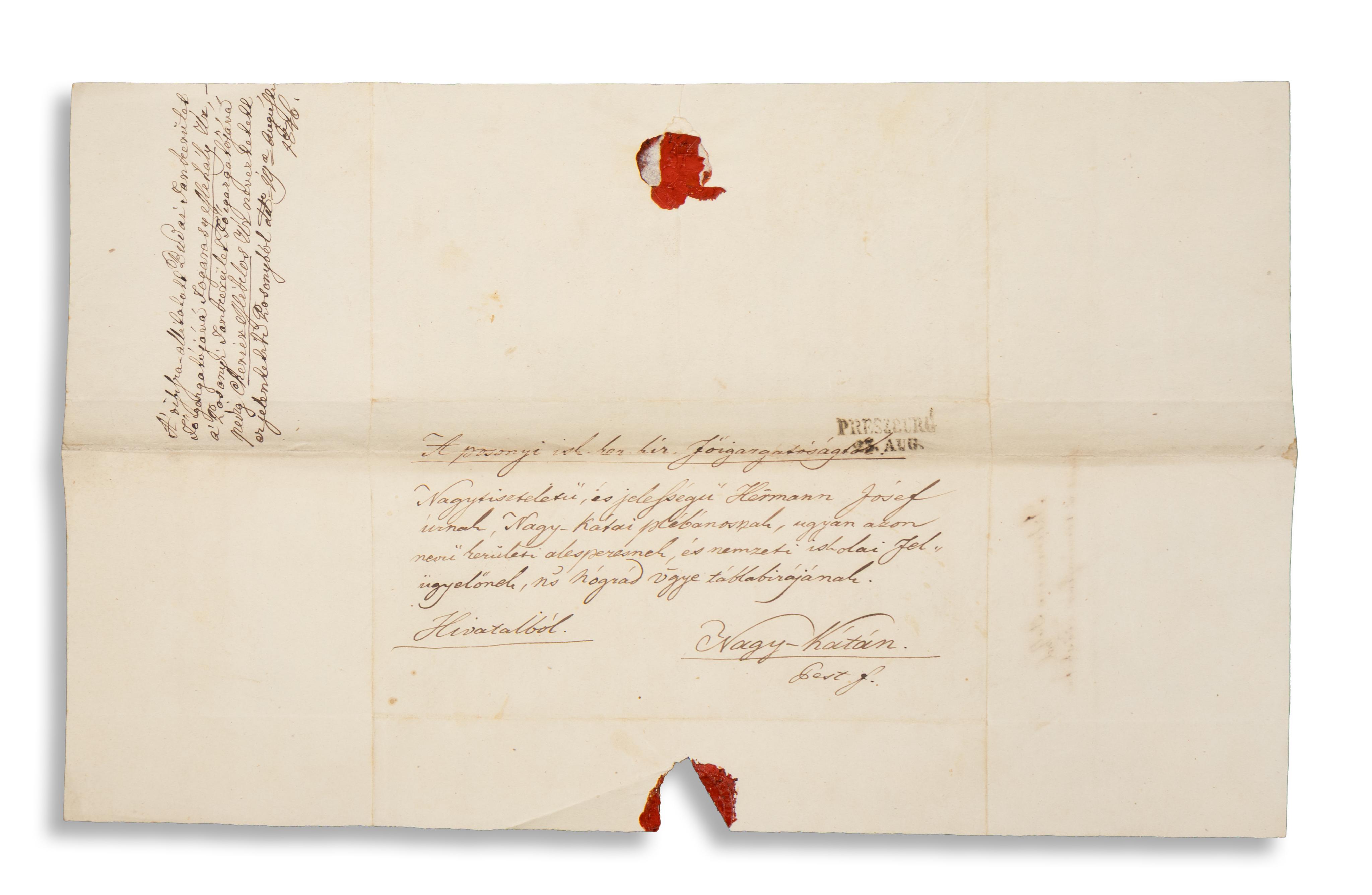 Paper, 1 folio, in Hungarian. Address, note on the content, slightly damaged wax seal, and stamp on verso.