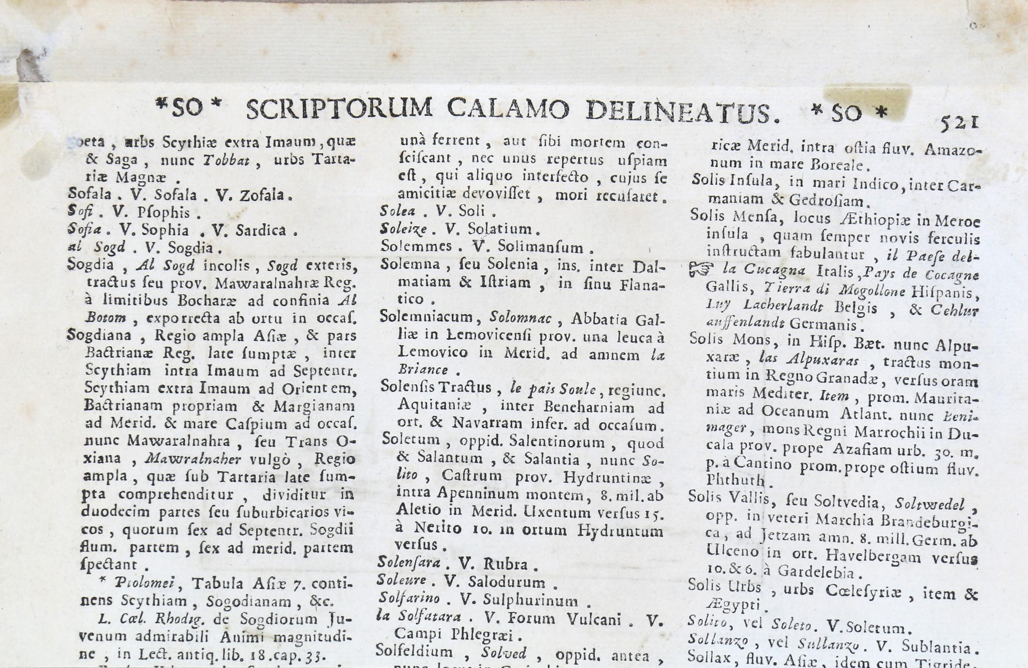 Enyhén foltos, hátulján az enciklopédia előző oldalának szövege latin nyelven.