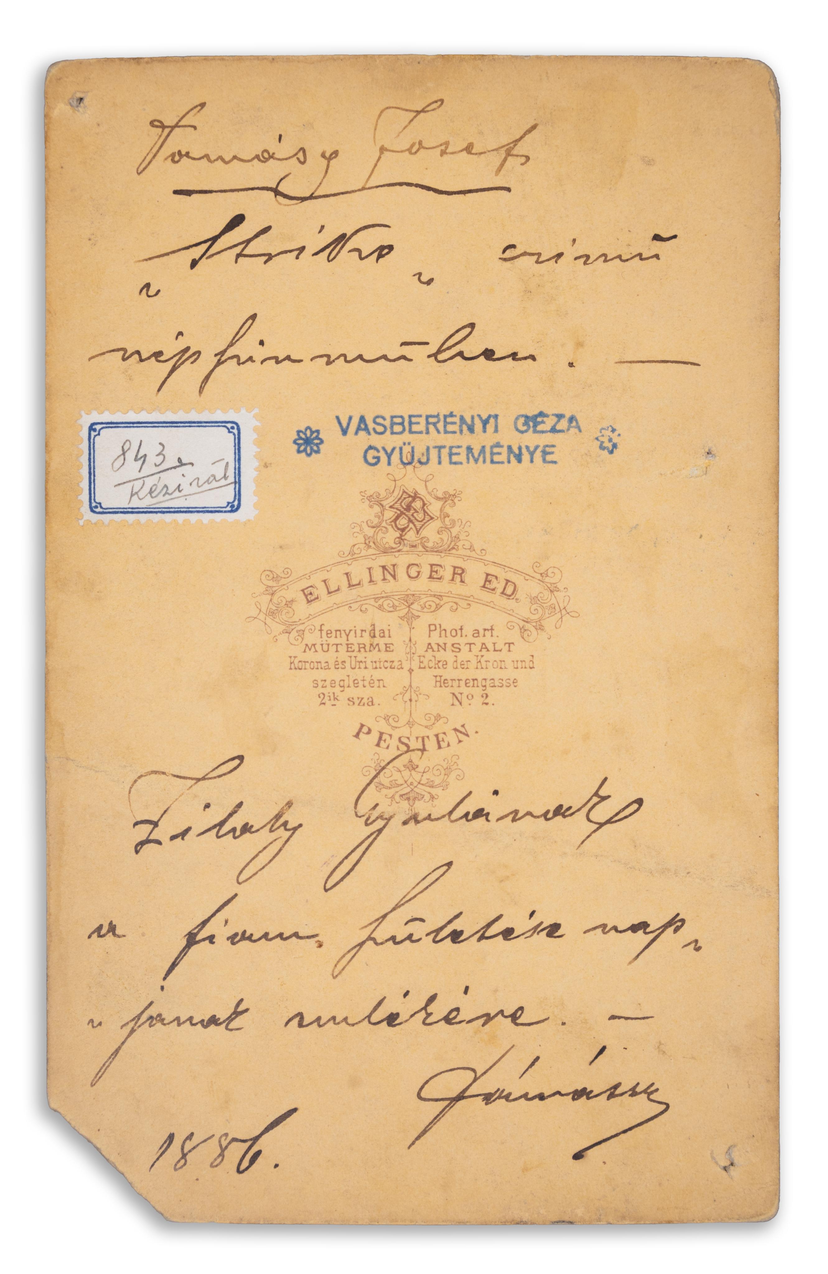 A fényképet Ellinger Ede (ca.1846–1915) császári és királyi udvari fényképész, portréfotós készítette. A fotó alatti és hátoldali fényképész embléma alapján a kép Ellinger pesti műtermében készült, mely 1870 és 1885 működött az Úri utca és Korona utca sarkán. Ily módon a fotó keletkezését e két évszám közötti időtartamra datálhatjuk.