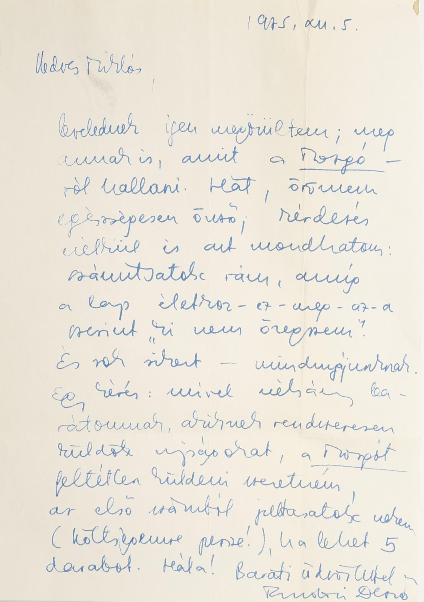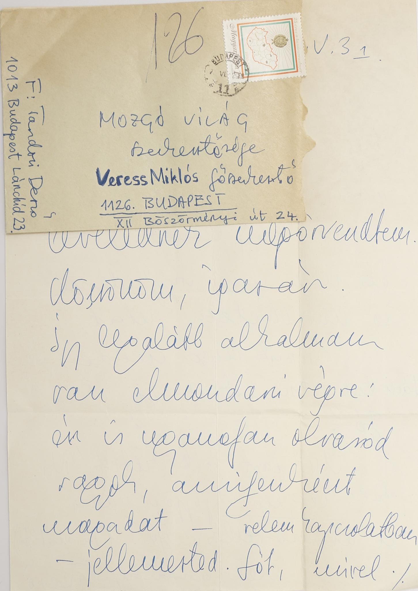 Tandori Dezső (1938 –2019) örömét fejezi ki, hogy Veress „lapot csinál” és kíván „sok sikert hozzá – magunknak.” Biztosítja afelől, hogy számíthatnak rá. Átküldi egy írását (Futballisták stb), amit be lehet tenni majd egy számba és kéri, hogy ha lehet, egy példányt gépeljenek le számára.