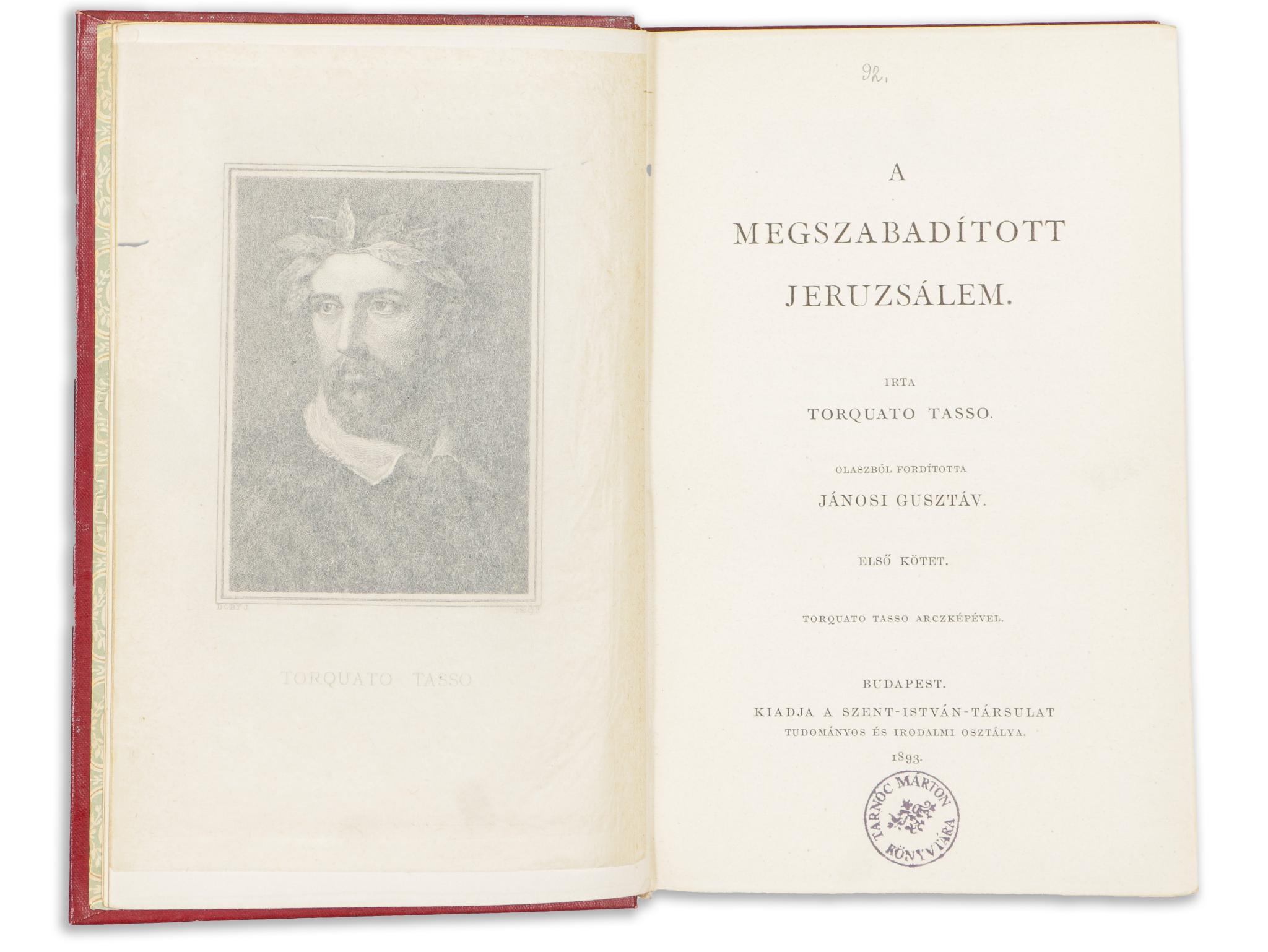 1t. (Tasso portréja, Doby Jenő rézmetszete) + XXV + [7] p. + 326 p.; 331 p.