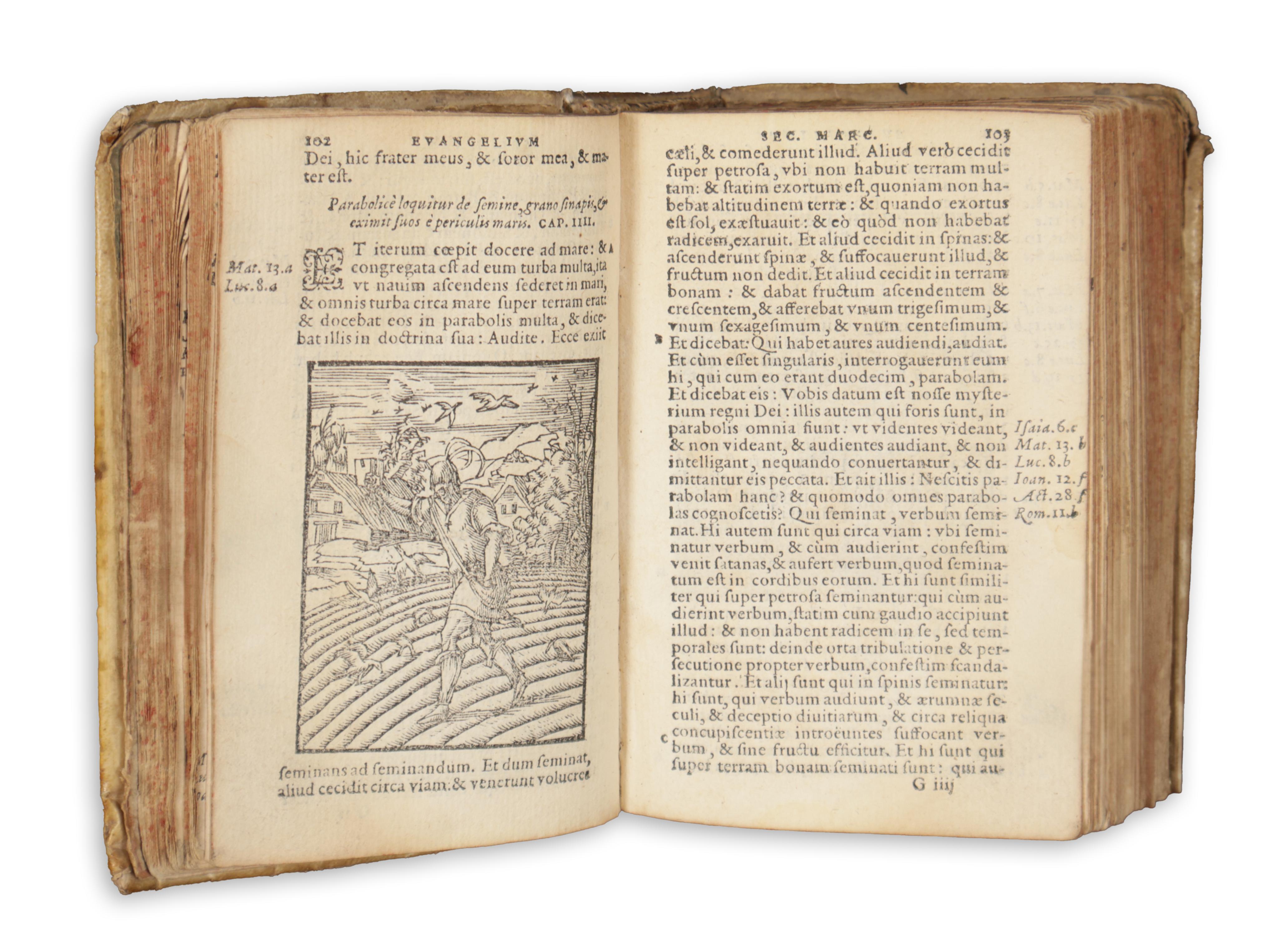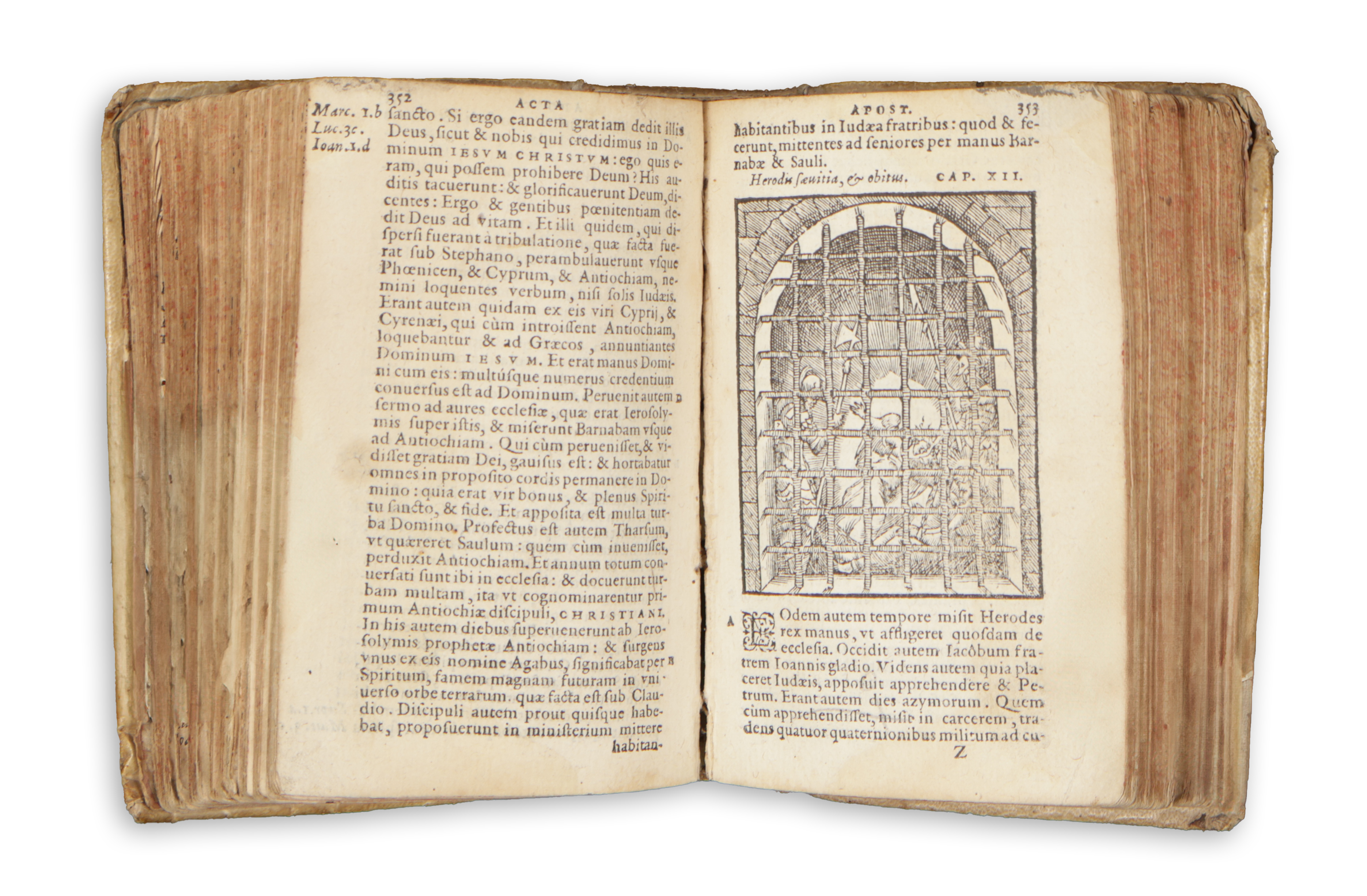 144 szövegközti fametszetes illusztrációval. Nagyon ritka párizsi kiadás, mely a Jean de Tournes által sokszor kiadott lyoni ujtestamentumot imitálja, 144 szövegközti fametszetes illusztrációval, melyek az említett lyoni Újtestamentum Bernard Salomon által metszett illusztrációi után készüktek
