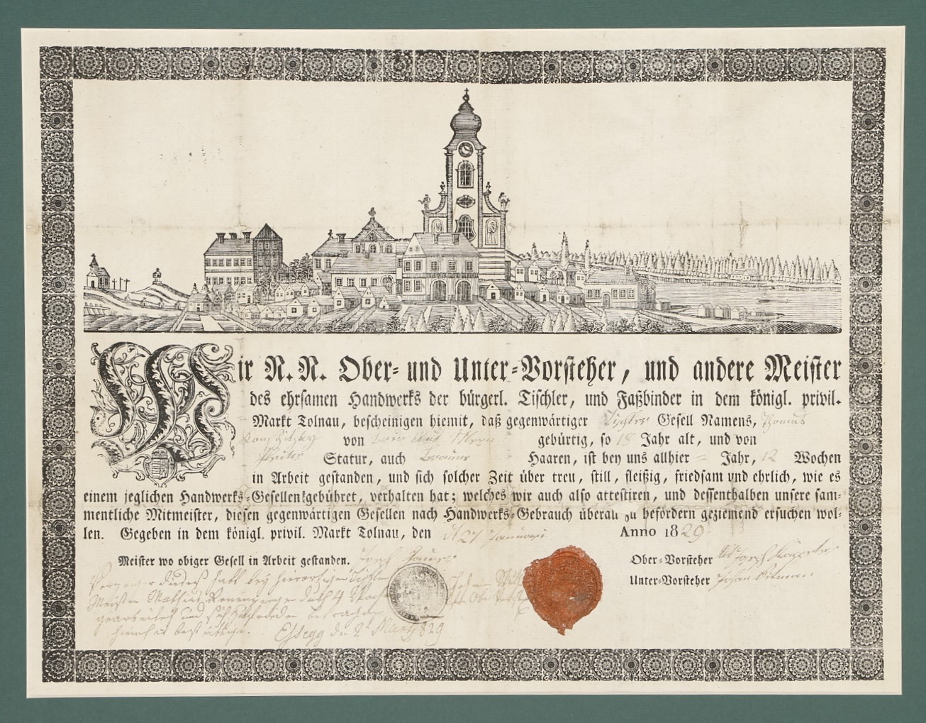 Tolna mezőváros asztalos-kádár mesterlevele 1829. márc. 2. Fametszet jelzés nélkül, a megfelelő helyeken tintával kitöltve, viaszpecséttel és az elöljárók aláírásaival. A látképen a város távlati képe, középen a Nagyboldogasszony templom (1773), a baloldali iniciáléban az ország címere.