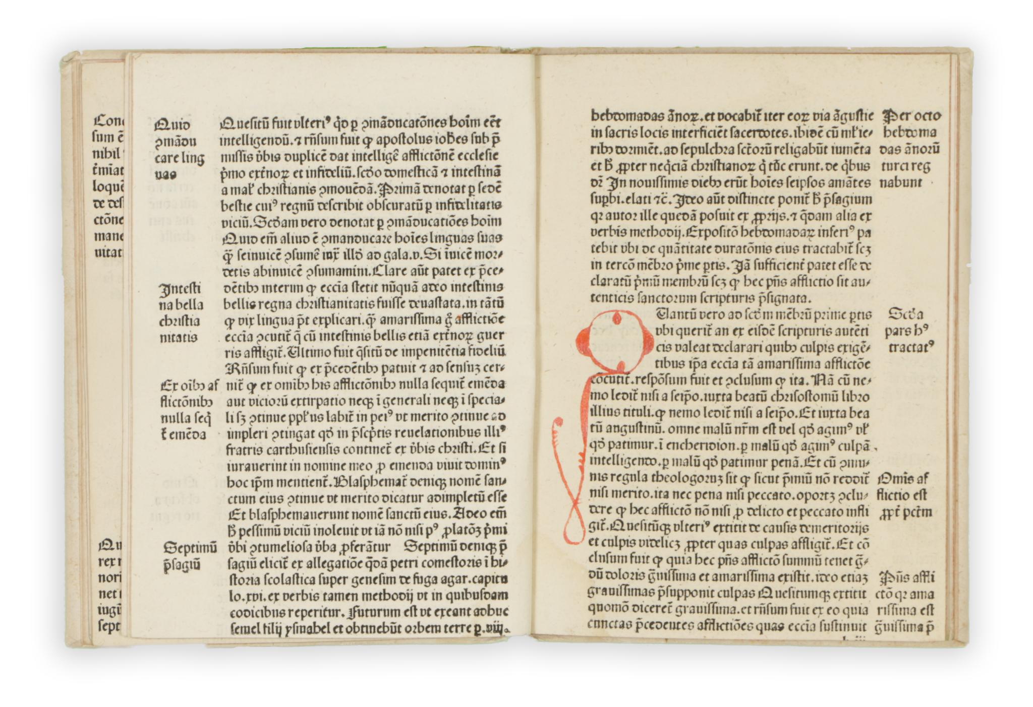 Gótikus betűkkel szedett 32 soros oldalak, az első (üres) levélen vélhetően 19. századi, piros tintával írt bejegyzés: „Incunabula 5. sz. (1481)”. Erősen körülvágott példány, az ívjelzés több oldalon is levágva, a széleken, a hivatkozásoknál is hiányzik néhány betű. Alul, a kötésnél folyamatosan halványuló ázásnyommal, összességében azonban szép, tiszta példány. Későbbi kartonkötésben, az elülső kötéstáblán címfelirat.