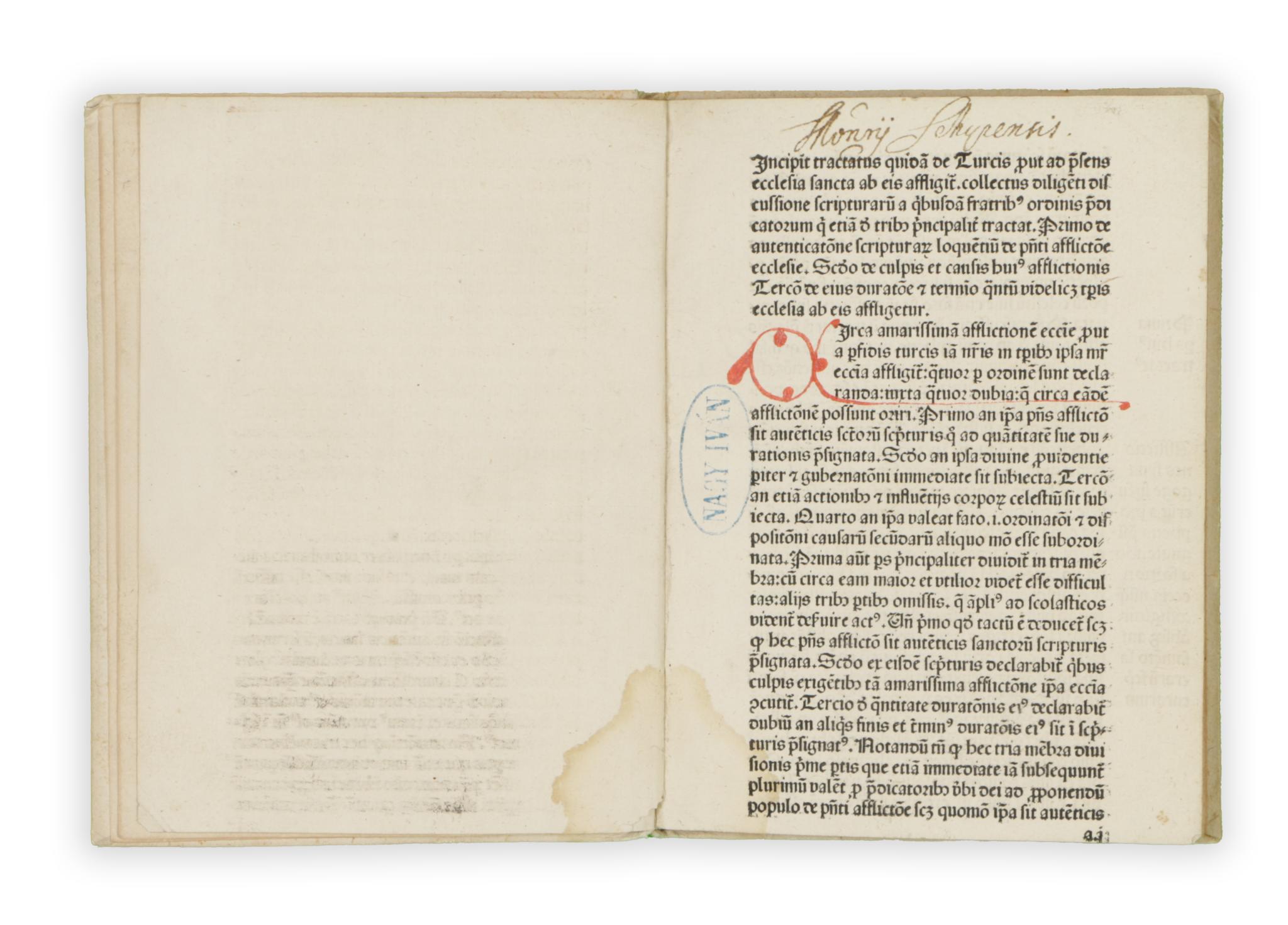 According to its title, this treatise on the Turks does not so much detail the internal conditions of the Ottoman Empire – as seen in the work of Georgius de Hungaria, who summarized his twenty years of Ottoman captivity in a book published that same year – but fundamentally seeks answers to the correlation between the decline of the Christian world and the rise of the Ottomans. It explains the political conditions of the second half of the 15th century largely through examples and prophecies taken from Holy Scripture.