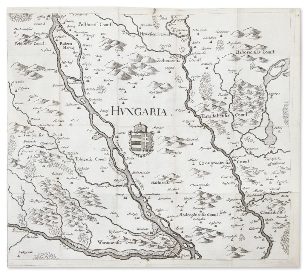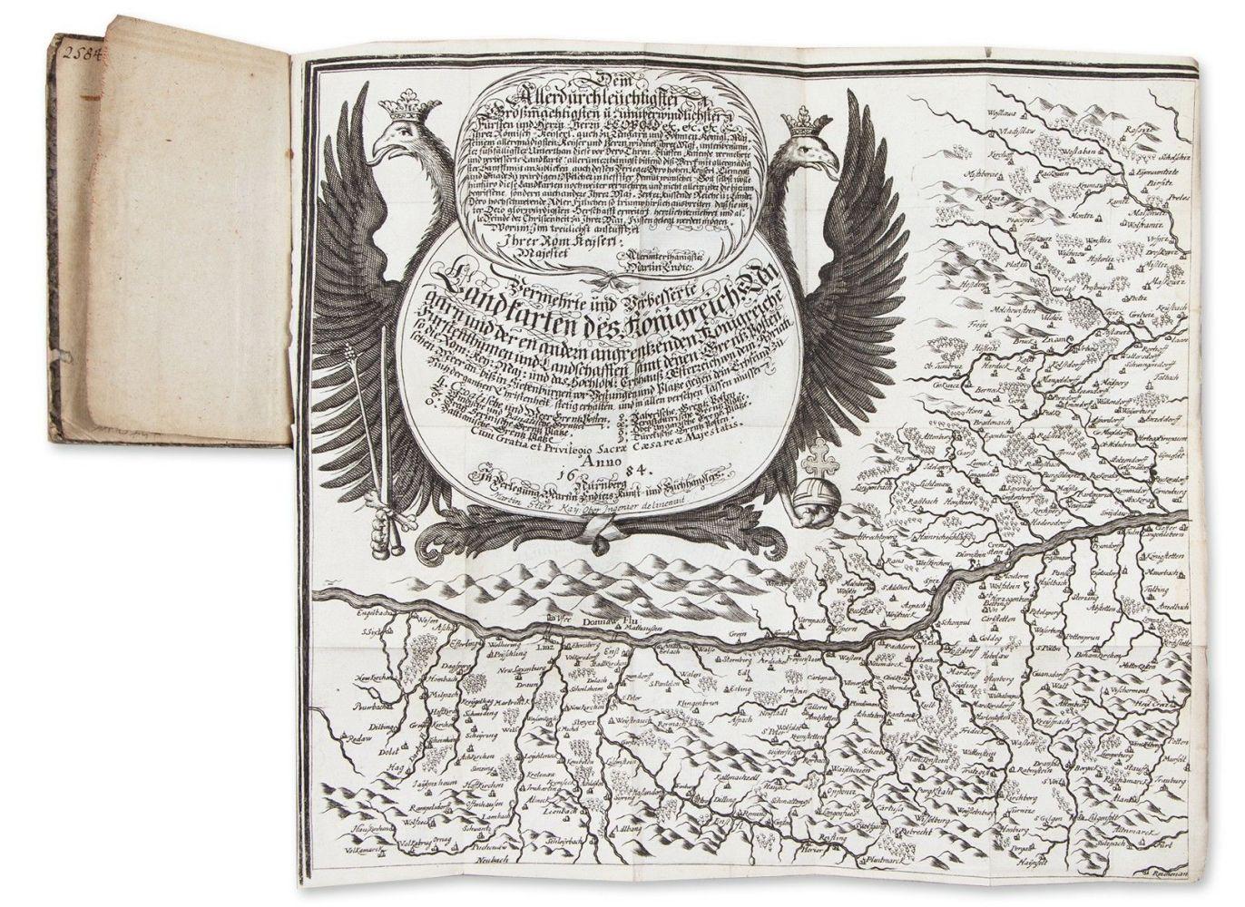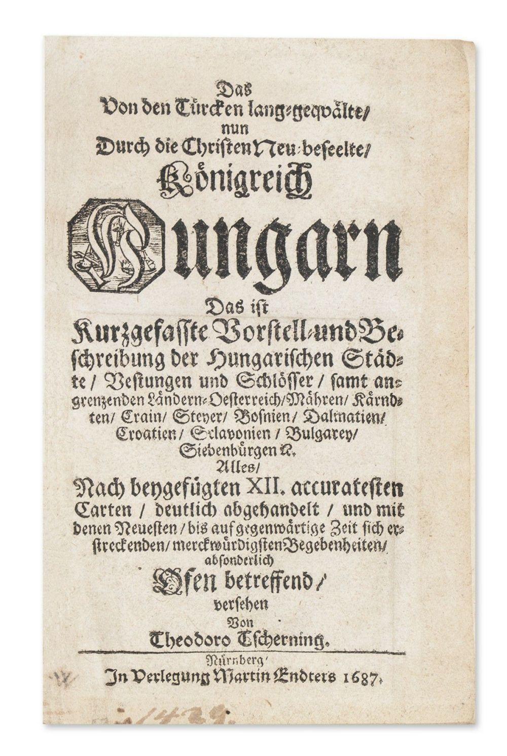 ... , das ist Kurzgefasste Vorstell- und Beschreibung der hungarischen Städte, Vestungen, und Schlösser, samt angrenzenden Ländern - Oesterreich, Mähren, Kärndten, Crain, Steyer, Bosnien, Dalmatien, Croatien, Sclavonien, Bulgarien, Siebenbürgen, etc. alles, nach beygefügten XII. accuratesten Carten, deutlich abgehandelt, und mit denen neuesten, bis auf gegenwärtige Zeit sich erstreckenden merkwürdigsten Begebenheiten, absonderlich Ofen betreffend, versehen - - 1687 Nürnberg in Verlegung Martin Endters 12 szelvényre szelt és táblaként beragasztott rézm. térképlap + [4] + 464 + [22]p. A Martin Stier által készített "Vermehrte und verbesserte Landkarten des Königreich Ungarn" 4. kiadása 12 szelvényre szelt térképpel (Szántai: Stier 2d) jelent meg, amely a török hódoltságból frissen szabadult országot mutatja be. A ritka országtrékép kereskedelemben előforduló példányokban rendszerint teljesen vagy részben hiányzik. Későbbi papírkötésben.