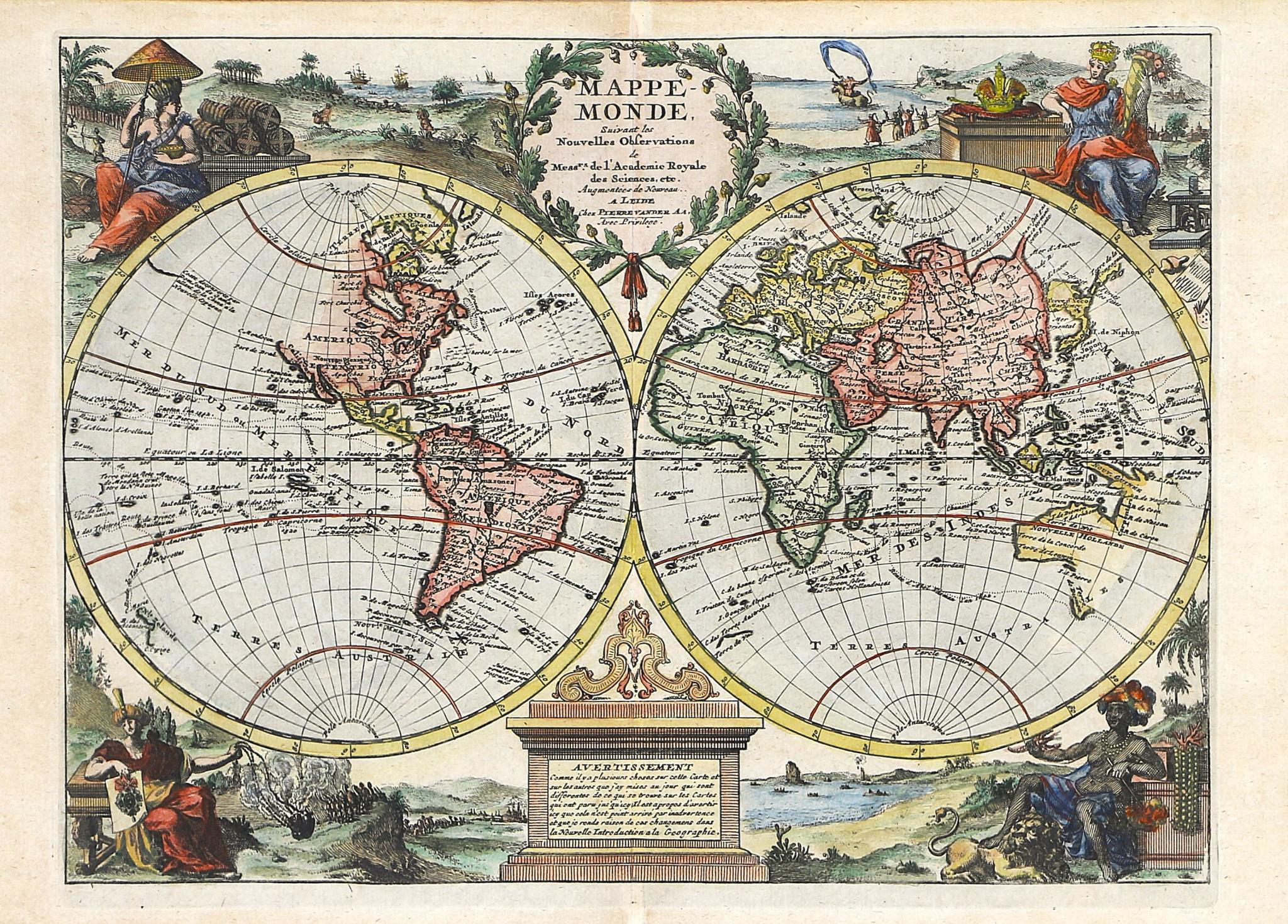 1710 LeidenDíszes, kettős félgömb alakú világtérkép, amelyet a négy kontinens allegorikus ábrázolásai díszítenek, a sarkokban női alakok, valamint a bennszülött jelenetek európaizált ábrázolásai mellett.