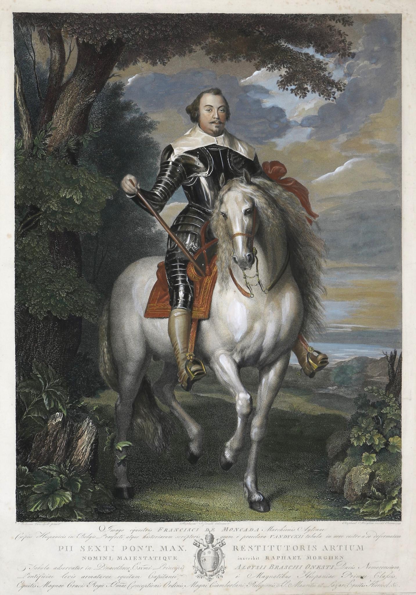 1793Eredeti színezésű metszet Anthony van Dyck híres műve, a Equestrian Portrait of Francisco de Moncada című olajfestmény alapján. Az 1634-ben festett eredeti Francisco de Moncadát ábrázolja, aki egy évig volt a spanyol Hollandia kormányzója. (Ez a régió magában foglalta a mai Belgium és Luxemburg nagy részét, valamint Észak-Franciaország, Dél-Hollandia és Nyugat-Németország egyes részeit, fővárosa pedig Brüsszel volt. A terület védelméért a flandriai hadsereg volt felelős.) A kép egy 1634-ben megrendelt portrépár része volt, nem sokkal azután, hogy Moncada londoni tartózkodását követően visszatért szülőföldjére, Flandriába. Az eredeti festmény a párizsi Louvre-ban található (INV. 1240).