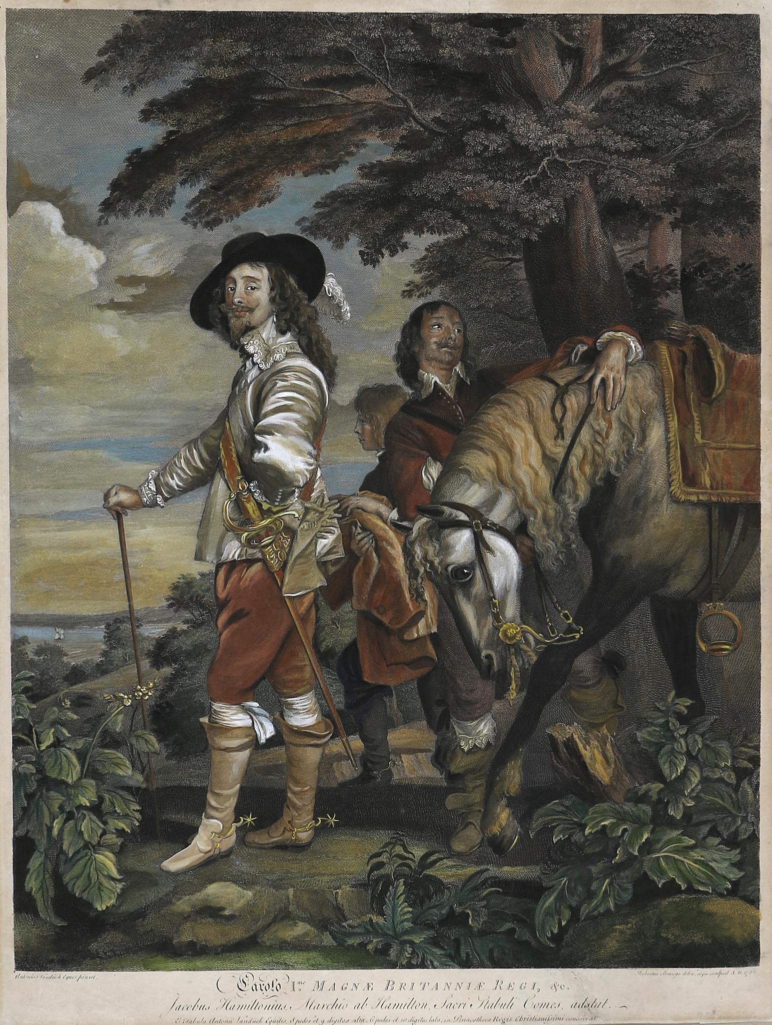 I. Károlyt királyként ábrázoló, kézzel színezett metszet. Egész alakos, hosszú hajú, szakállas, karimás kalapos, csipkegallérral, kabátban és nadrágban, jobb vállán átvetett szíjjal. A képen csípőre tett bal kézzel, jobb kezét botra támasztva áll, egy földesúr és Hamilton márkija kíséretében, aki a király lovát ápolja. Jobbra egy nagy fa áll. Alatta latin felirattal.