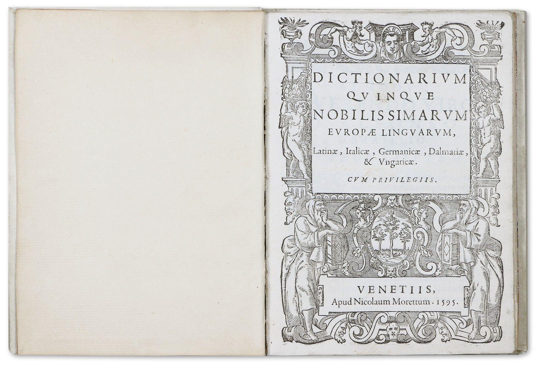 Five-language dictionary with Croatian and Hungarian interpretations. The author (Antun Vrančić, Antonius Wrancius Sibenicensis Dalmata) dedicated the work to Alfonso Carillo, Jesuit advisor to Prince Sigismund Báthori. The main part of the work contains 5400 Latin words and their equivalents in five columns. This is followed by a Dalmatian-Hungarian "Vocabula", then the Ten Commandments, the Creed, the Lord's Prayer and the Hail Mary in five languages. In the dedication, Verancsic writes that he collected the material many years before, but in a short time. His main source was Calepinus' dictionary in ten languages. The author (1551-1617) studied in Padua with the support of his uncle, Archbishop Antal of Esztergom. He had also been captain of the castle of Veszprém and court councilor. He was ordained a priest in 1594, and from 1598 he was bishop of Csanád. After his retirement, he moved to Venice, where he published his work on architecture, technology, and military engineering, Machinae Novae (1616), which has since become world famous. The Dictionarium is one of the earliest, extremely rare, and precious pieces of Hungarian and Croatian dictionary literature. With decorative woodcut title page. A later vellum-bound bibliophile copy, gilt on spine, with two gilt title vignettes and marbled endpapers.