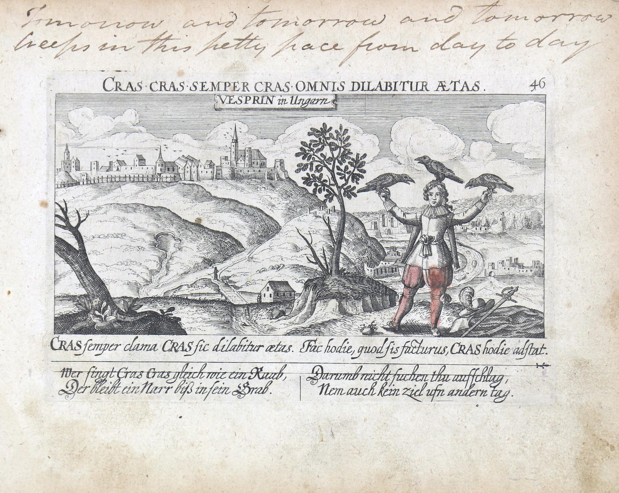 Cím az illusztráció felső részén, közepén. A venduta felett az "Cras cras semper cras omnis dilabitur aetas." mottóval. A kép alatt egy erkölcsi mondás olvasható latin és német nyelven. Gyönyörű összkép allegorikus ábrázolással az előtérben.