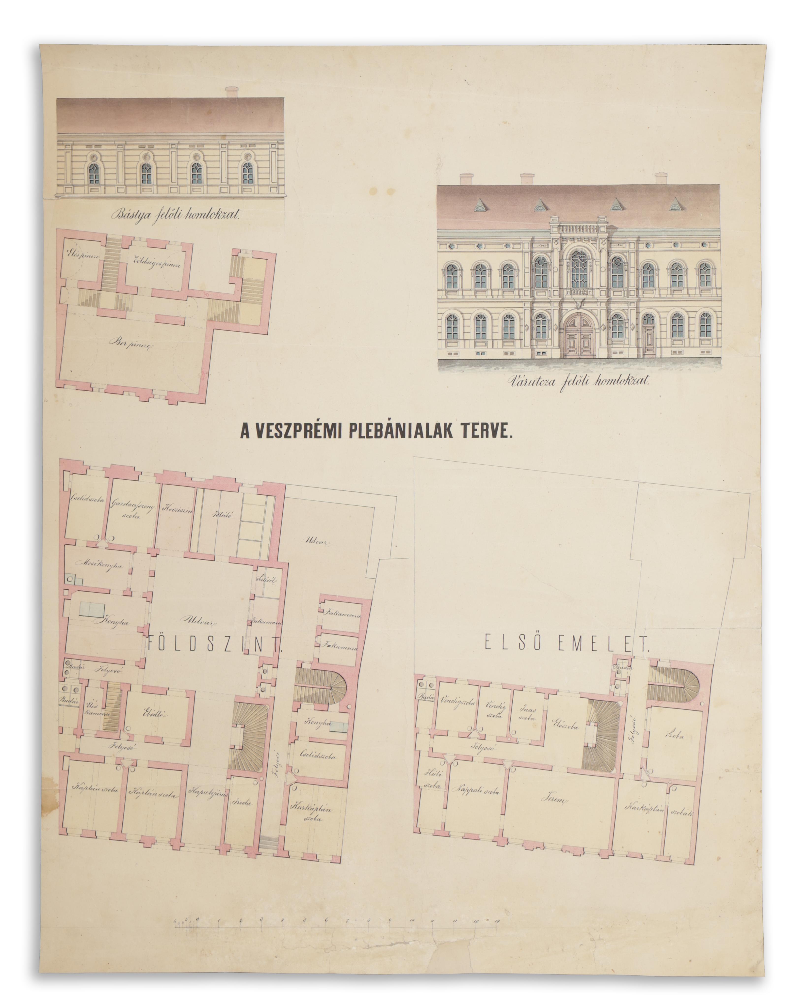 A veszprémi Szent Mihály Főszékesegyház plébániájáról készített öt, részletes vázlat letisztult, klasszicista stílusú városi palotát mutat. A Bástya és a Vár utca felőli homlokzatot, valamint a földszinti, az első emeleti és a pince metszetét. A helyiségek nevei használat szerint pontosan feltüntetve. A mai állapot a tervrajztól jelentősen eltér. Az ablakkiosztások megmaradtak, de az emeleti sor félköríves záródású ablakait egyenesre cserélték. A főhomlokzat kapu feletti kiemelését is leegyszerűsítették, nagyobb ablakát a többivel megegyezőre igazították A tervrajzon sem szignó, se évszám nem szerepel. A jelenlegi épületen 1907 és 1910 között Aigner Sándor tervei szerint historizáló stílusban végeztek átalakítást. Aigner (1854-1912) építészete a középkor formakincsét használta fel, tervezői tevékenysége összefonódott műemlékrestaurátori tevékenységével is. De a tervlap stílusa, az elnevezések régies szövege – budár-illemhelyiség –  ennél korábbit sejtet.