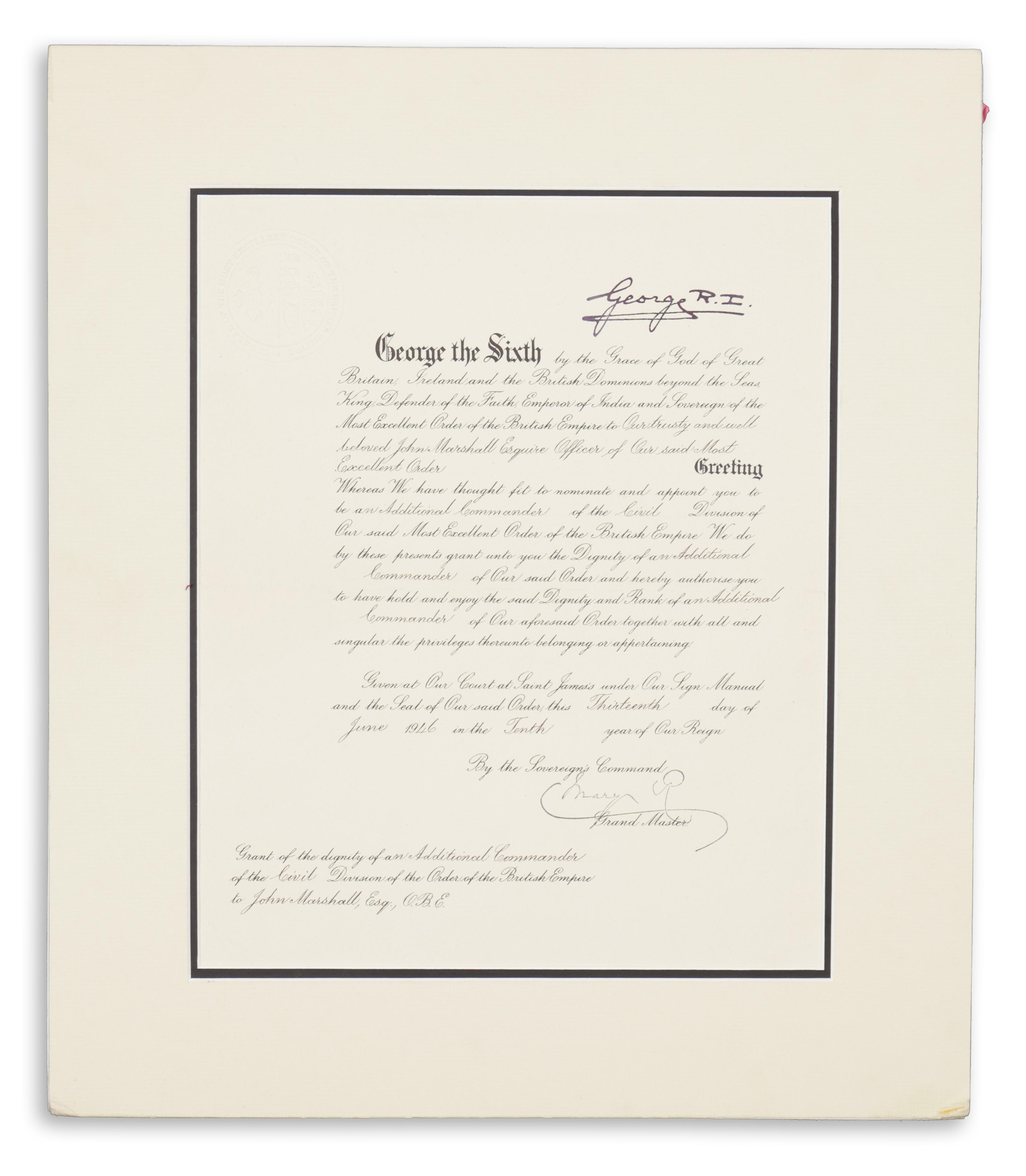 This particular document was presented to an Officer of the British Empire, John Marshall, issued June 10th 1946.