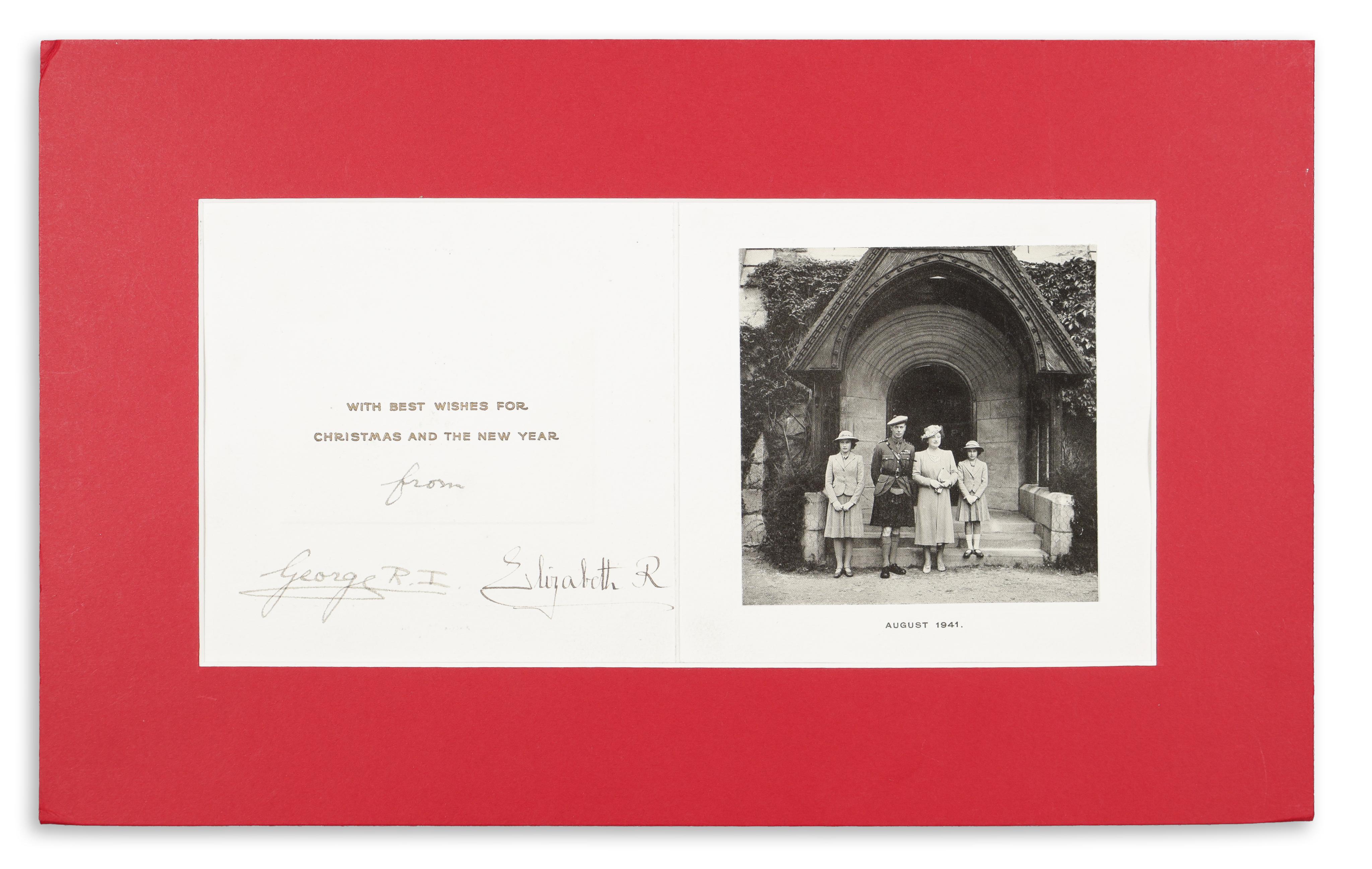 A Christmas card singed by King George VI and Queen Elizabeth, with the black and white photograph of the Royal family depicting King George (1895-1952), Queen Elizabeth (1900-2002), and their daughters Princess Elizabeth and Princess Margaret Rose. Crathie Kirk, Crathie, Scotland, August 1941. The front has gilt royal crown embossed, inside printed message: "Best wishes for Christmas and the New Year". Rear is printed with "Raphael Tuck & Sons Ltd. Fine Art Publisher to their Majesties the King and the Queen ..."