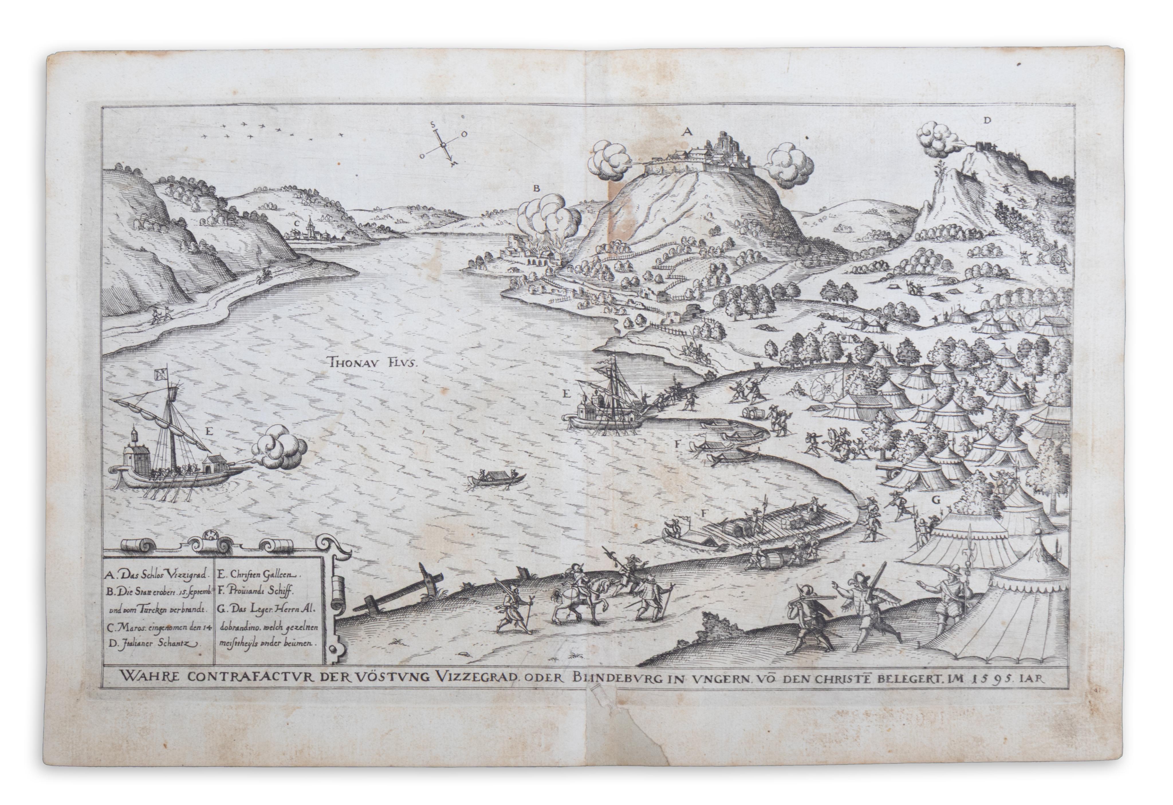 Copperplate engraving, paper. Sheet size: 29x19 cm. Published: Hieronymus Ortelius in his work "Chronologia oder historische Beschreibung...". In his large-scale work, Ortelius lists the locations of the outstanding clashes from a Hungarian perspective in the fight against the Turks from 1395 onwards, in a total of 58 copperplate engravings and etchings. Slightly stained copy.