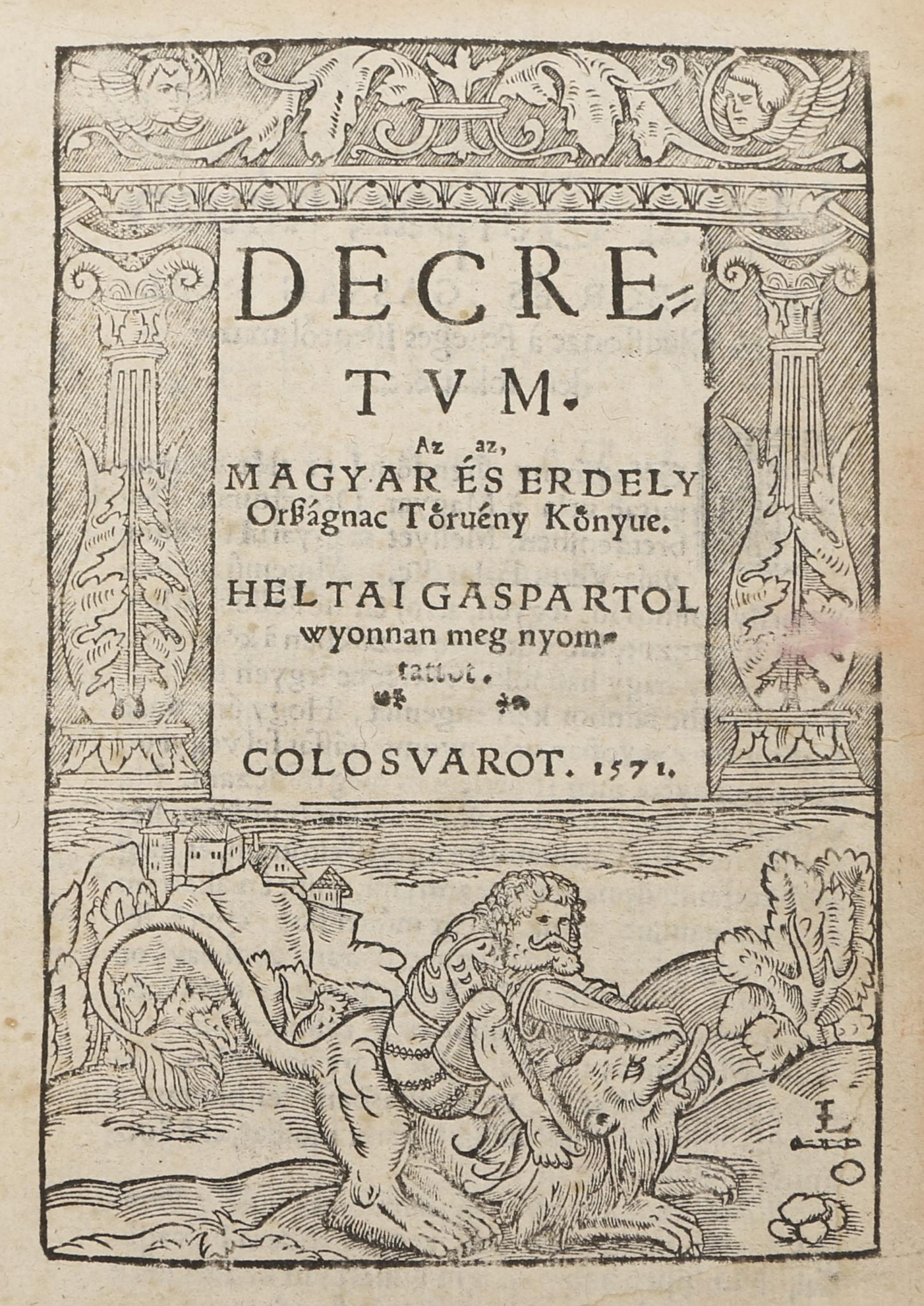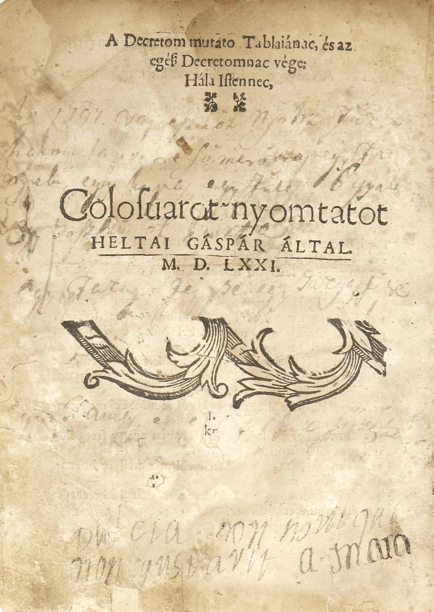 Decretum. Az az Magyar és Erdely Országnac Törvény Könyve. Heltai Gáspártól wyonnan meg nyomtattatott.