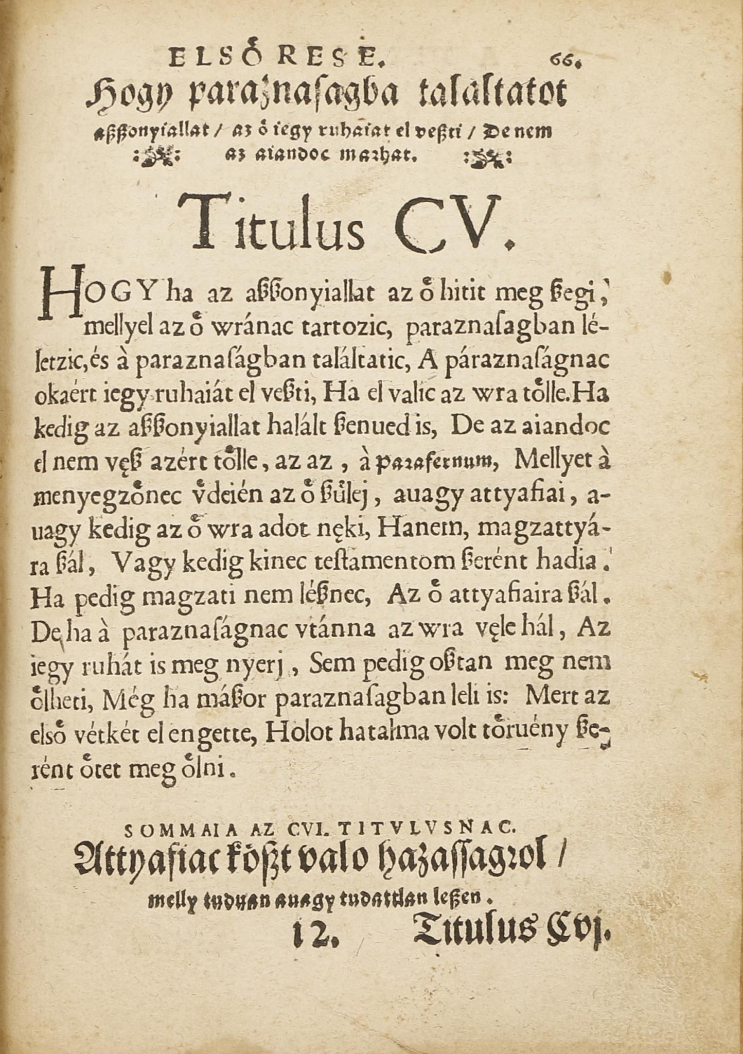 A magyarországi szokásjog kézikönyve, Werbőczi Hármaskönyvének második magyar nyelvű kiadása. Werbőczi István az országgyűlés sürgetésére és II. Ulászló király felkérésére foglalta írásba a magyarországi jogot, majd azt az 1514-es országgyűlésen bemutatta. Törvényerőre nem emelkedett műve (kivéve Erdélyt, ahol is a fejedelmek országos törvényként esküdtek rá), mégis 1848-ig általánosan használt kézikönyv szerepét töltötte be. Először 1517-ben jelent meg Bécsben, latin nyelven. Ezt követte ugyanott még két kiadás (1545, 1561), magyar nyelven elsőként Debrecenben látott napvilágot 1565-ben, Weres Balázs fordításában. Az itt szereplő, 1571-es kiadásánál Heltai a fordítást némileg átdolgozta, itt szerepel először a címben Erdély neve is (a latin nyelvű kiadások címlapjai később sem említik). A díszcímlap fametszetét (Herakles megöli a nemeai oroszlánt) Heltai először az 1554-es Tinódi-kiadásában alkalmazta. A Tripartitum többi XVI. századi kiadásához hasonlóan rendkívül ritka, becses darab.