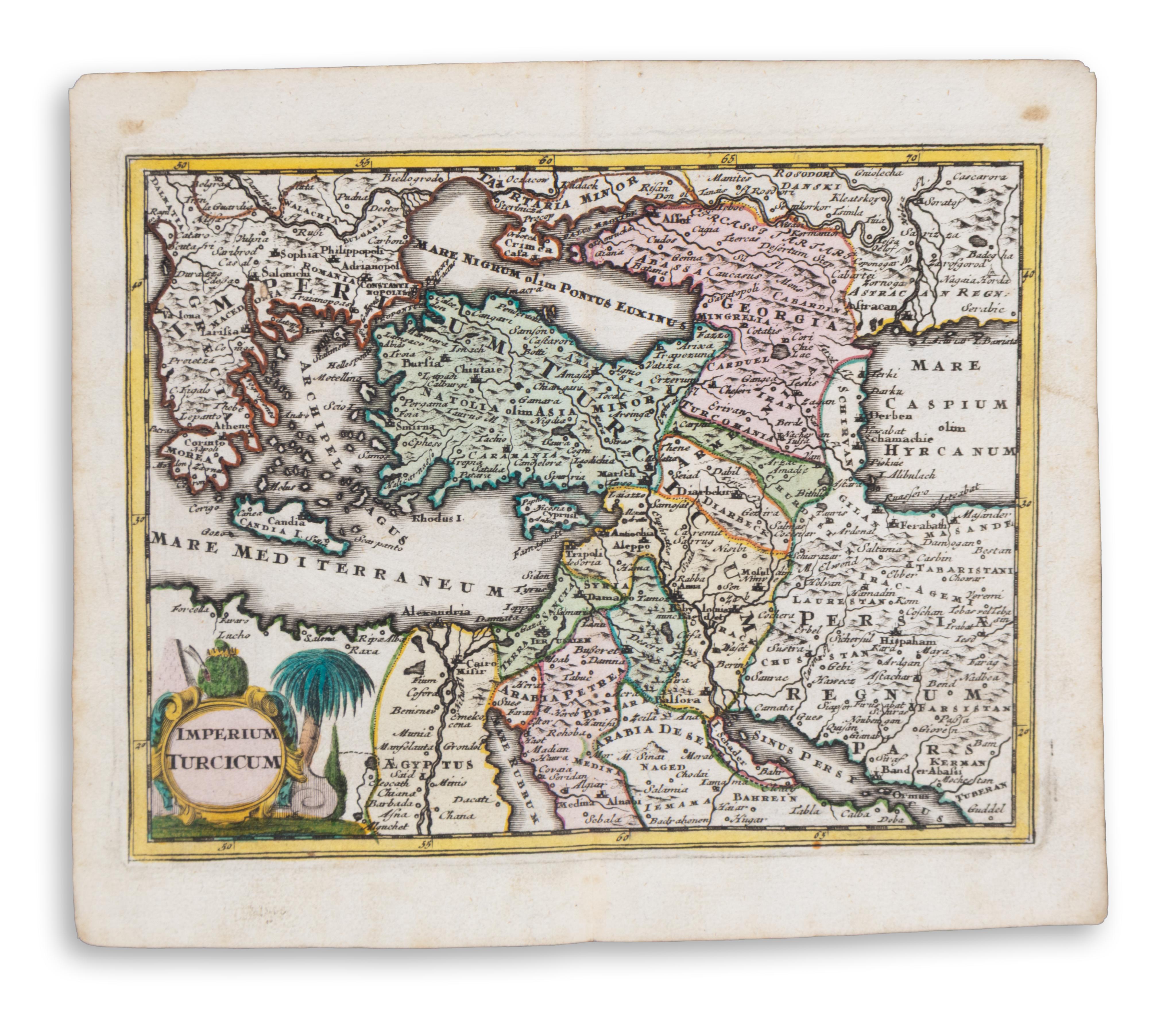Kis-Ázsia, Törökország, Görögország, Ciprus, Szentföld, Egyiptom, Perzsia. Korabeli színezésű rézmetszet. Lapméret: 20,5×18 cm. Megkímélt állapotban, balra lent szép kartus.