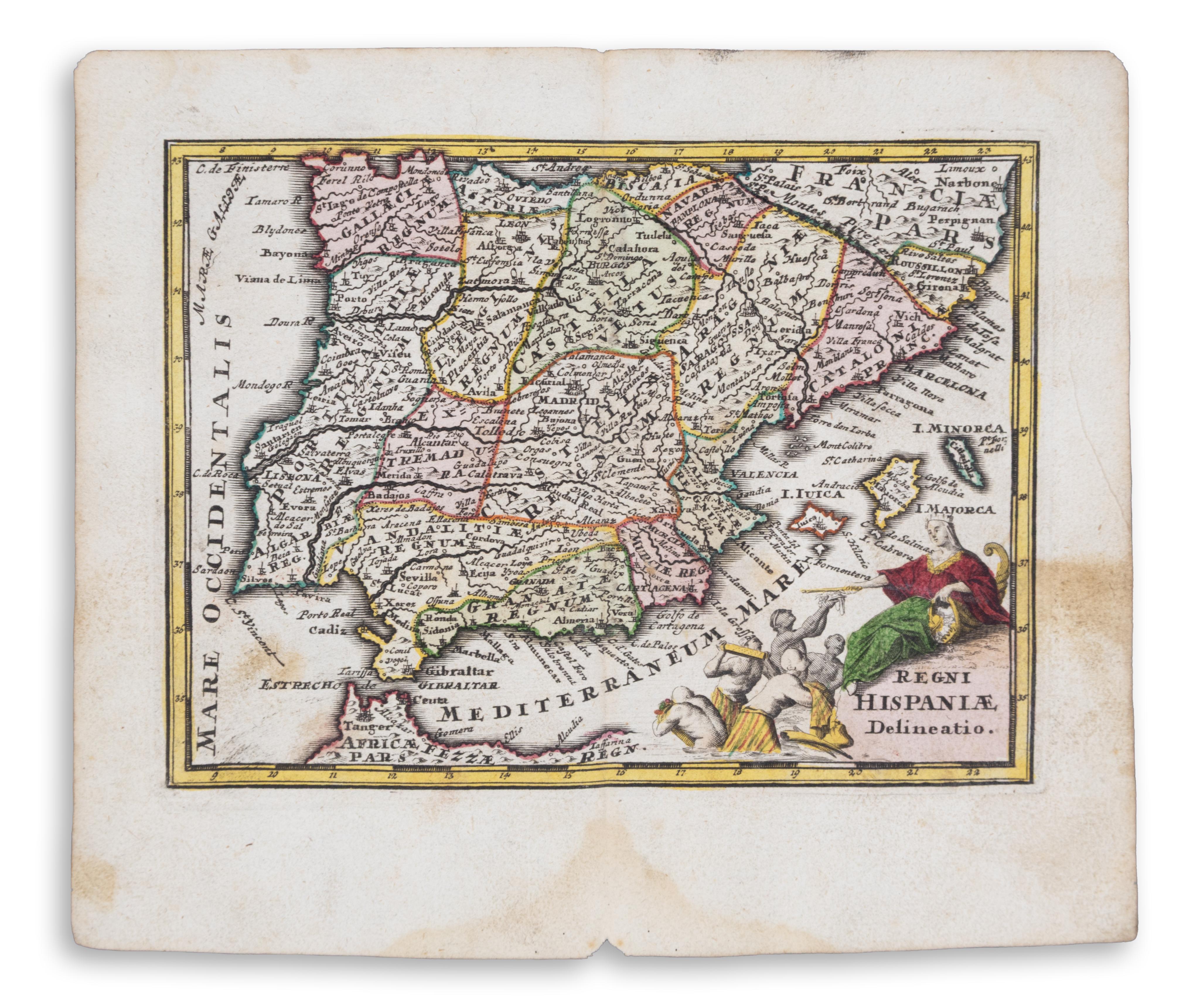 Nuremberg [Nürnberg], 1729Ibériai- félsziget. Spanyolország, Portugália, Észak-Afrika, Gibraltár, Mallorca, Ibiza. Korabeli színezésű rézmetszet. Lapméret: 20,5×18 cm. Megkímélt állapotban, jobb sarkában szép kartus.