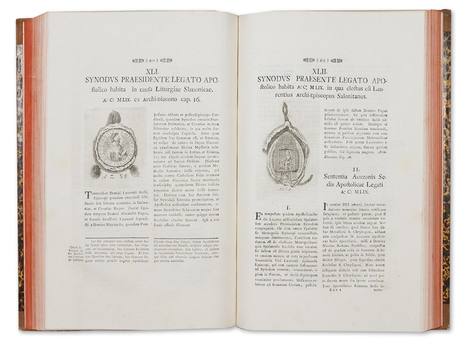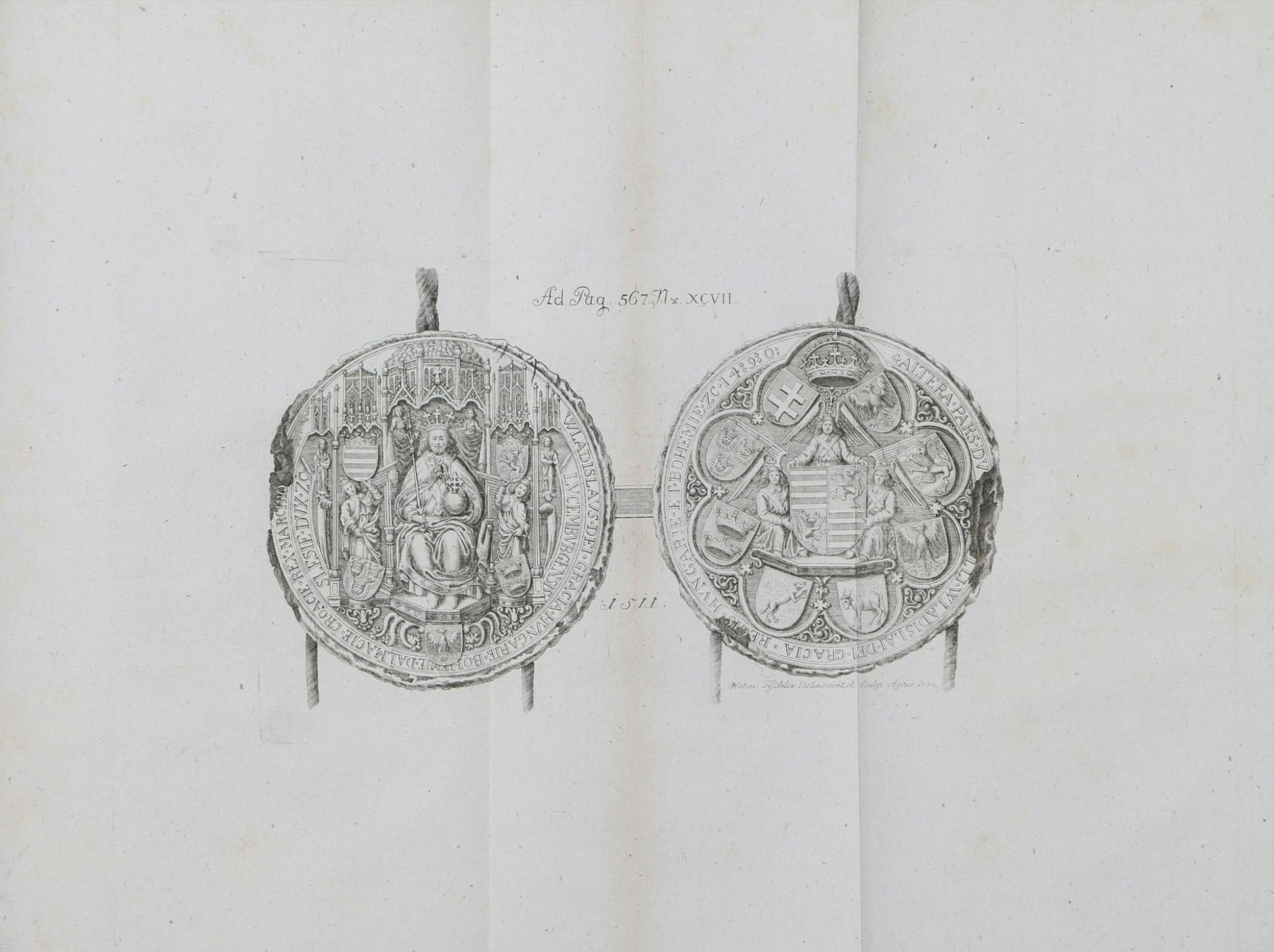 1785 Alba-Carolinae – Claudiopoli Typis EpiscopalibusA szerző erdélyi püspök volt. Számos történeti munka fűződik nevéhez, emellett könyvtárat (Batthyaneum) és csillagvizsgálót is alapított. Tervezte egy erdélyi tudós társaság létrehozását is. Tételünk Batthyány Ignác fő műve, amelyet fontos pecséttani és heraldikai forrásként használt az utókor. Az első kötet még Nagykárolyban jelent meg a szerző magánkiadásában, a további kötetek mintegy negyven évvel később, már Kolozsvárott, az érseki nyomdában készültek. A teljes sorozat nagyon ritka.