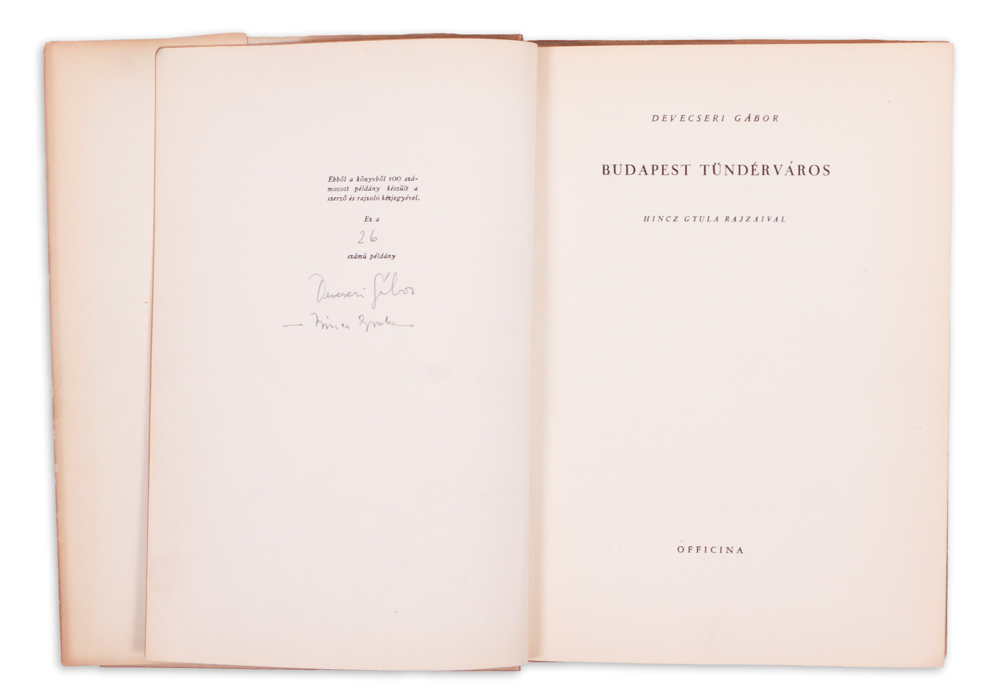 Essays on great Hungarian poets by Hungarian poet and writer Gábor Devecseri accompagned by his own poems. Numbered (26/100) and signed by Devecseri and the illustrator Gyula Hincz.