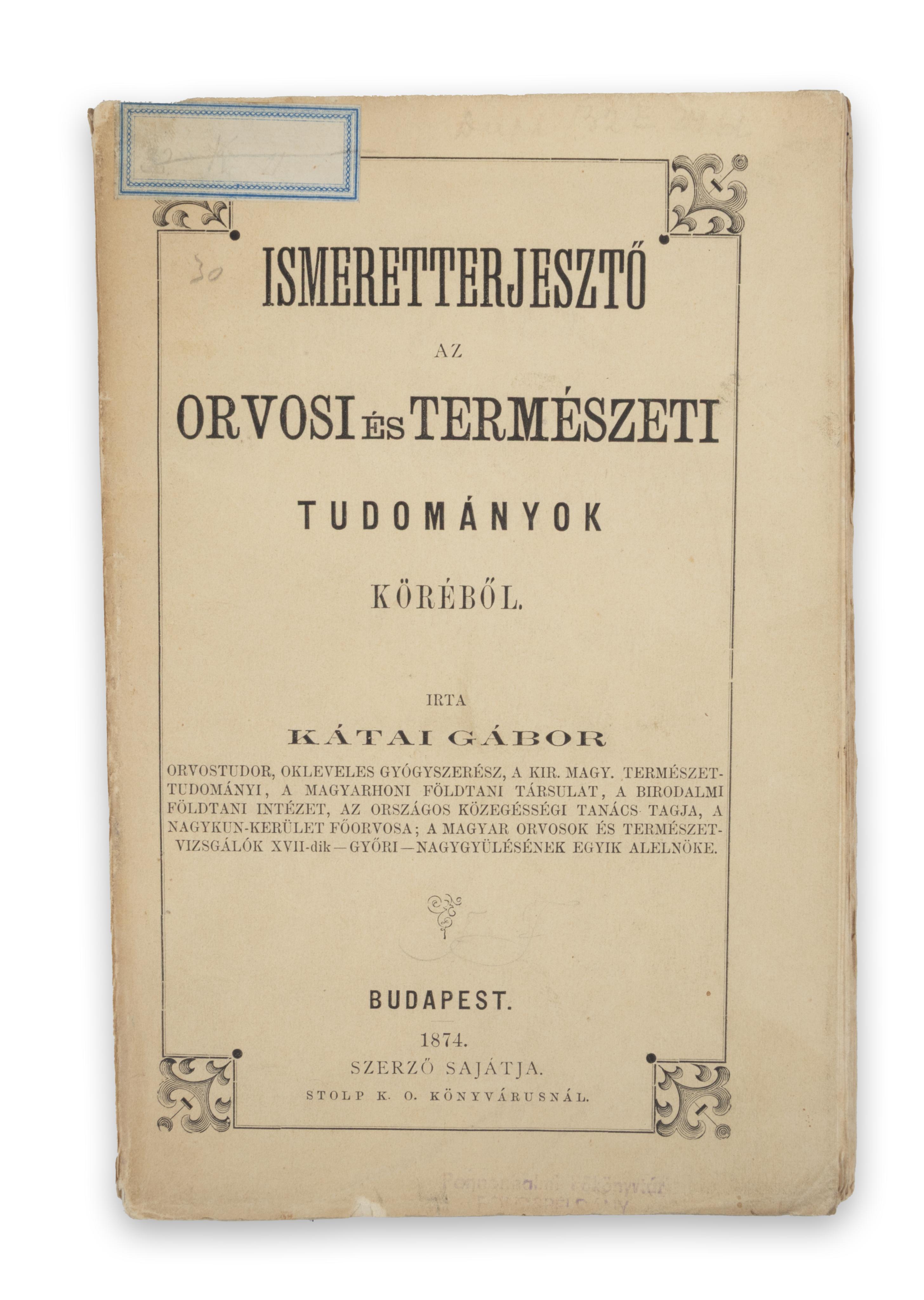 [8] + 232 p. A szerző (1831–1878) orvosdoktor, okleveles gyógyszerész, megyei főorvos.