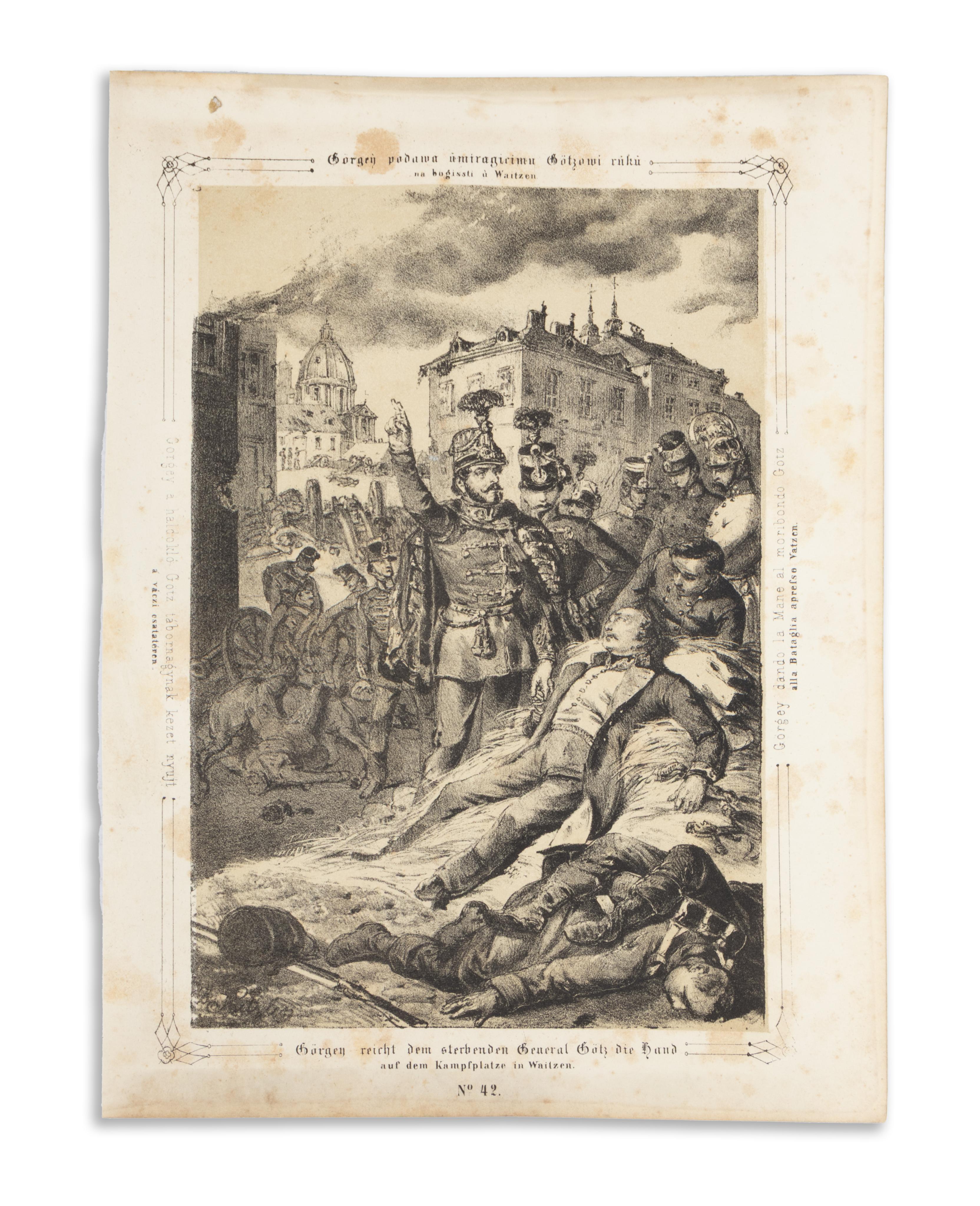 The title is provided in four languages (German, Hungarian, Italian, and Czech) along the four sides of the image. The print is plate number 42 from the second part of Anton Ziegler’s Vaterländische Bilder-Chronik aus der Geschichte des österreichischen Kaiserstaates (Patriotic Pictorial Chronicle from the History of the Austrian Imperial State), published by Benko in Vienna, 1850. This second part contains a description of the 1848–1849 events in Hungary, illustrated with 28 cityscapes (including Buda, Buda and Pest, Bratislava, Prague, Vienna, Belgrade, Trieste, Graz, Innsbruck, etc.), as well as 56 historical genre scenes and battle paintings.