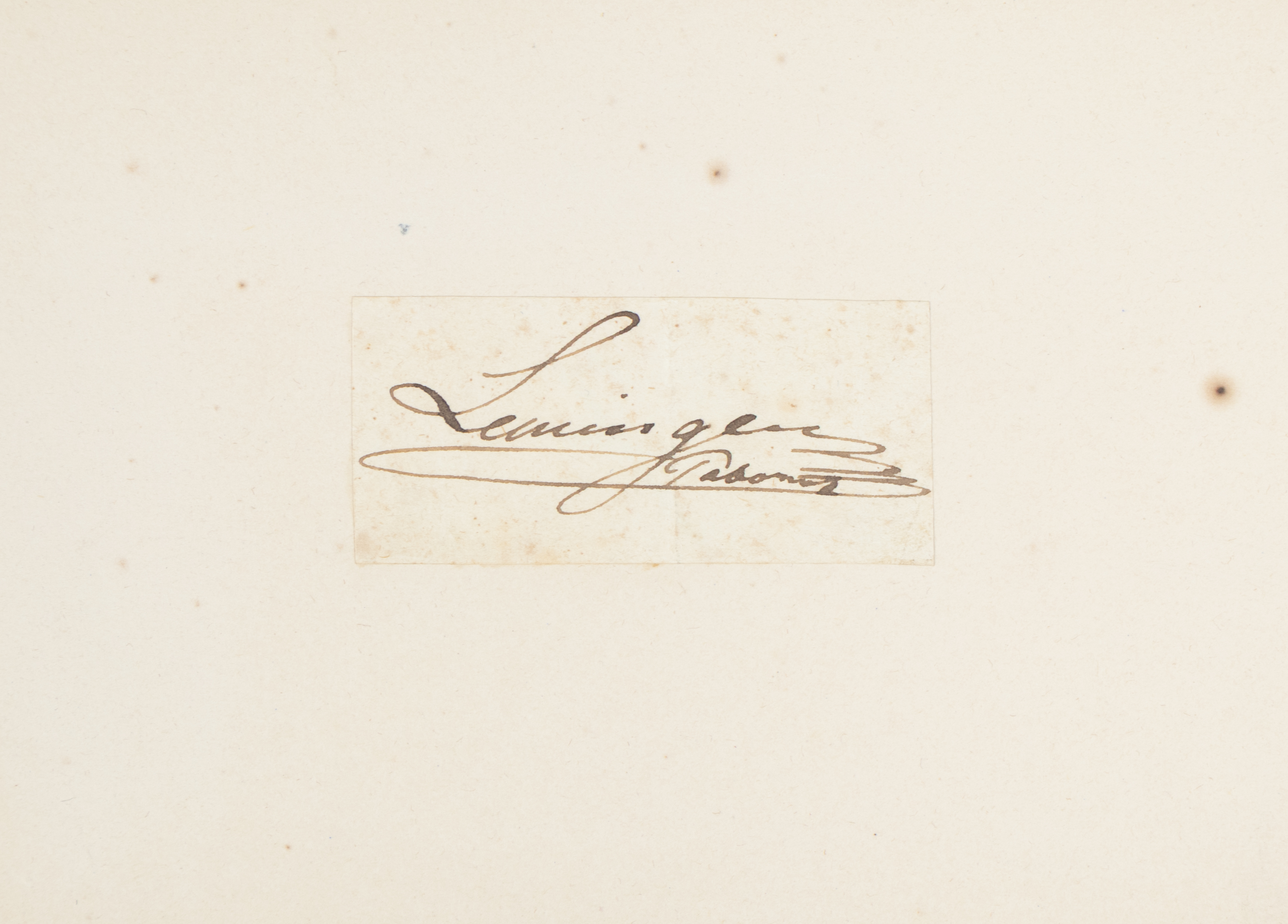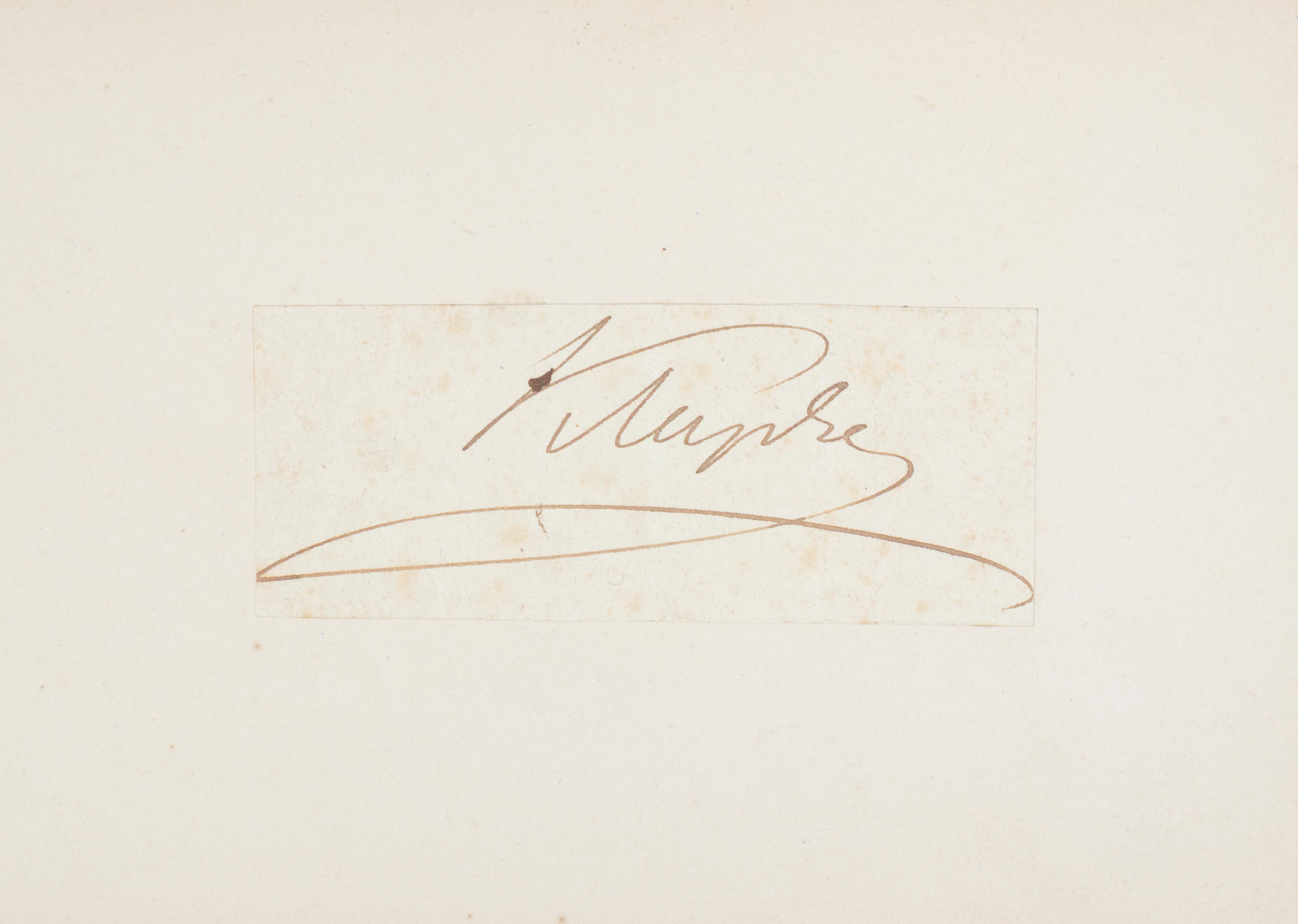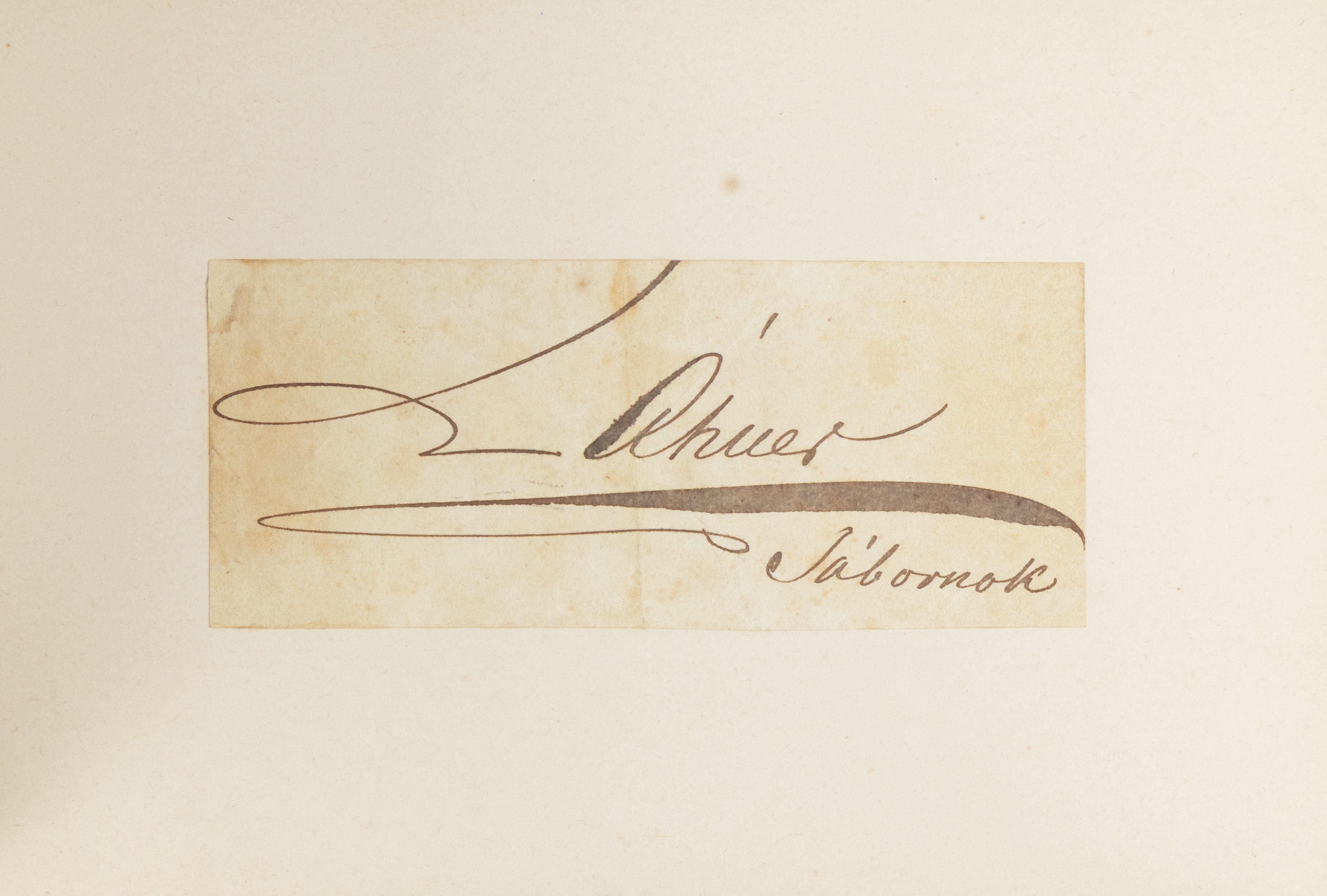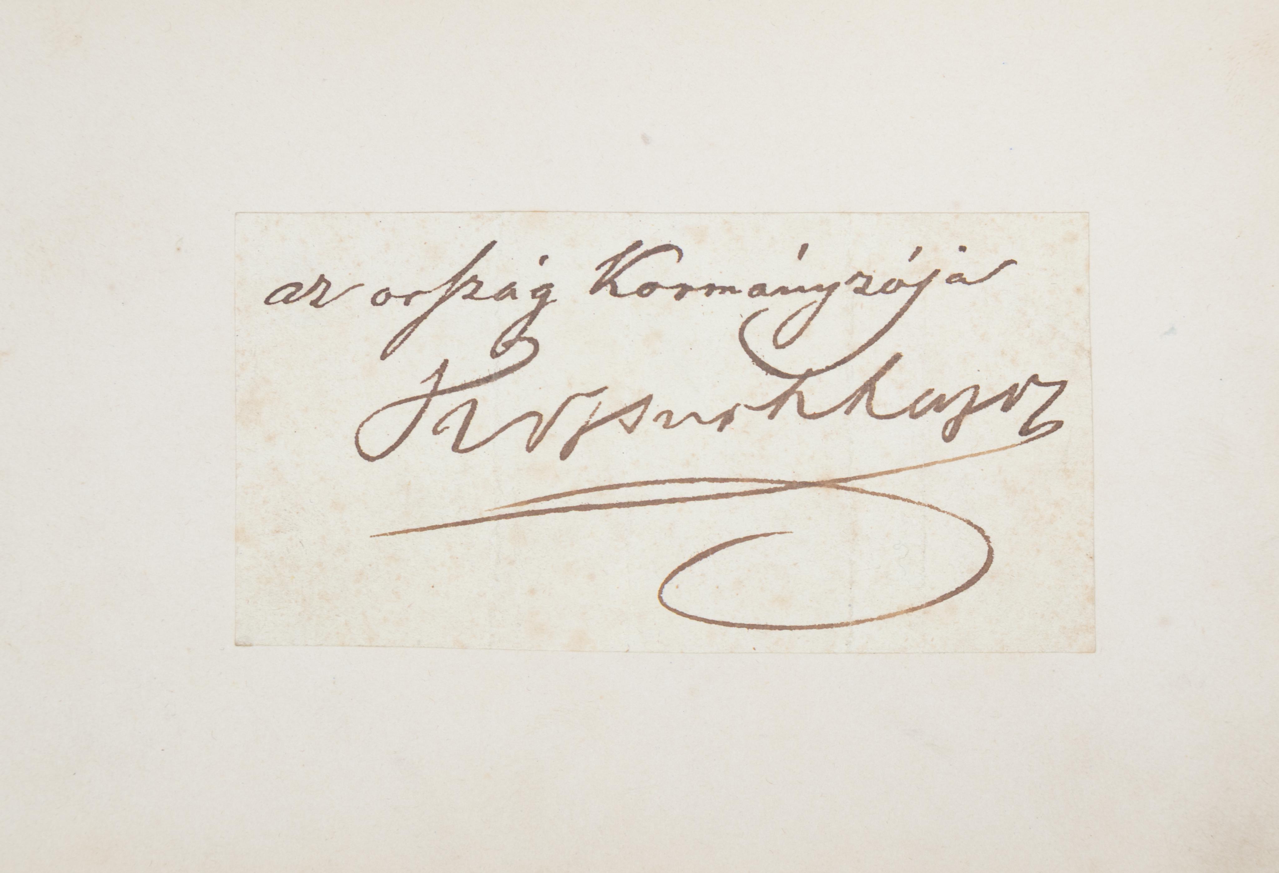 In a contemporary full-cloth, oblong album, the autograph signatures of the following heroes and martyrs, clipped from letters, are pasted: 1. Lajos Kossuth (1802-1894), Governor of the country; 2. Lajos Aulich (1793-1849), Honvéd Major General, Minister of War, Martyr of Arad; 3. József Bem (1794-1850), General; 4. János Damjanich (1804-1849), Honvéd Major General, Martyr of Arad; 5. György Klapka (1820-1892), Honvéd General; 6. György Lahner (1795-1849), Honvéd Major General, Martyr of Arad; 7. Károly Leiningen-Westerburg (1819-1849), Honvéd Major General, Martyr of Arad; 8. József Nagysándor (1803-1849), Honvéd Major General, Martyr of Arad; 9. Ernő Poeltenberg (1808-1849), Honvéd Major General, Martyr of Arad (the writing has faded); 10. Count Károly Vécsey (1803-1849), Honvéd Major General, Martyr of Arad (with the Count's original wax seal, featuring the following circular inscription: "Count Vécsey, General, Commander of the R. Hung. Mobile Army").