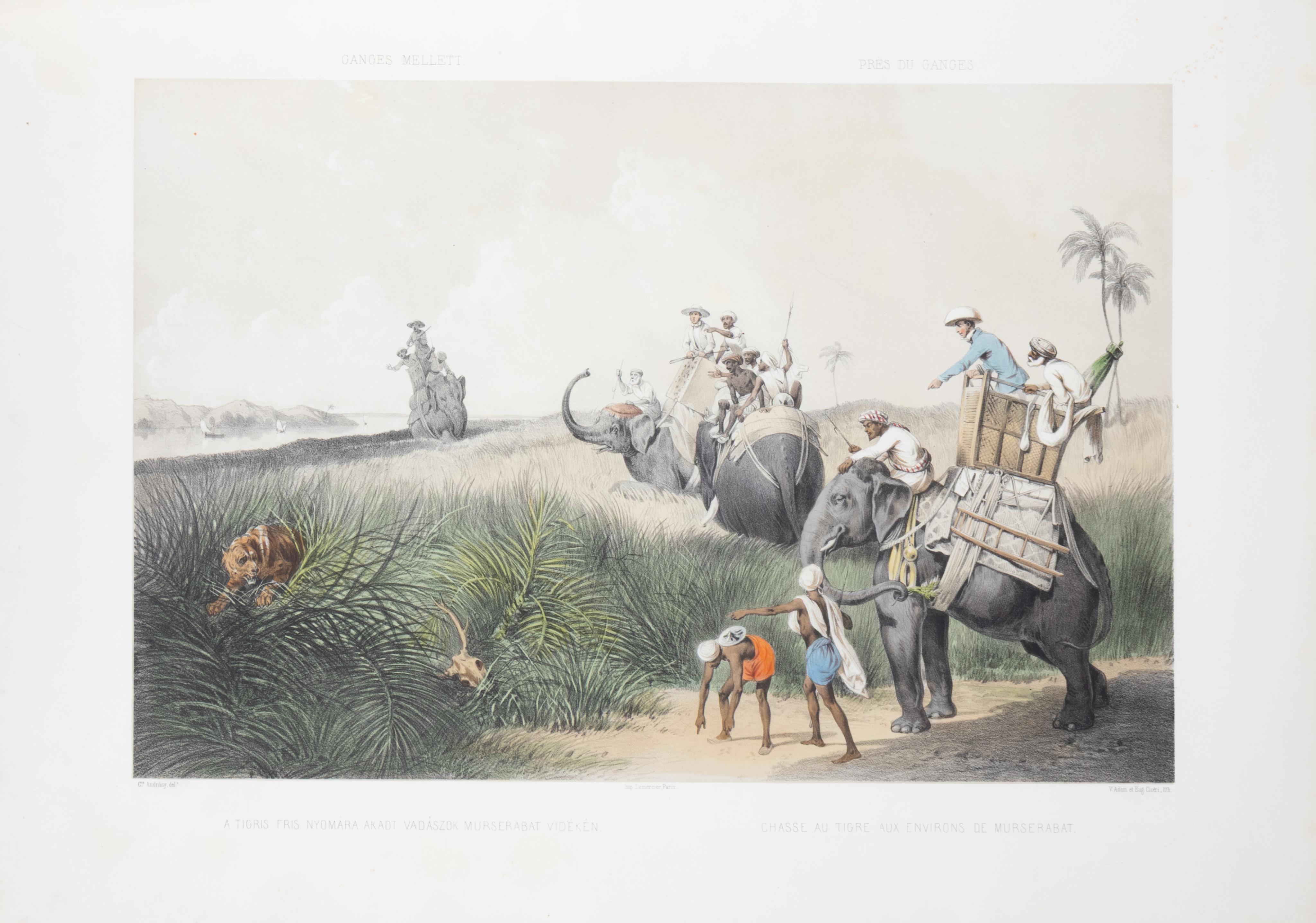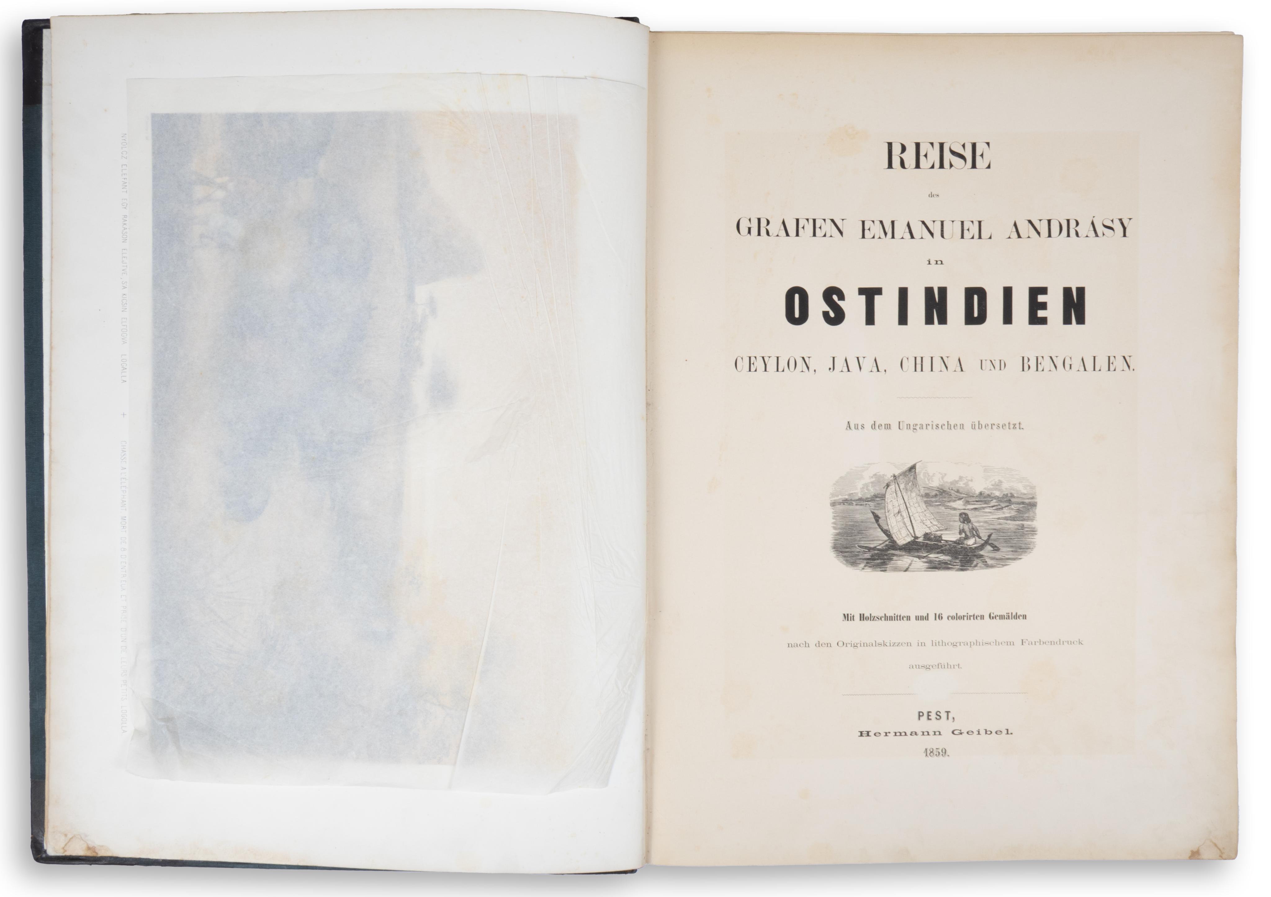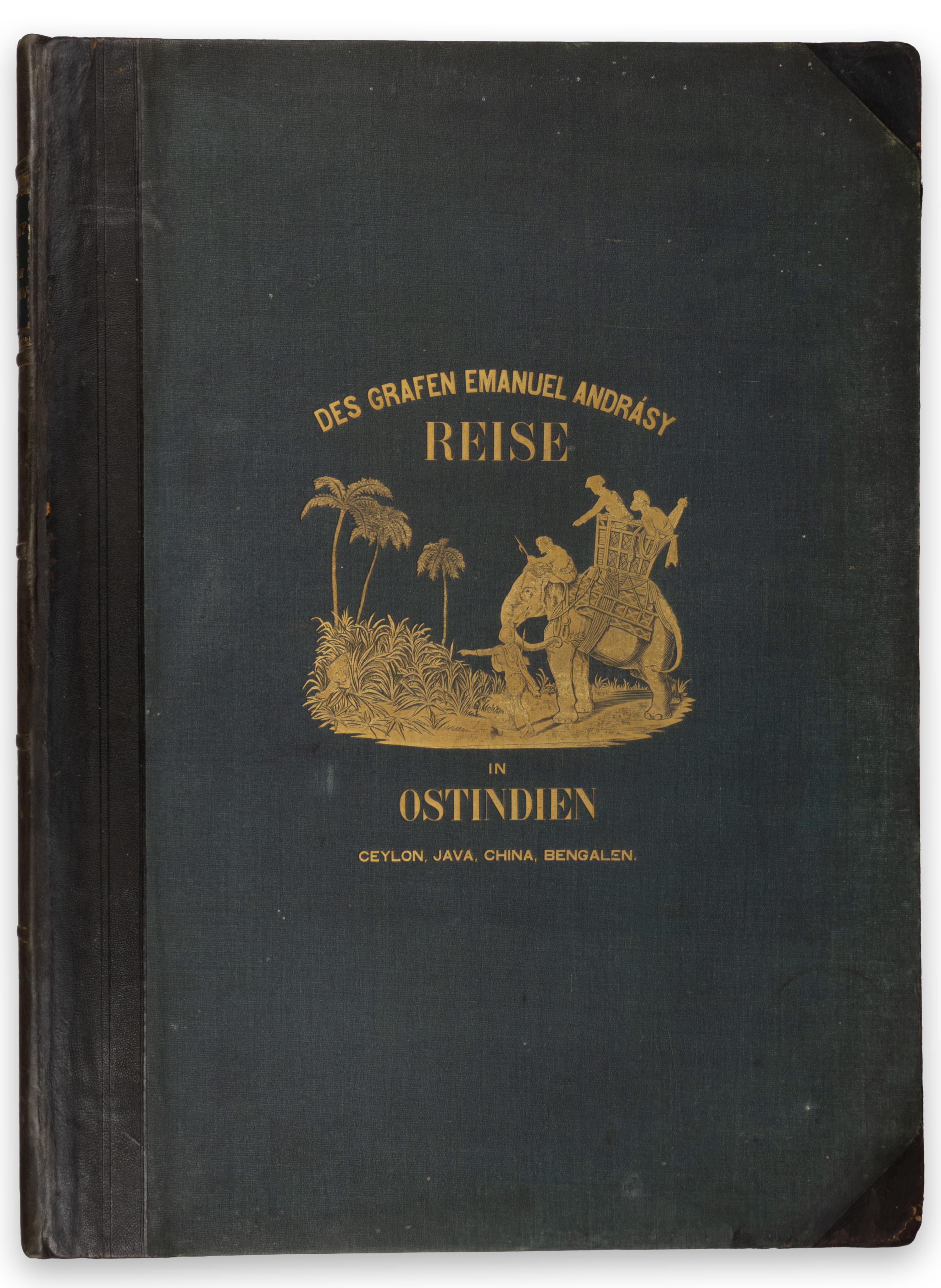 First German edition, and the first illustrated edition; the original Hungarian edition appeared in 1853. Count Manó Andrássy (1821–1891) was forced to leave Hungary after the defeat of the 1848 Revolution, just like his brother, Gyula Andrássy, the future Prime Minister of Hungary. He used his years in exile to embark on an extensive journey through Asia, during which he indulged his passion for big-game hunting. A talented draftsman, he created the original drawings for the splendid lithographs in this volume. The illustrations depict elephant and tiger hunts, as well as street scenes from Hong Kong and Calcutta, dance performances, and further fascinating scenes.