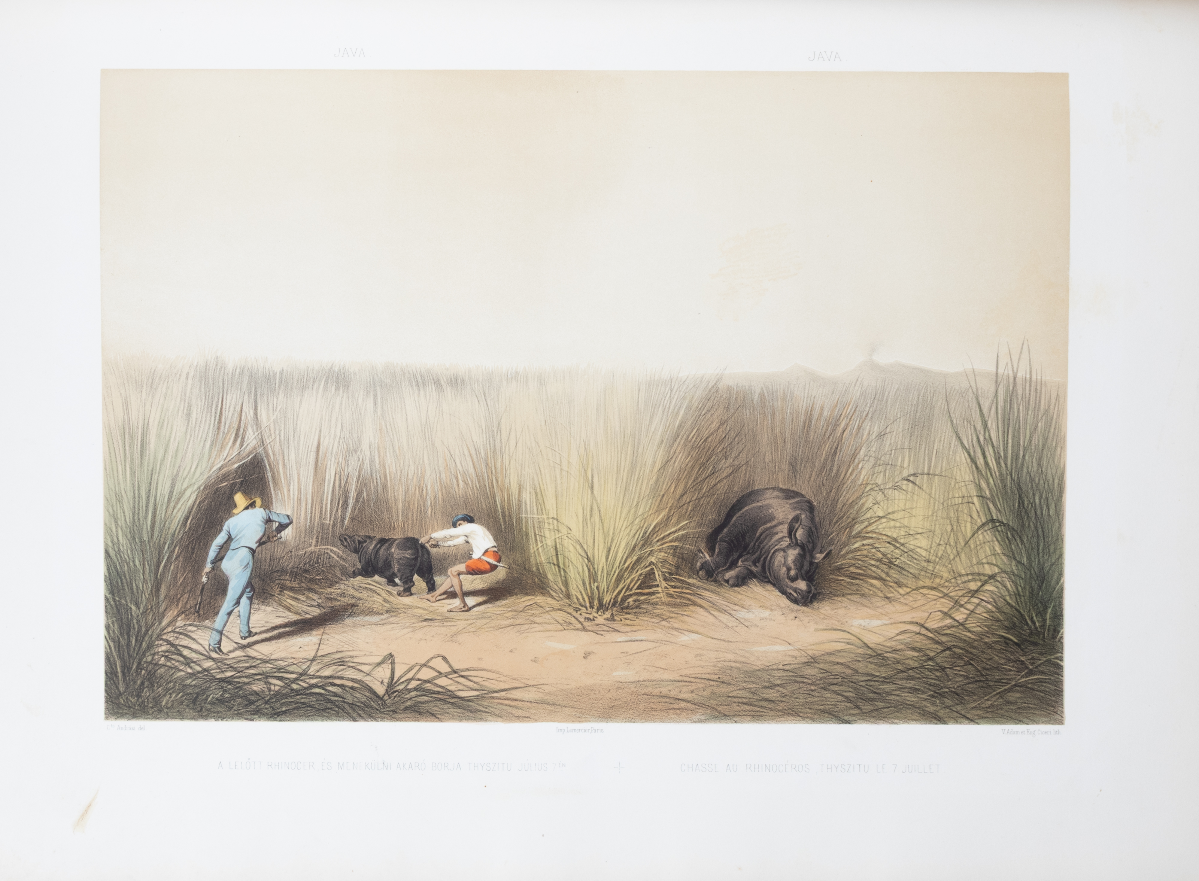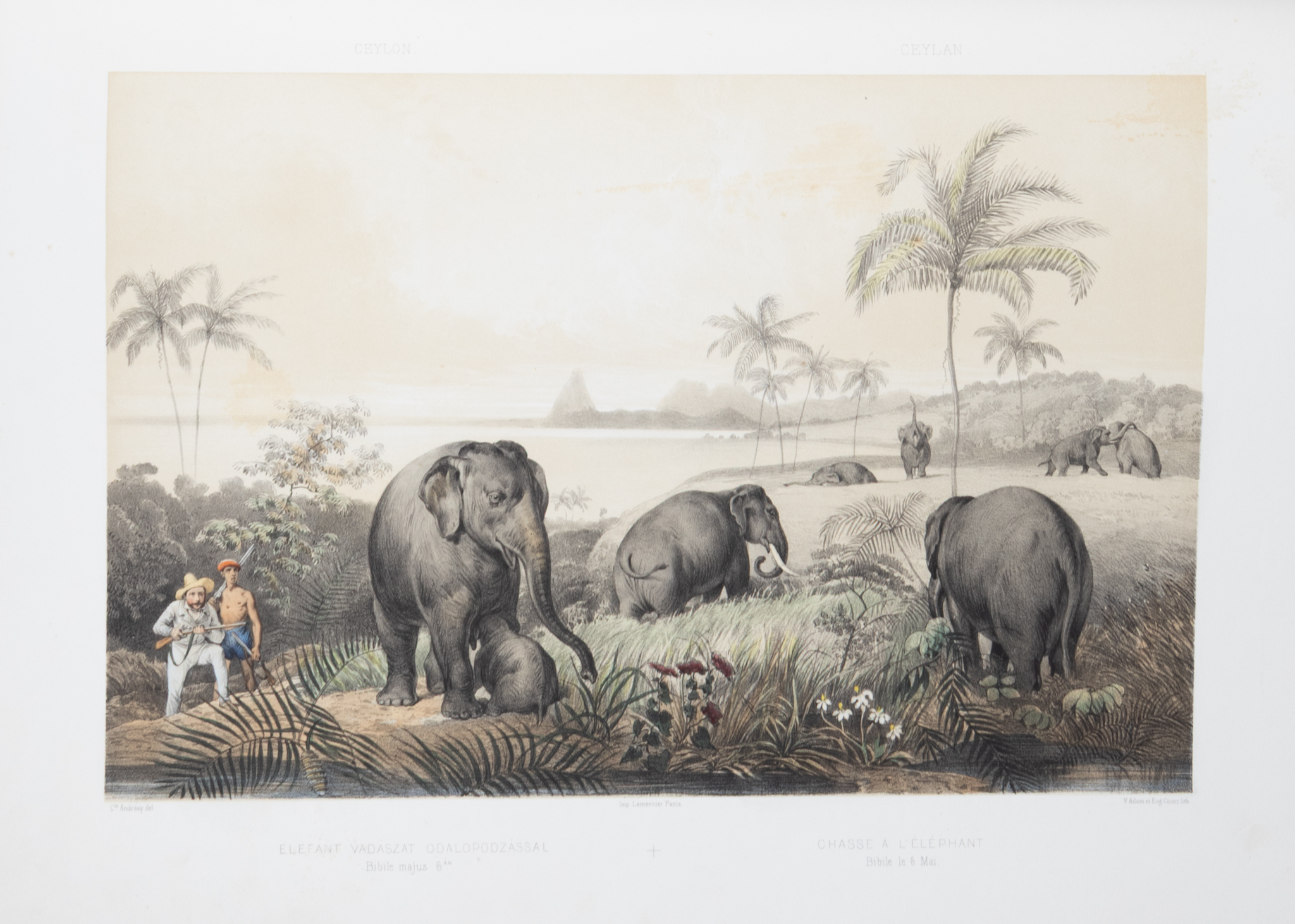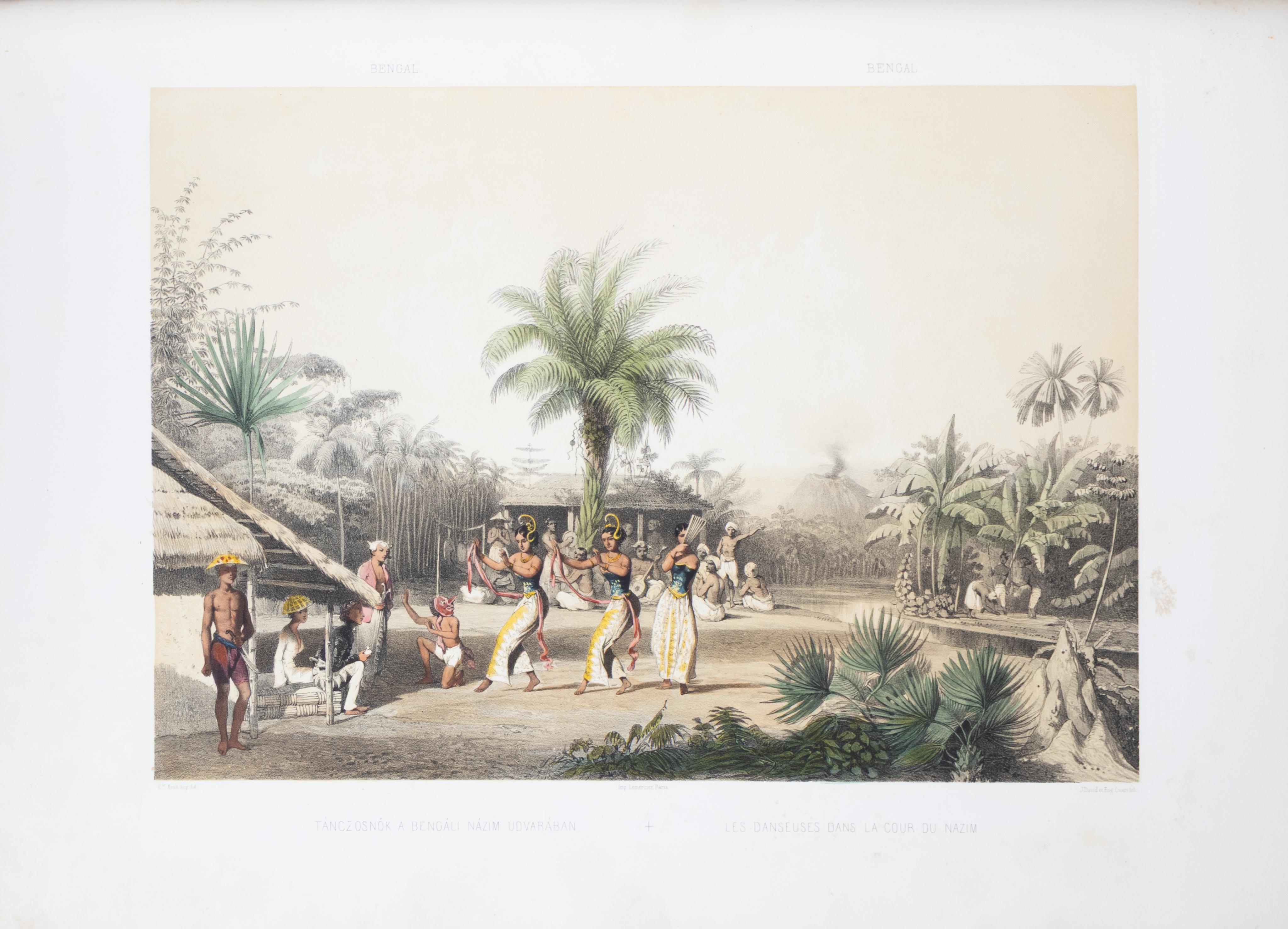 First German edition, and the first illustrated edition; the original Hungarian edition appeared in 1853. Count Manó Andrássy (1821–1891) was forced to leave Hungary after the defeat of the 1848 Revolution, just like his brother, Gyula Andrássy, the future Prime Minister of Hungary. He used his years in exile to embark on an extensive journey through Asia, during which he indulged his passion for big-game hunting. A talented draftsman, he created the original drawings for the splendid lithographs in this volume. The illustrations depict elephant and tiger hunts, as well as street scenes from Hong Kong and Calcutta, dance performances, and further fascinating scenes.