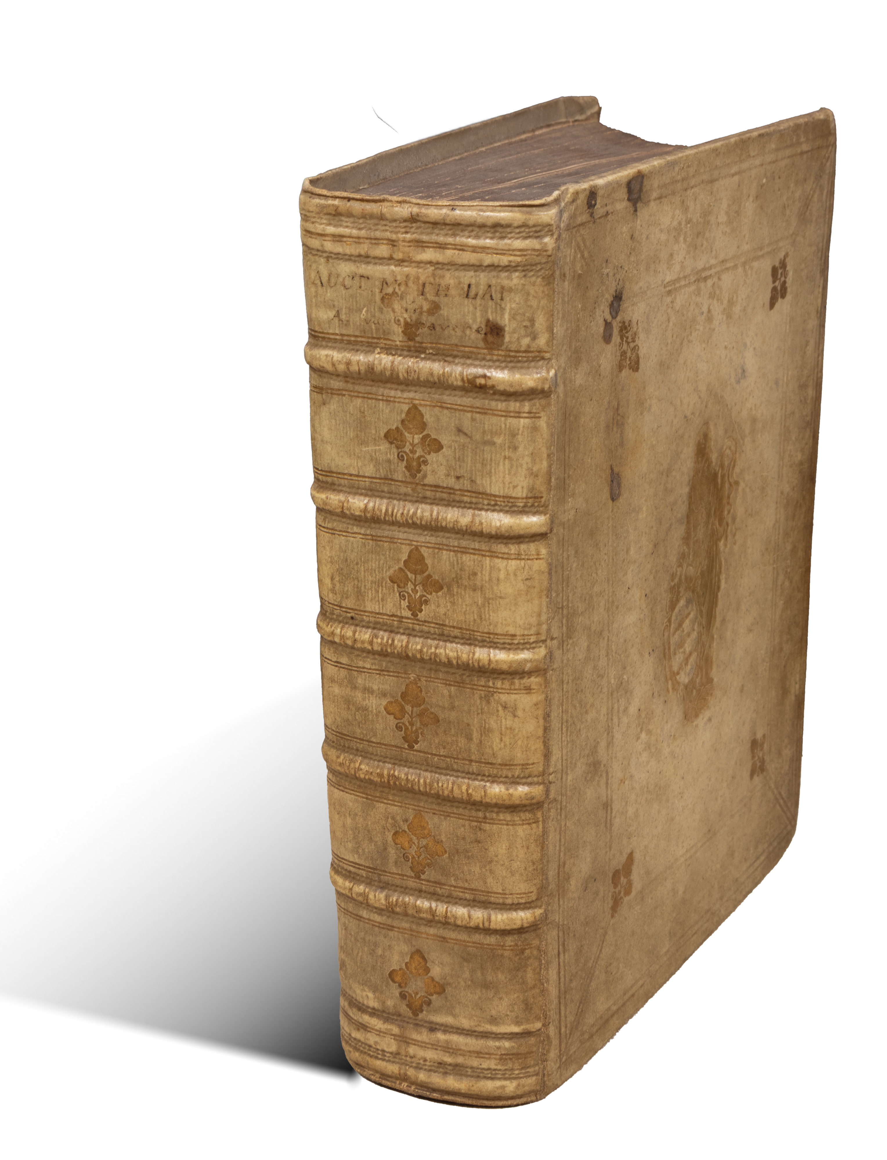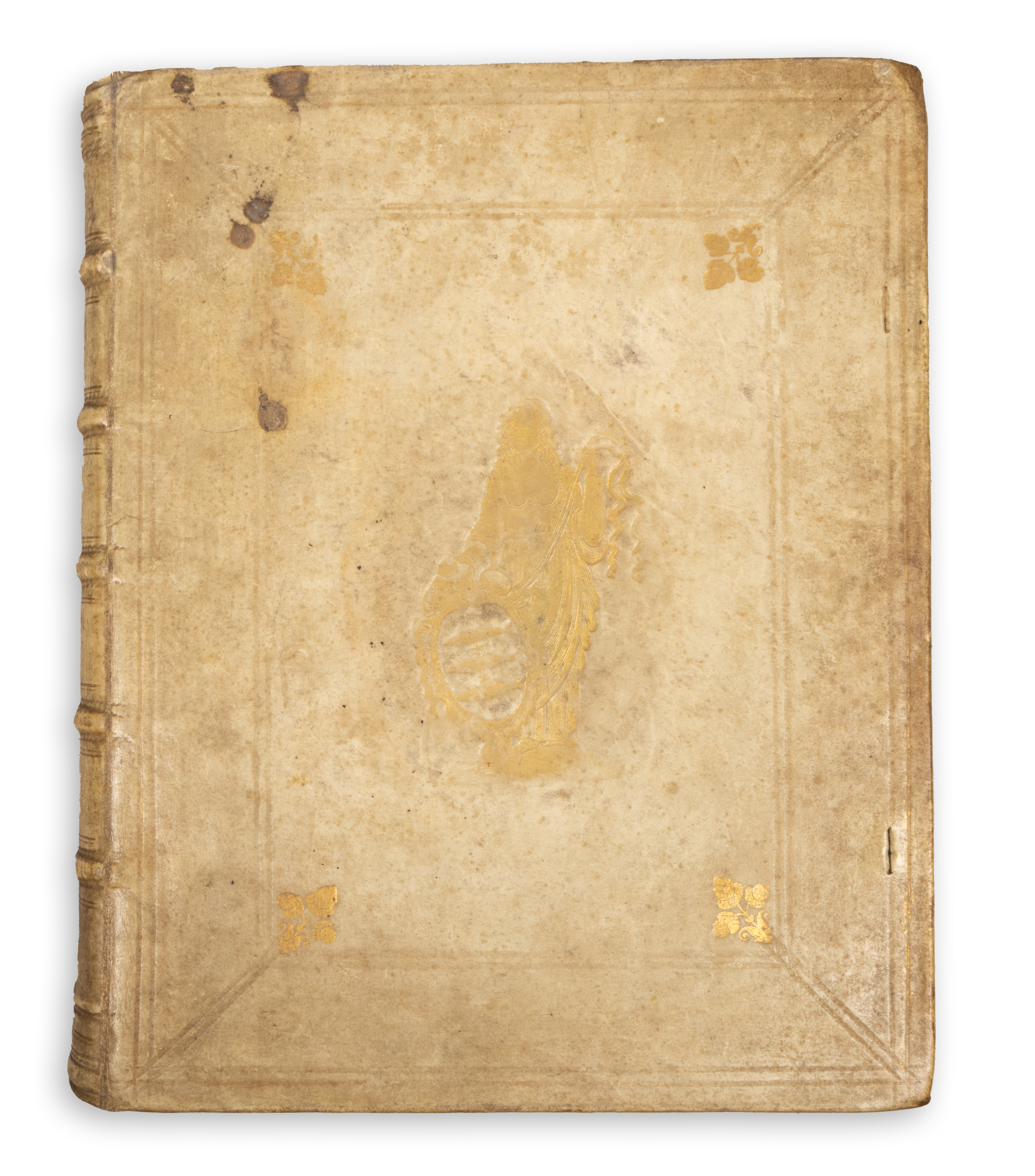 Korabeli bordázott gerincű és aranyozott egészpergamen iskolai jutalom kötésben, . A táblákon aranyozott vaknyomásos címer Szép állapotban.