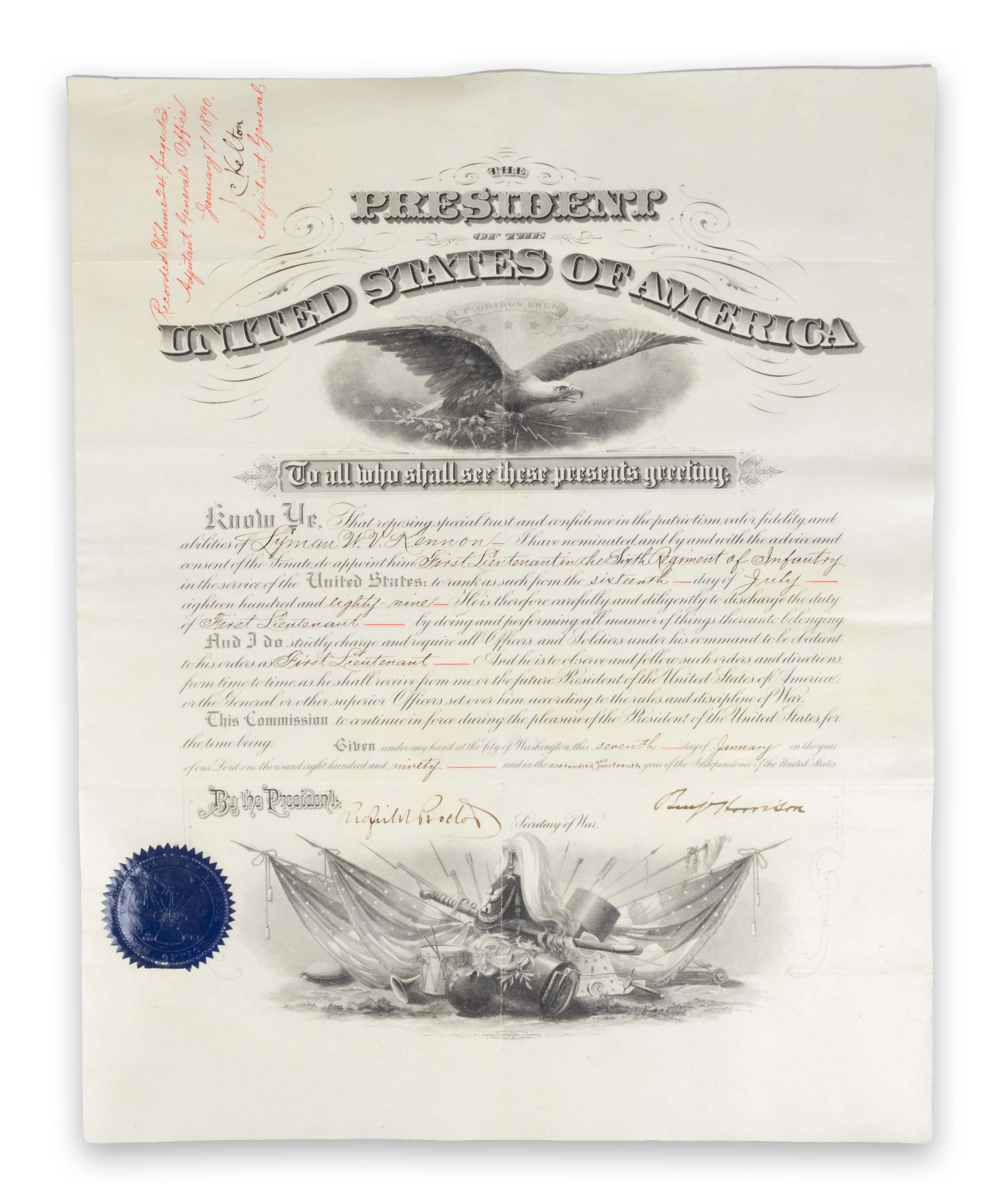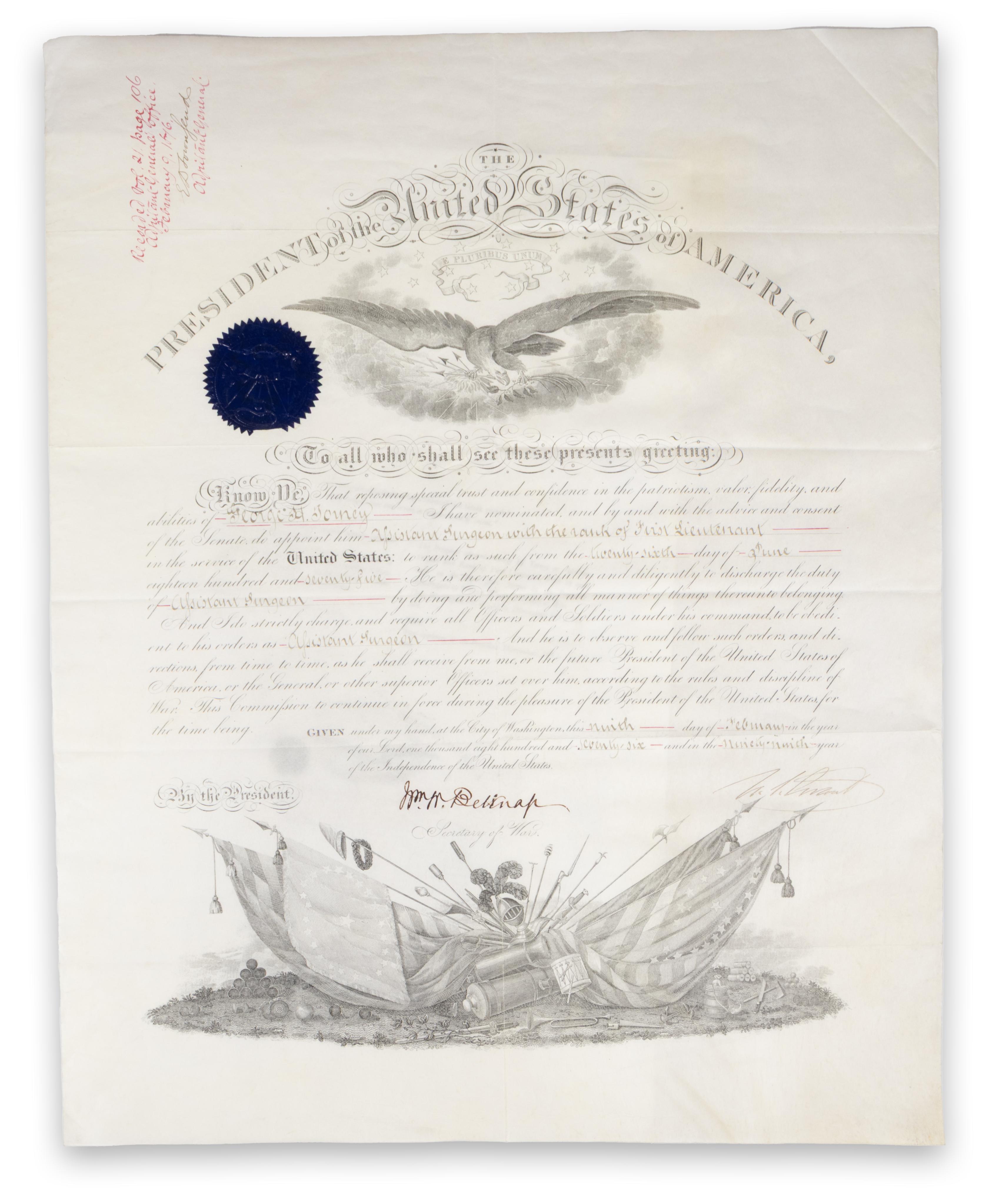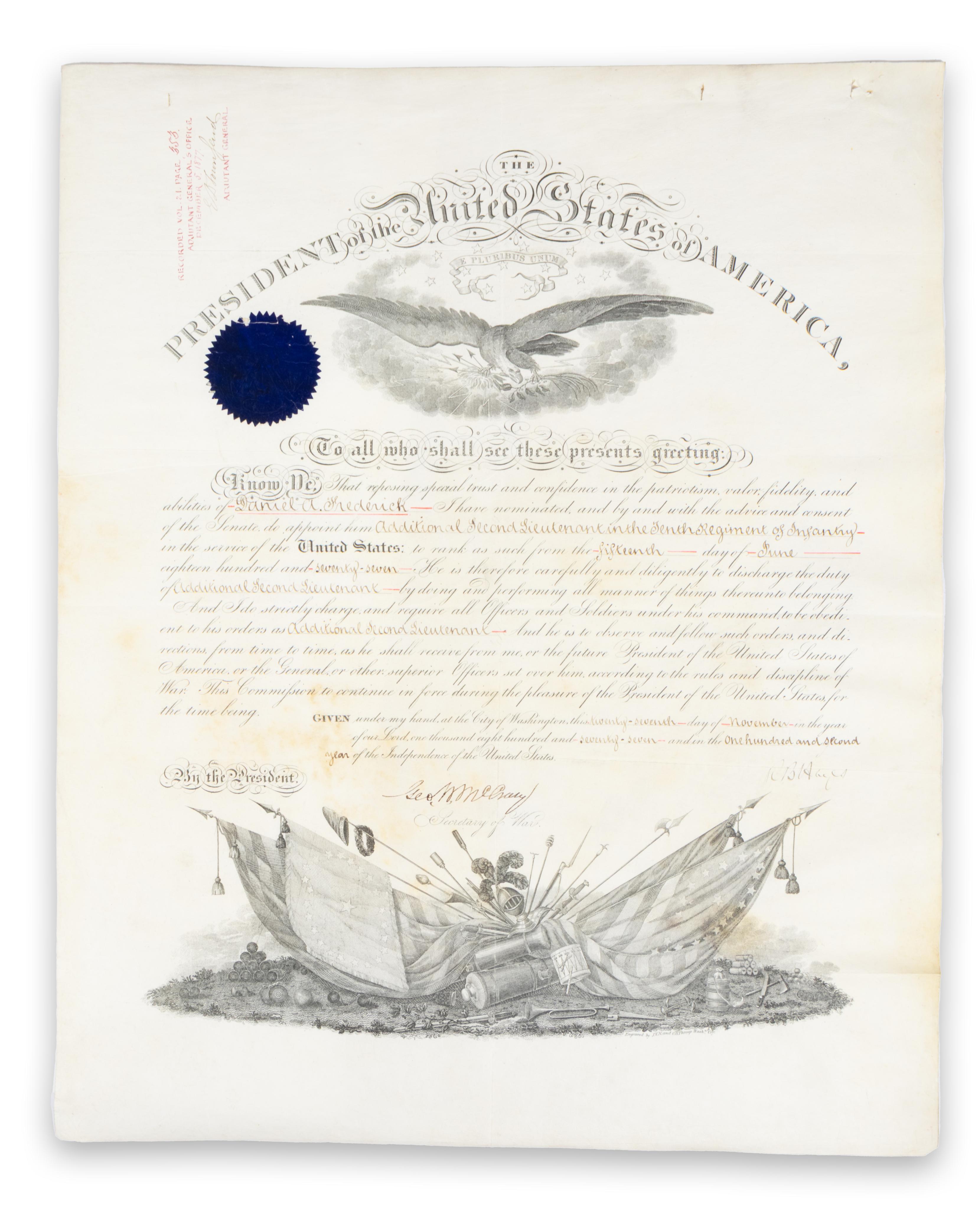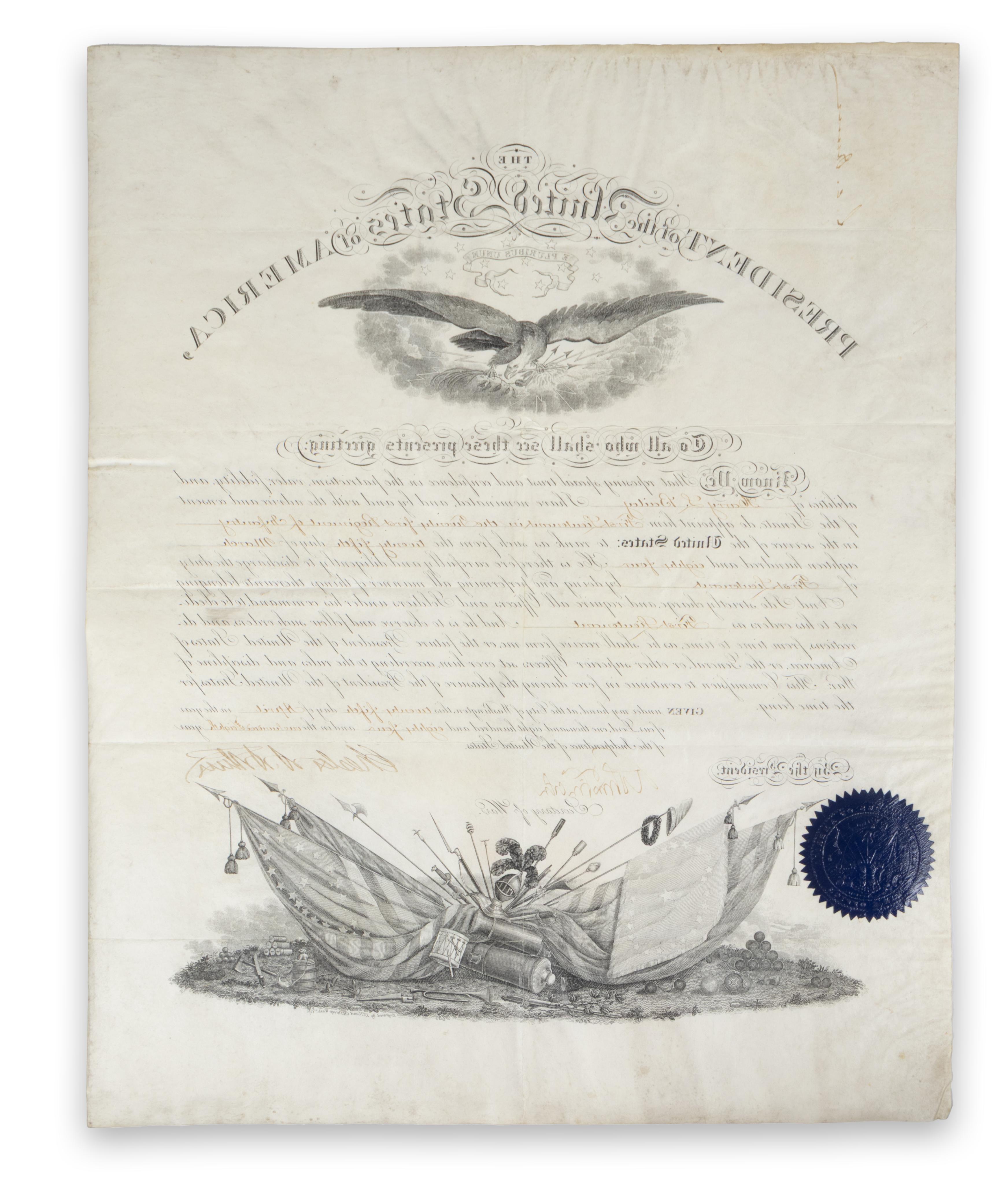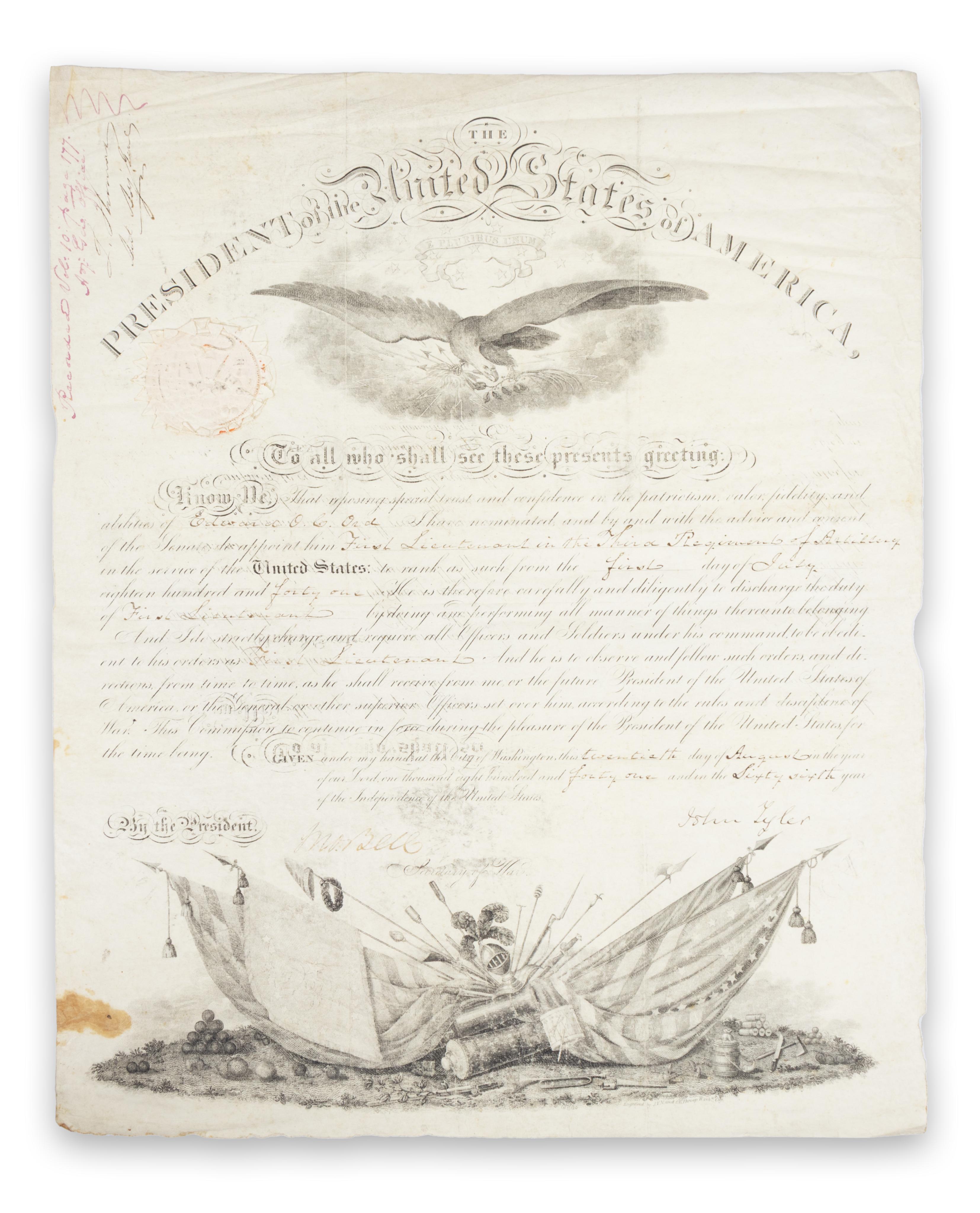 O. C. Ord kinevezése a 3. tüzérezred főhadnagyává. A dokumentumot a korszak katonai okirataira jellemző sasos motívumok díszítik. Egy nyomtatott oldal, papírfelzetes viaszpecséttel. John Tyler, az Egyesült Államok tizedik elnökének saját kezű (autográf) aláírása jobbra alul, mellette John Bell hadügyminiszter ellenjegyzésével. Kelt: Washington, 1841. augusztus 20. Mérete: 430 x 350 mm.