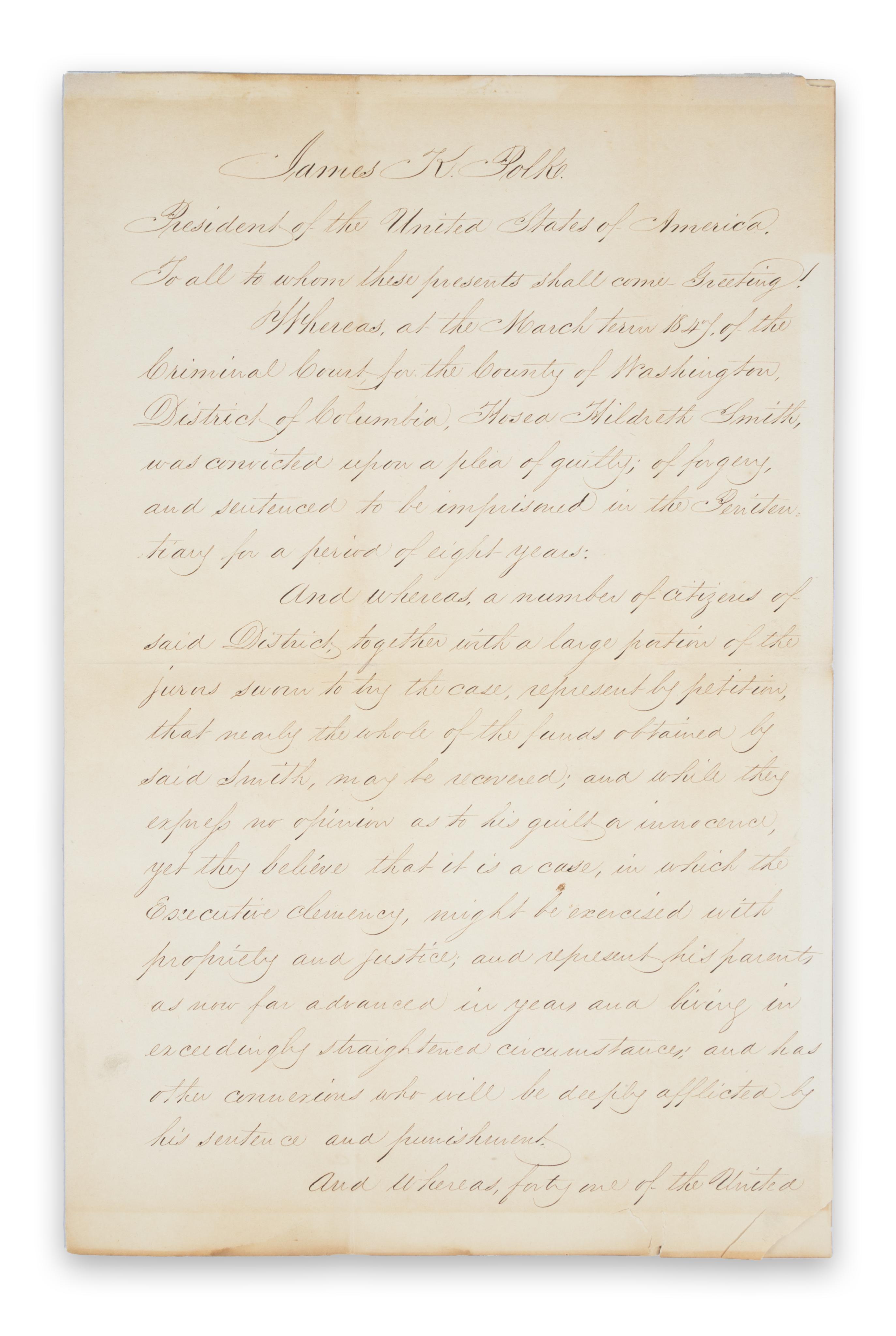 Elnöki kegyelem (presidential pardon) Meredith Smith részére. Négy beírt oldal, papírfelzetes viaszpecséttel. James K. Polk, az Egyesült Államok tizenegyedik elnökének aláírása a negyedik oldal alján, mellette James Buchanan külügyminiszter ellenjegyzésével. Kelt: Washington, 1848. június 29. Mérete: 390 x 255 mm.