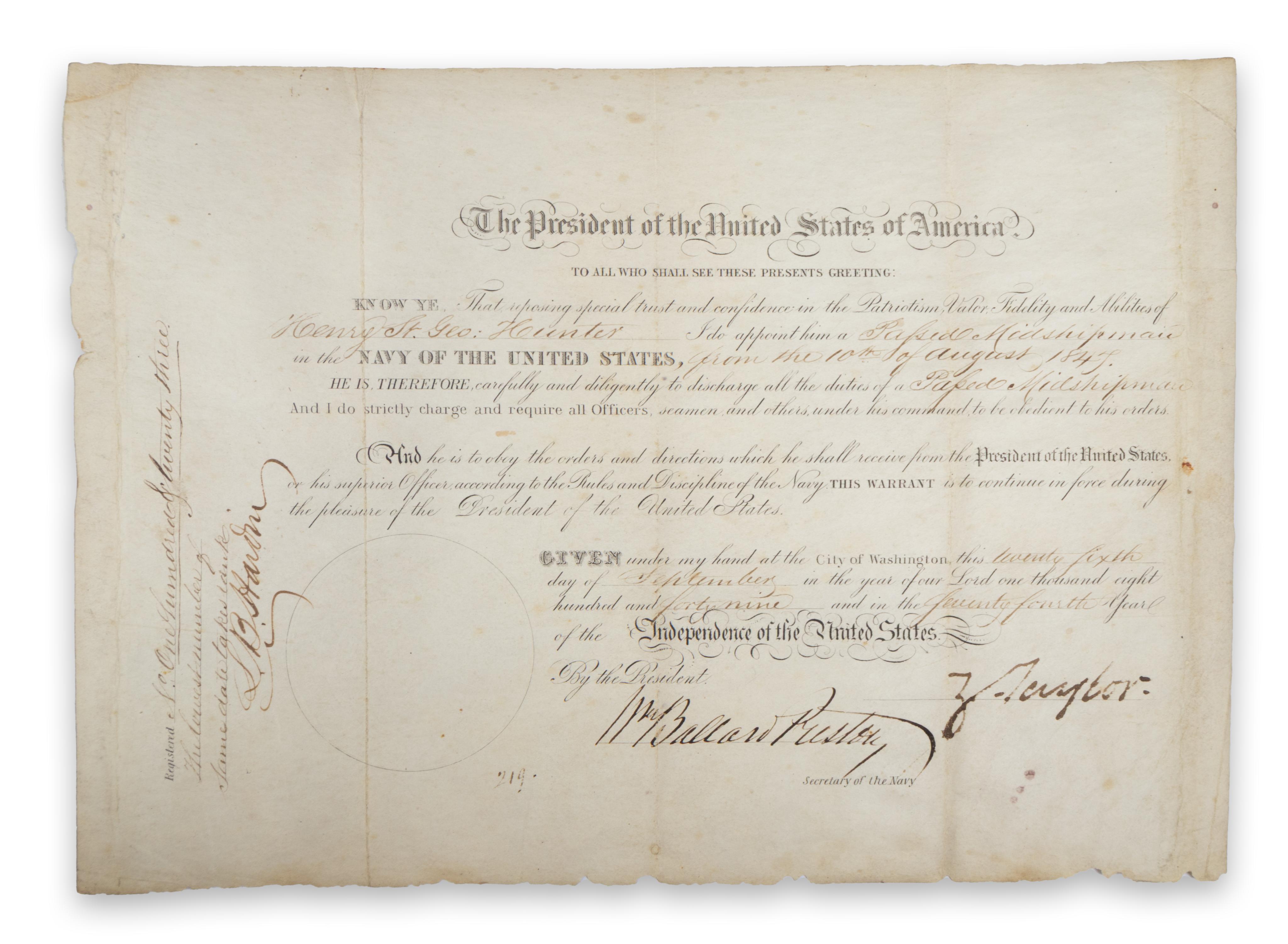 Haditengerészeti kinevezés, amely tanúsítja, hogy Henry St. George Hunter sikerrel elvégezte a kadétiskolát (Passed Midshipman). Egy nyomtatott oldal, szárazpecséttel. Zachary Taylor, az Egyesült Államok tizenkettedik elnökének aláírása jobbra alul, mellette William B. Preston haditengerészeti miniszter ellenjegyzésével. Kelt: Washington, 1849. szeptember 26. Mérete: 200 x 280 mm.