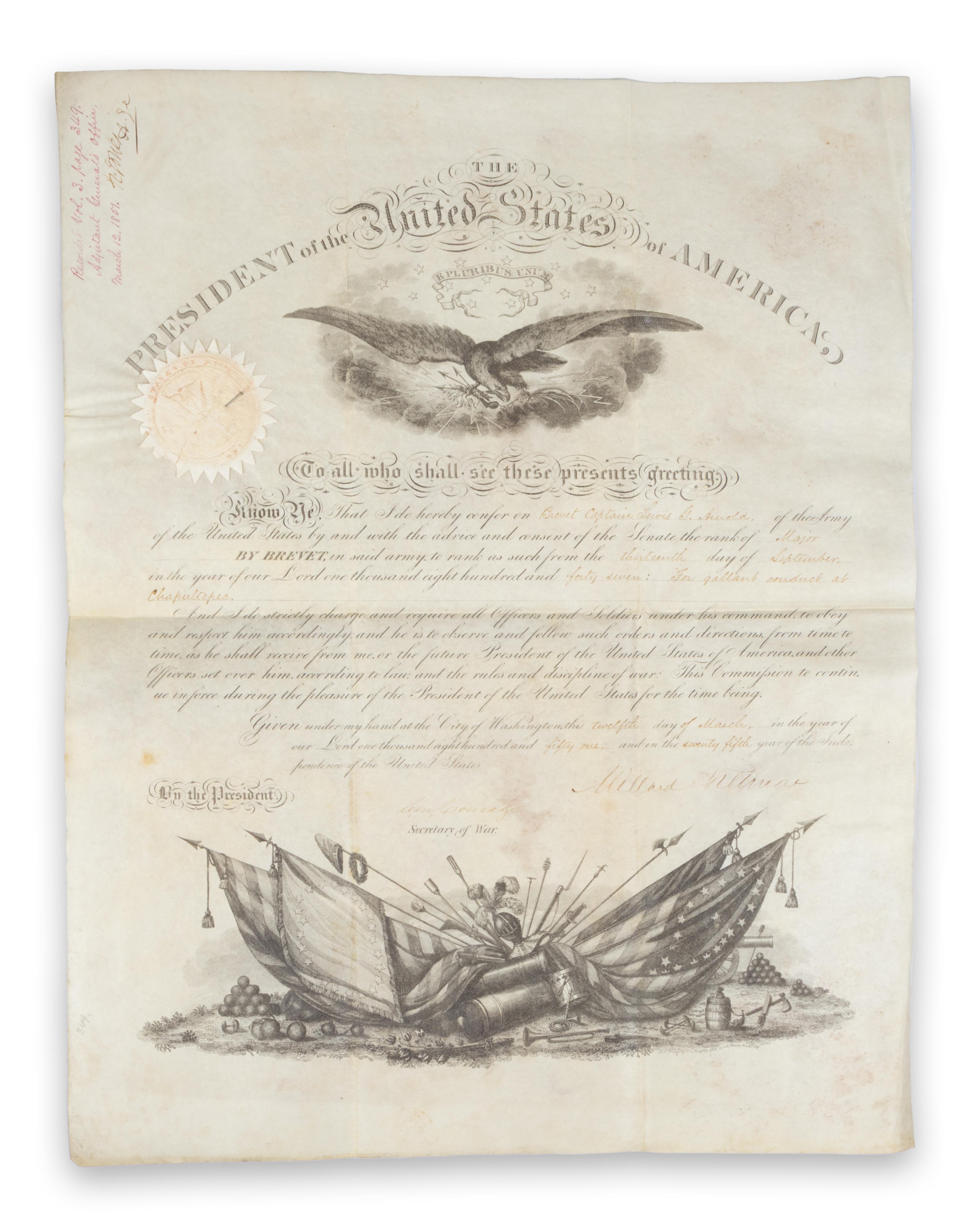 Lewis G. Arnold tartalékos százados (Brevet Captain) kinevezése tartalékos őrnaggyá (Major by Brevet). A dokumentumot a korszak katonai irataira jellemző sasos motívumok díszítik. Egy nyomtatott oldal, papírfelzetes viaszpecséttel. Millard Fillmore, az Egyesült Államok tizenharmadik elnökének saját kezű aláírása jobbra alul, mellette Charles M. Conrad hadügyminiszter ellenjegyzésével. Kelt: Washington, 1851. március 12. Mérete: 480 x 375 mm.