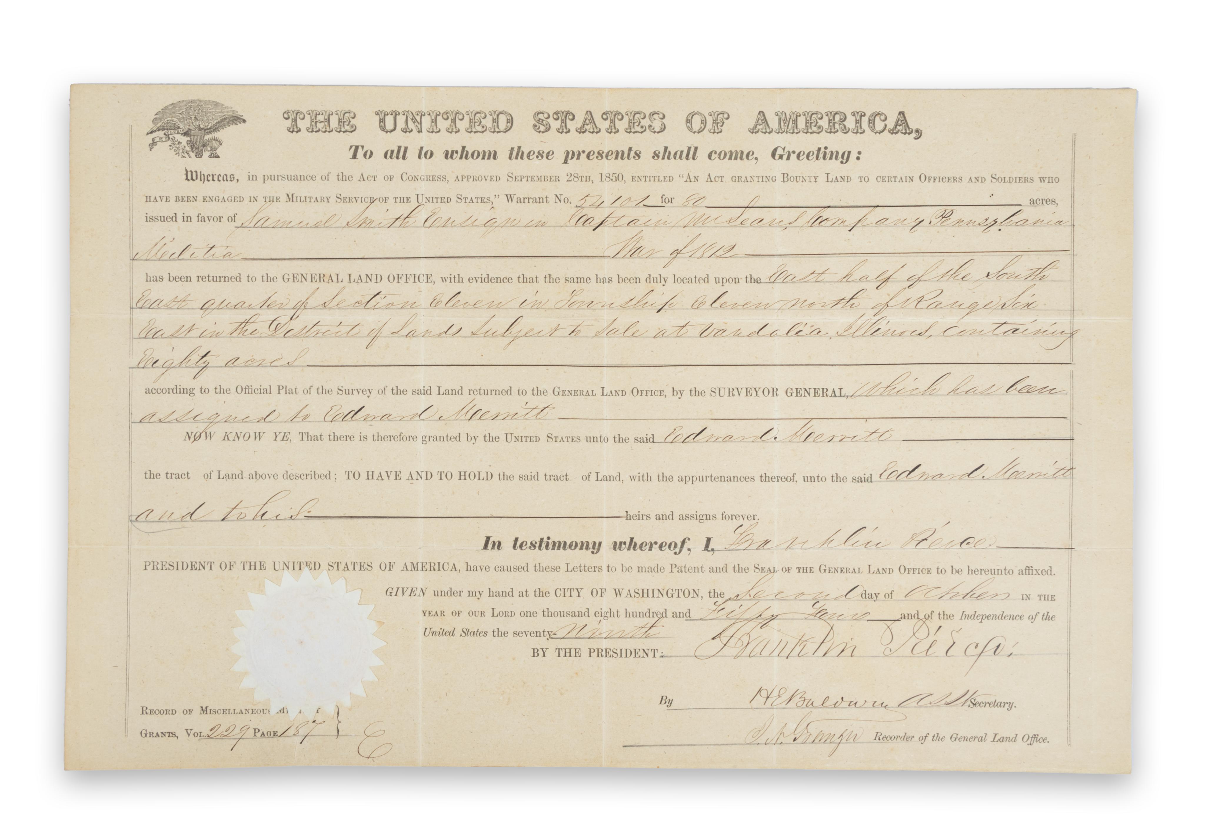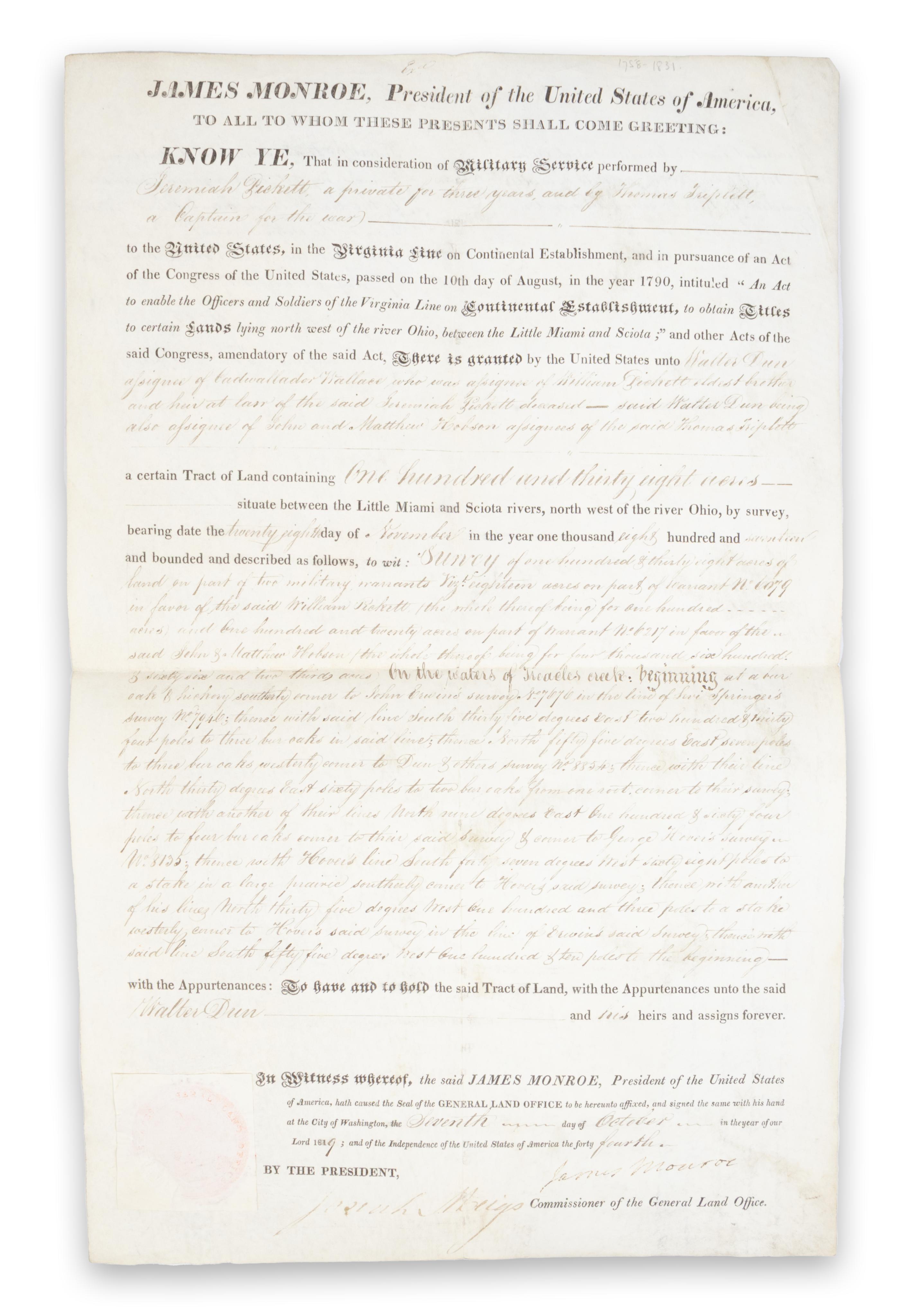 Birtokadomány két leszerelt katona részére az Ohio folyó völgyében. Egy nyomtatott oldal, fehér papírfelzetes szárazpecséttel. James Monroe, az Egyesült Államok ötödik elnökének saját kezű (autográf) aláírása jobbra alul, mellette Josiah Meigs, a földhivatal megbízottjának (Commissioner of the General Land Office) ellenjegyzésével. Kelt: Washington, 1819. október 7. Mérete: 455 x 285 mm.