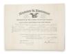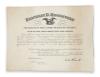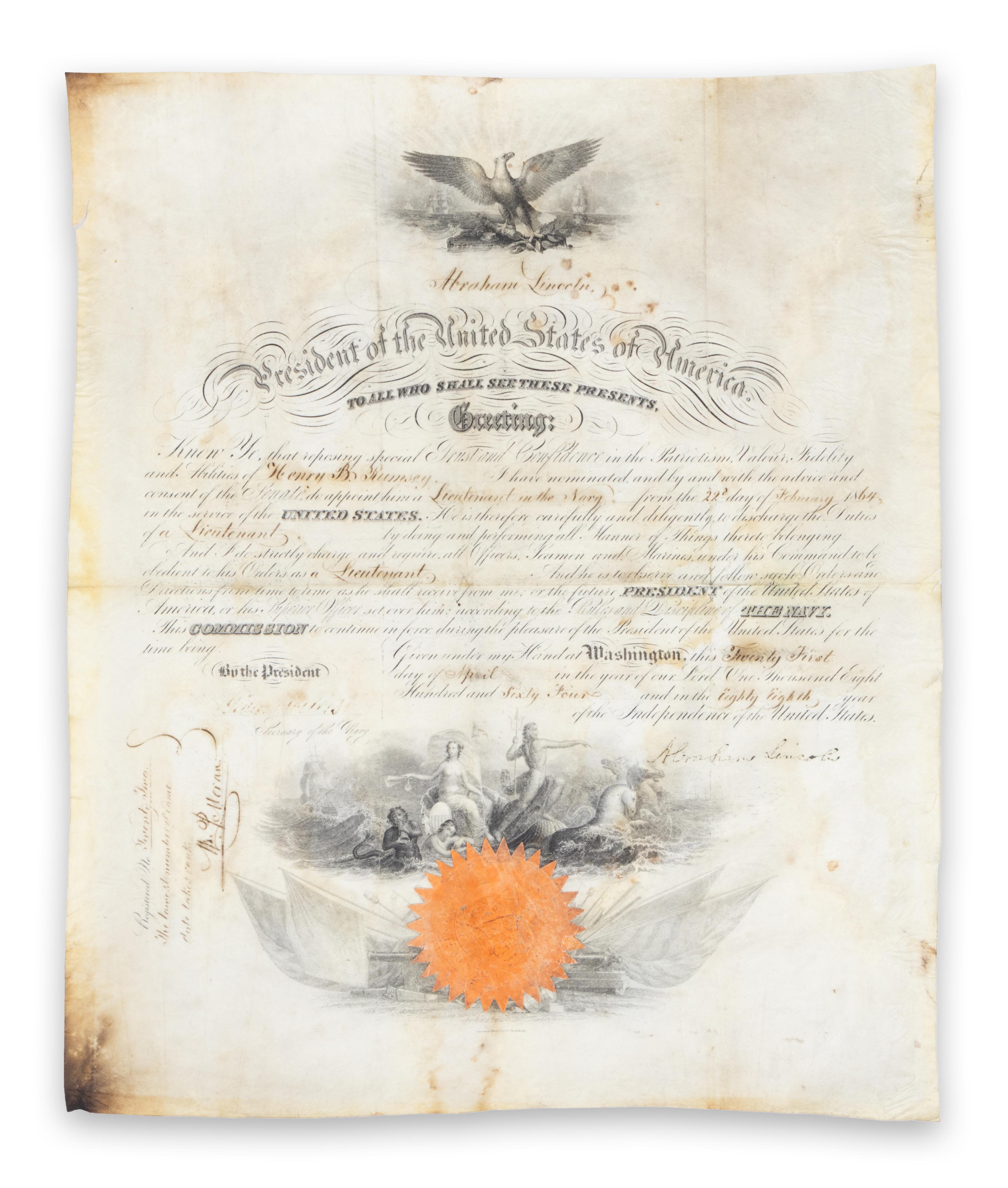 Henry B. Rumsey előléptetése a flotta hadnagyává. A dokumentumot a korszak tengerészeti irataira jellemző sasos motívumok díszítik. Egy nyomtatott oldal, papírfelzetes viaszpecséttel. Abraham Lincoln, az Egyesült Államok tizenhatodik elnökének autográf aláírása jobbra alul, mellette Gideon Welles haditengerészeti miniszter ellenjegyzésével. Kelt: Washington, 1864. április 21. Mérete: 455 x 385 mm.