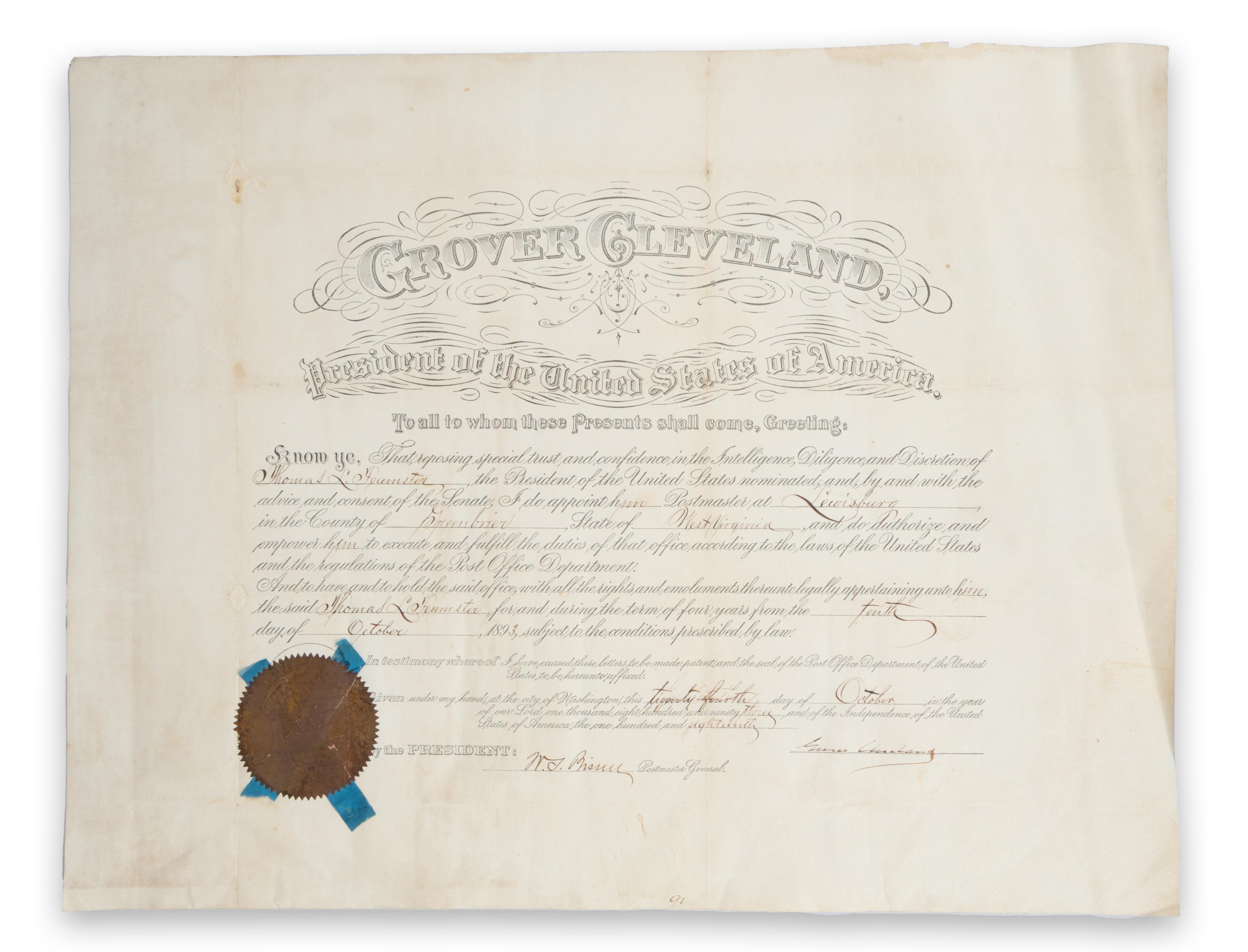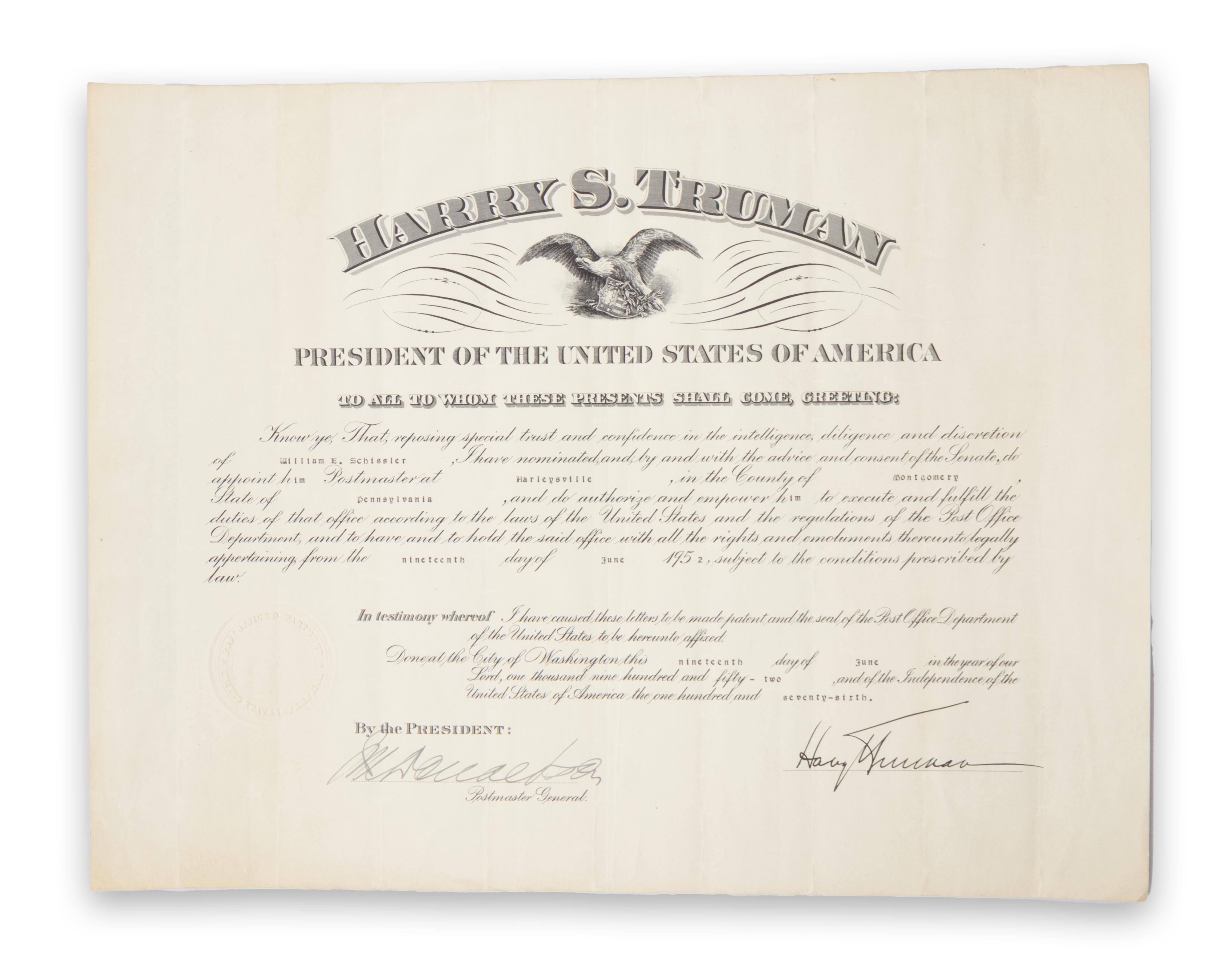 William E. Schissler kinevezése a pennsylvaniai Harleysville postamesterévé. A fejlécen a név alatt a sas motívummal. Egy nyomtatott oldal, szárazpecséttel. Harry S. Truman, az Egyesült Államok harmincharmadik elnökének autográf aláírása jobbra alul, mellette Jesse M. Donladson főpostamester ellenjegyzésével. Kelt: Washington, 1952. június 19. Mérete: 305 x 450 mm.
