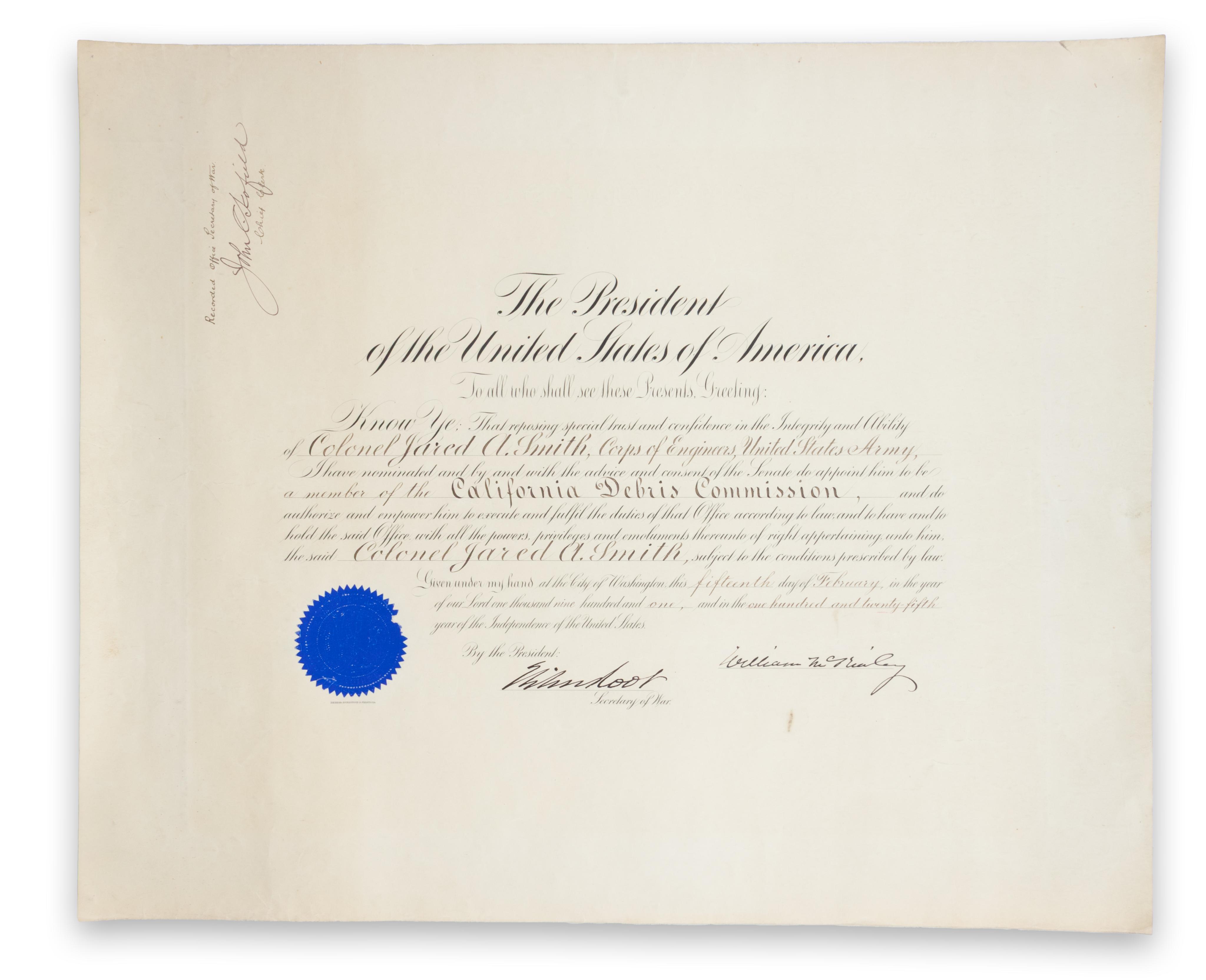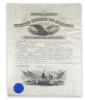 Isaac I. Stevens kinevezése a műszaki hadtest főhadnagyává. A dokumentumot sasos motívum díszíti. Egy nyomtatott oldal, papírfelzetes viaszpecséttel. Martin Van Buren, az Egyesült Államok nyolcadik elnökének saját kezű (autográf) aláírása jobbra alul, mellette Joel R. Poinsett hadügyminiszter ellenjegyzésével. Kelt: Washington, 1840. július 25. Mérete: 425 x 350 mm.