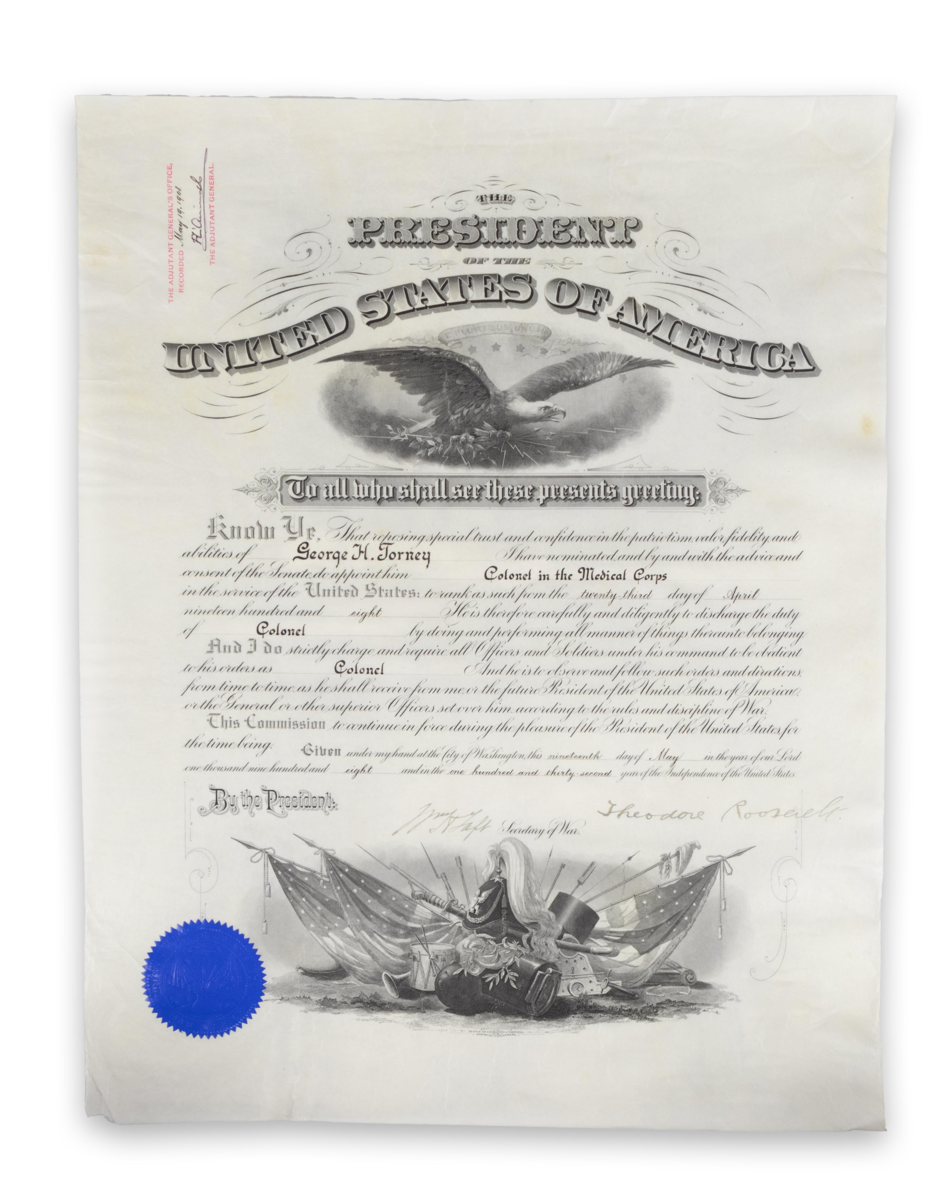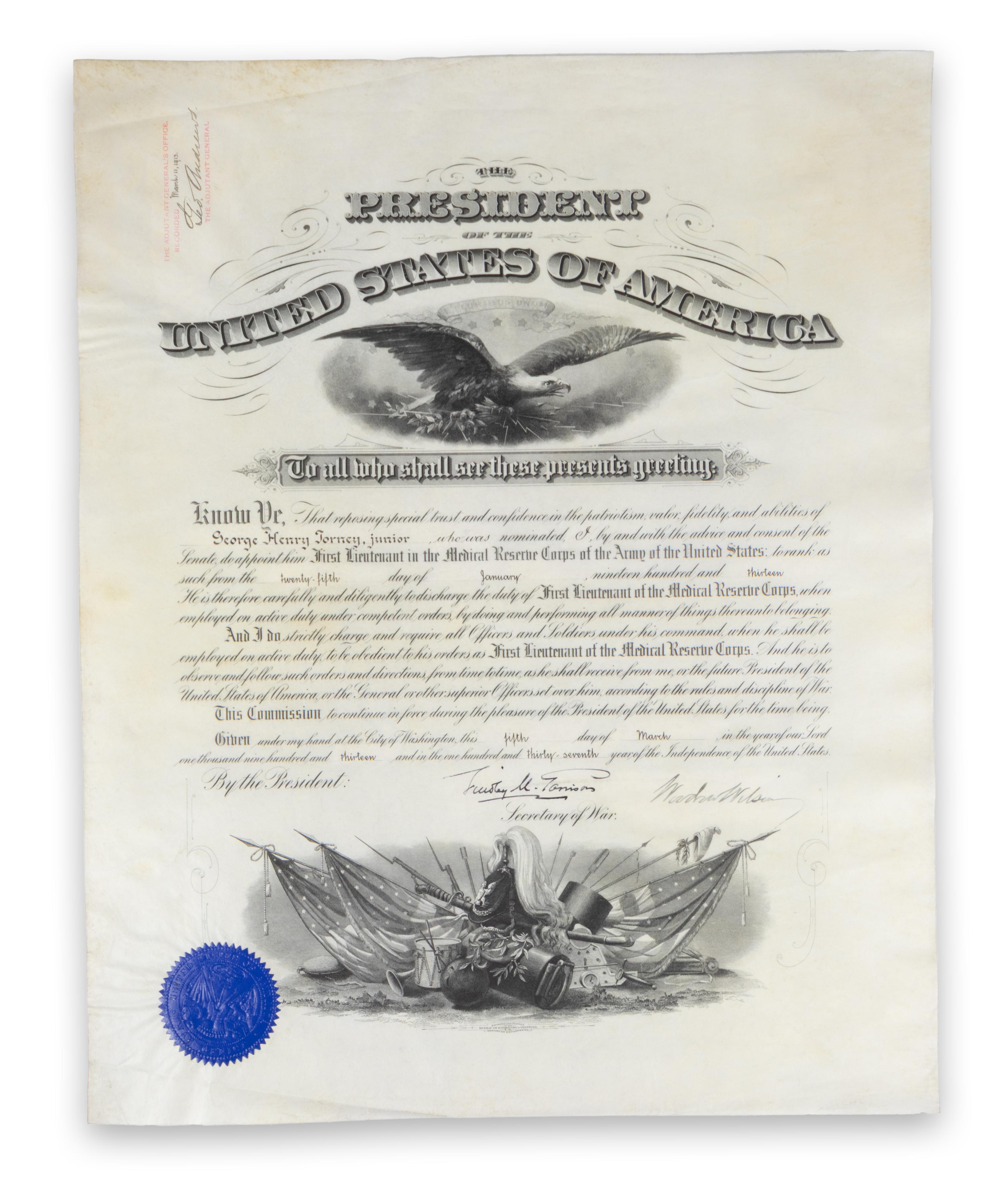 The President appoints George H. Torney Jr. as First Lientenant in Medical Reserve Corps. With an eagle motif on the upper part. Signed by the president, countersigned by Lindley Garrison, Secretary of War. Place and date: Washington, March 5, 1913. Dimensions: 500 x 400 mm.