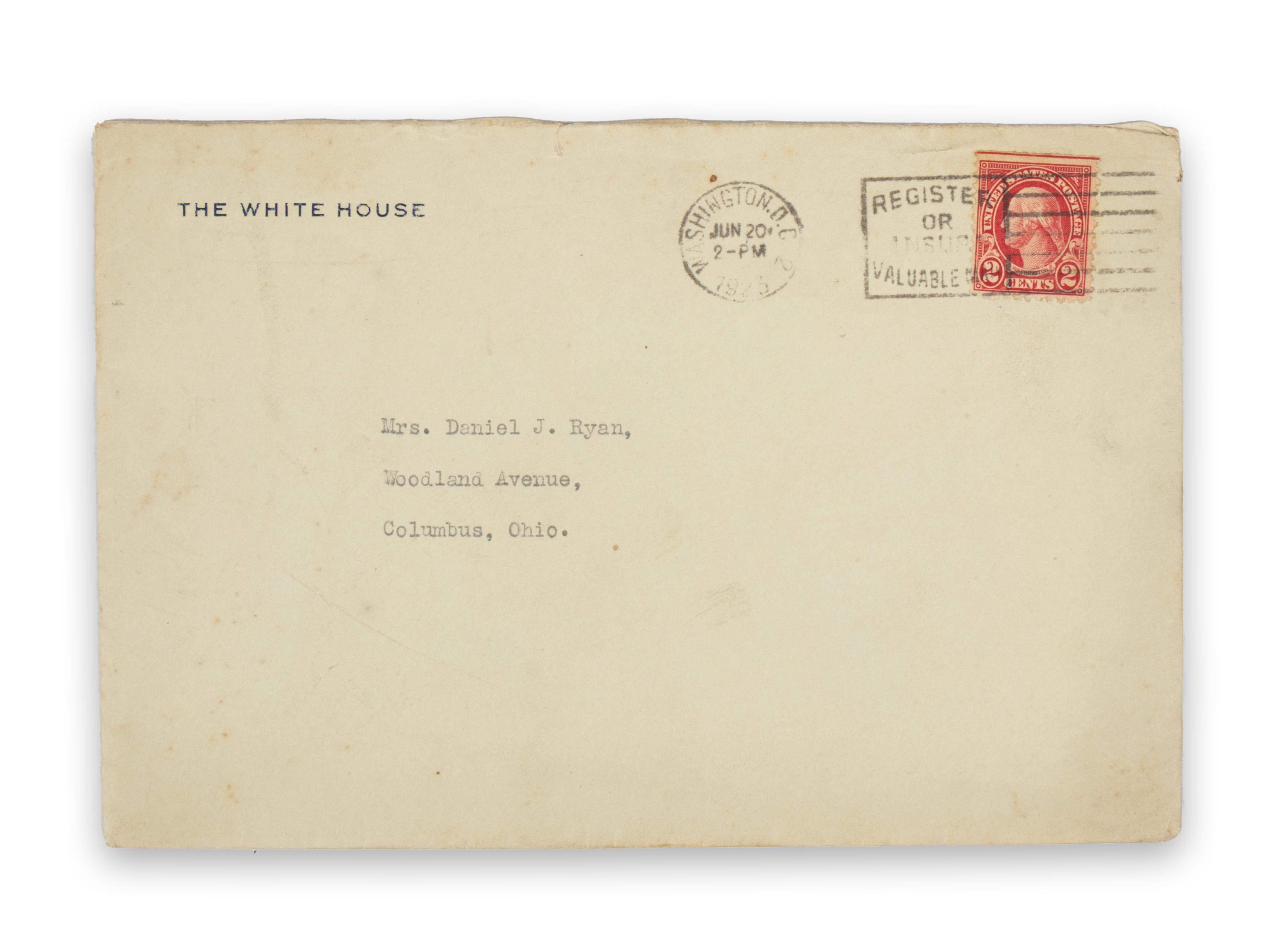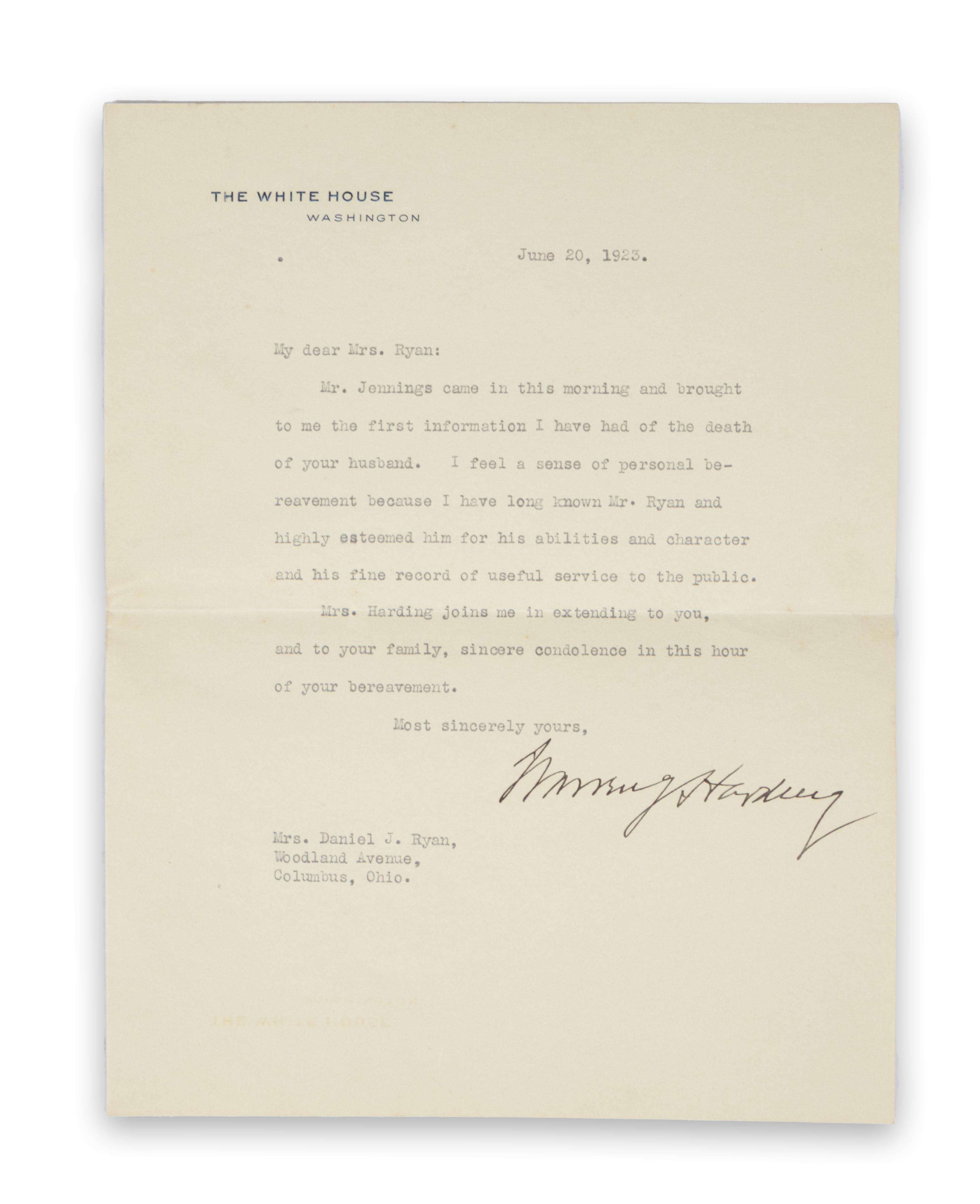 Részvétnyilvánító levél Mrs. Daniel J. Ryan részére. Egy gépelt oldal, a Fehér Ház fejléces levélpapírján. Boríték mellékelve. Warren G. Harding, az Egyesült Államok huszonkilencedik elnökének saját kezű aláírásával. Kelt: Washington, 1923. június 20. Mérete: 230 x 178  mm
