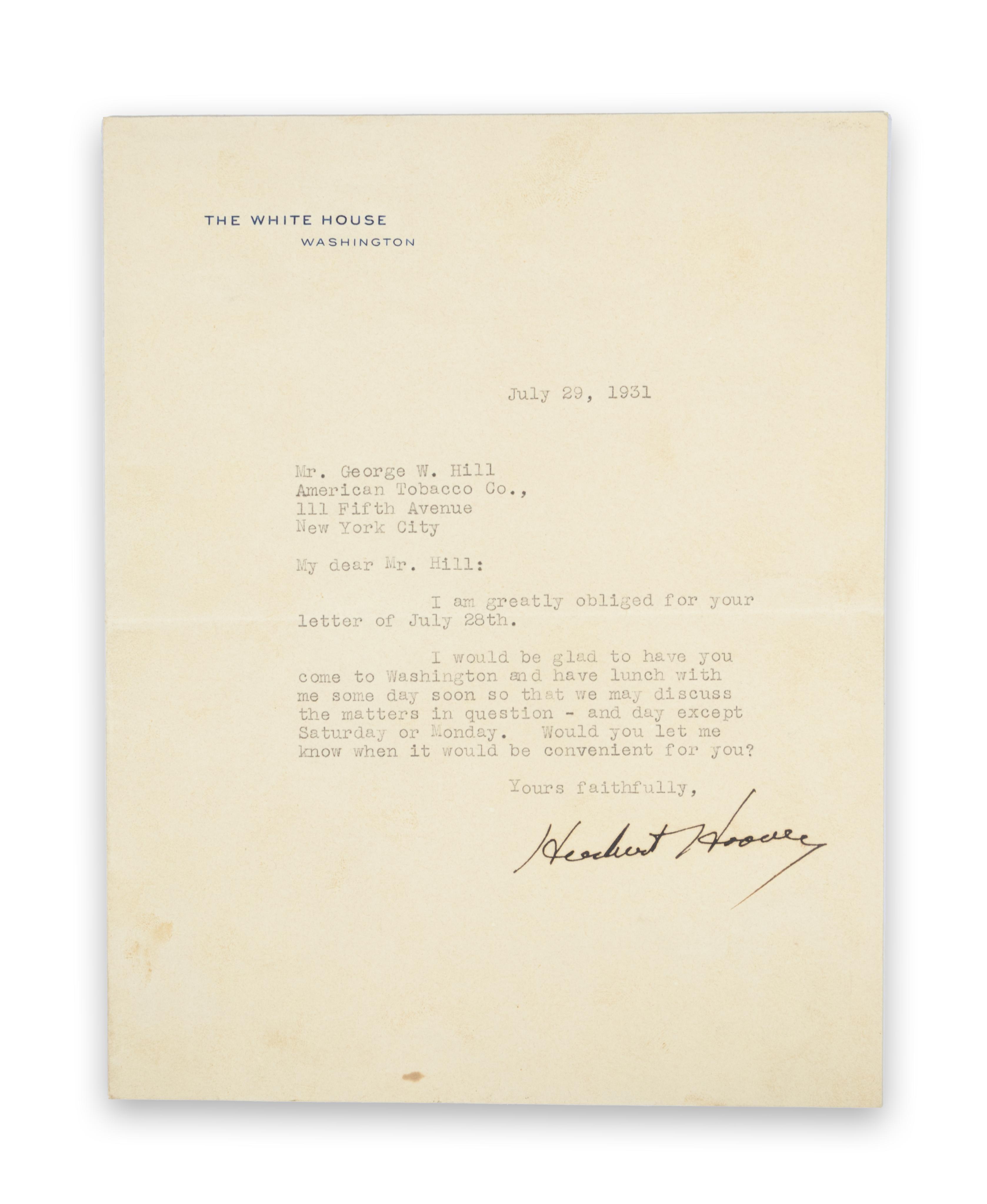A personal letter to George Hill, President of the American Tobacco Company. One typewritten page, White House stationary, signed by the President. Place and date: Washington, 06. 08. 1931. Dimensions: 225 x 175 mm.