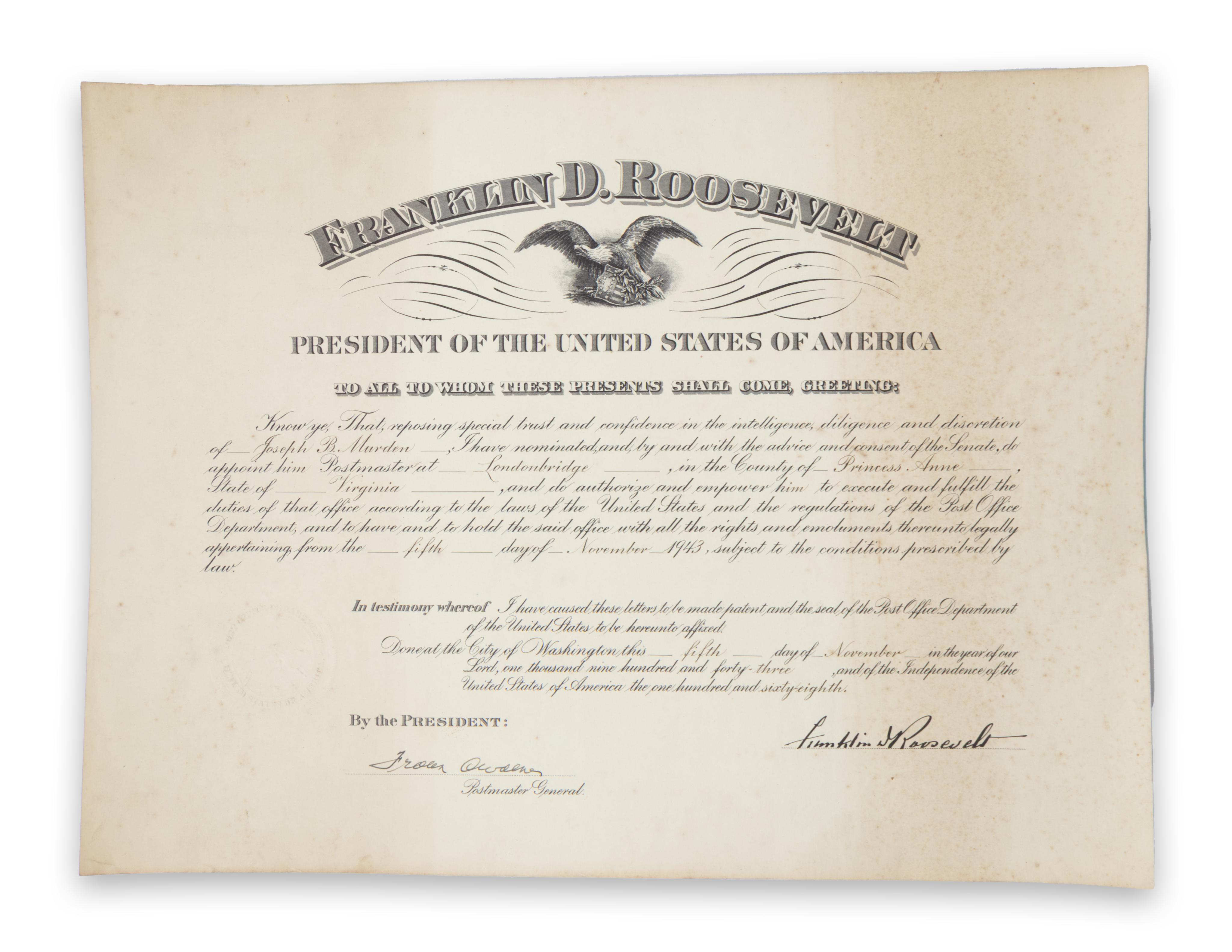 Joseph B. Murden kinevezése Virginia állam London Bridge városának postamesterévé. A fejlécen a név alatt sassal díszített motívum. Egy nyomtatott oldal, viaszpecséttel. Franklin D. Roosevelt, az Egyesült Államok harminckettedik elnökének saját kezű aláírása jobbra alul, mellette Frank C. Walker főpostamester ellenjegyzésével. Kelt: Washington, 1943. november 5. Mérete: 345 x 455 mm.