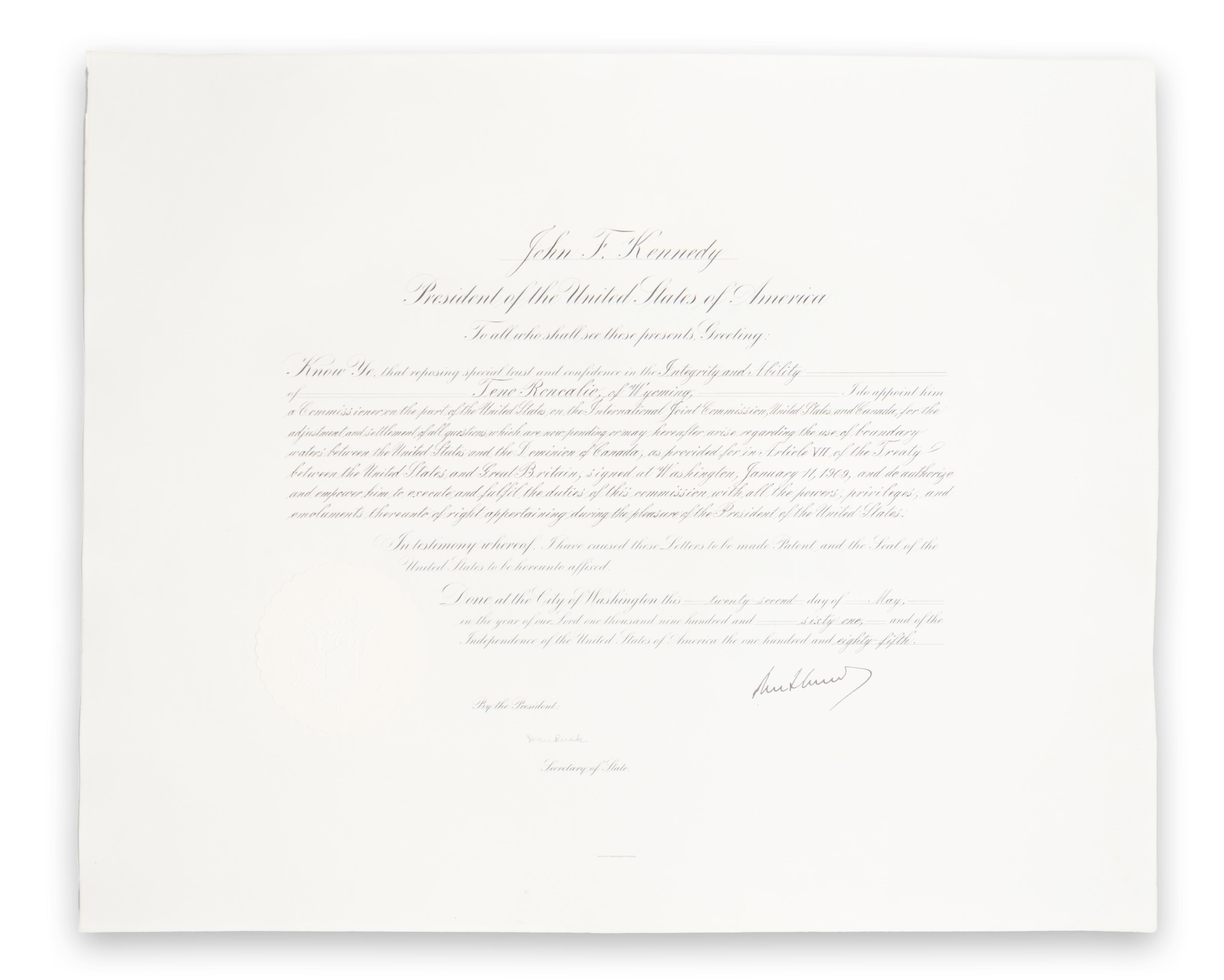 Teno D. Roncalio delegálása az USA és Kanada közötti vízi jogokkal foglalkozó nemzetközi bizottságba. Egy nyomtatott oldal, papírfelületen szárazpecséttel. John F. Kennedy, az Egyesült Államok harmincötödik elnökének autográf aláírása jobbra alul, mellette Dean Rusk külügyminiszter ellenjegyzésével. Kelt: Washington, 1961. május 22. Mérete: 475 x 580 mm.
