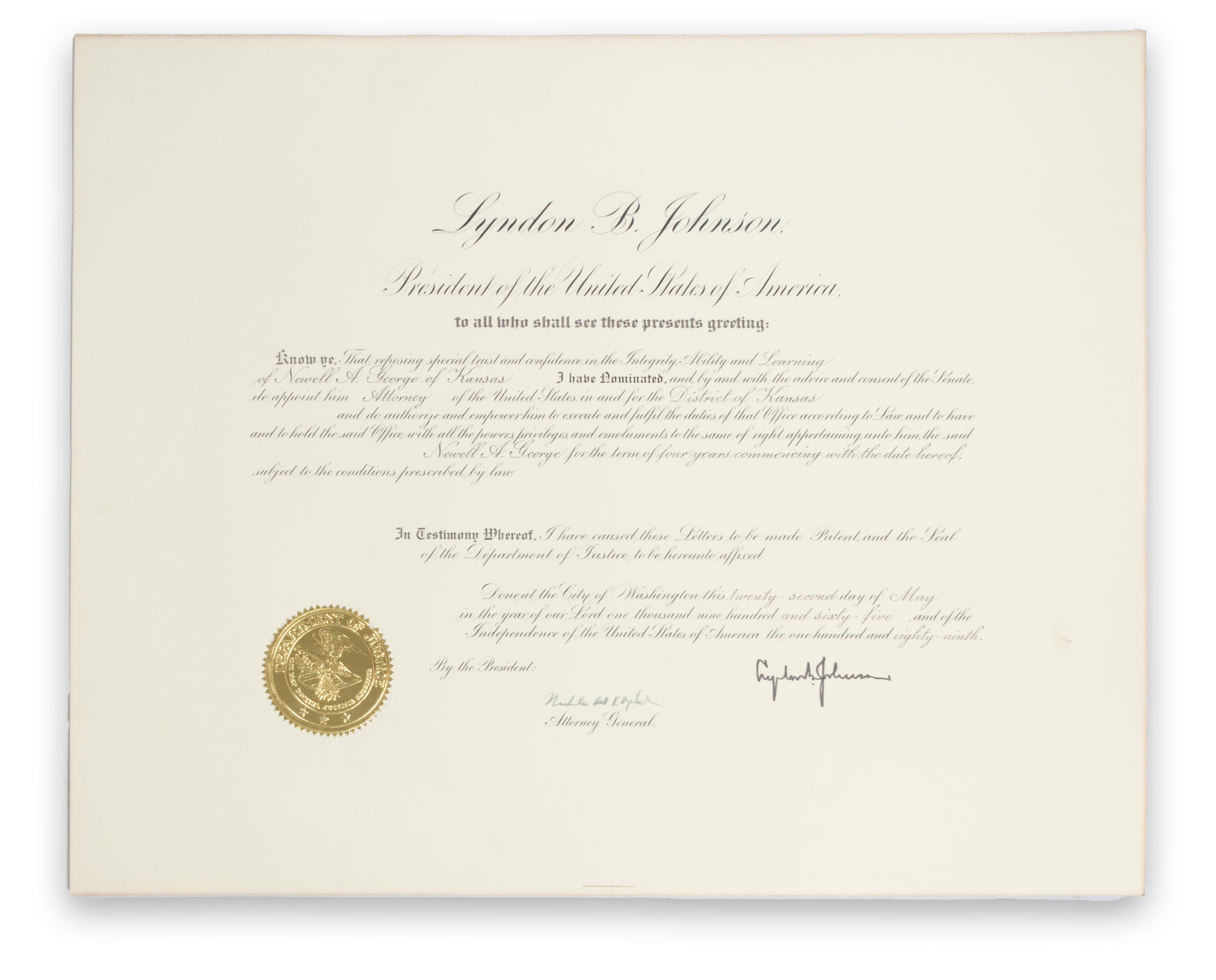 Newell A. George kinevezése Kansas körzeti ügyészévé. Egy nyomtatott oldal, aranyszínű papírfelzetes szárazpecséttel. Lyndon B. Johnson, az Egyesült Államok harminchatodik elnökének autográf aláírása jobbra alul, mellette Nicholas Katzenbach főállamügyész ellenjegyzésével. Kelt: Washington, 1965. május 22. Mérete: 405 x 500 mm.