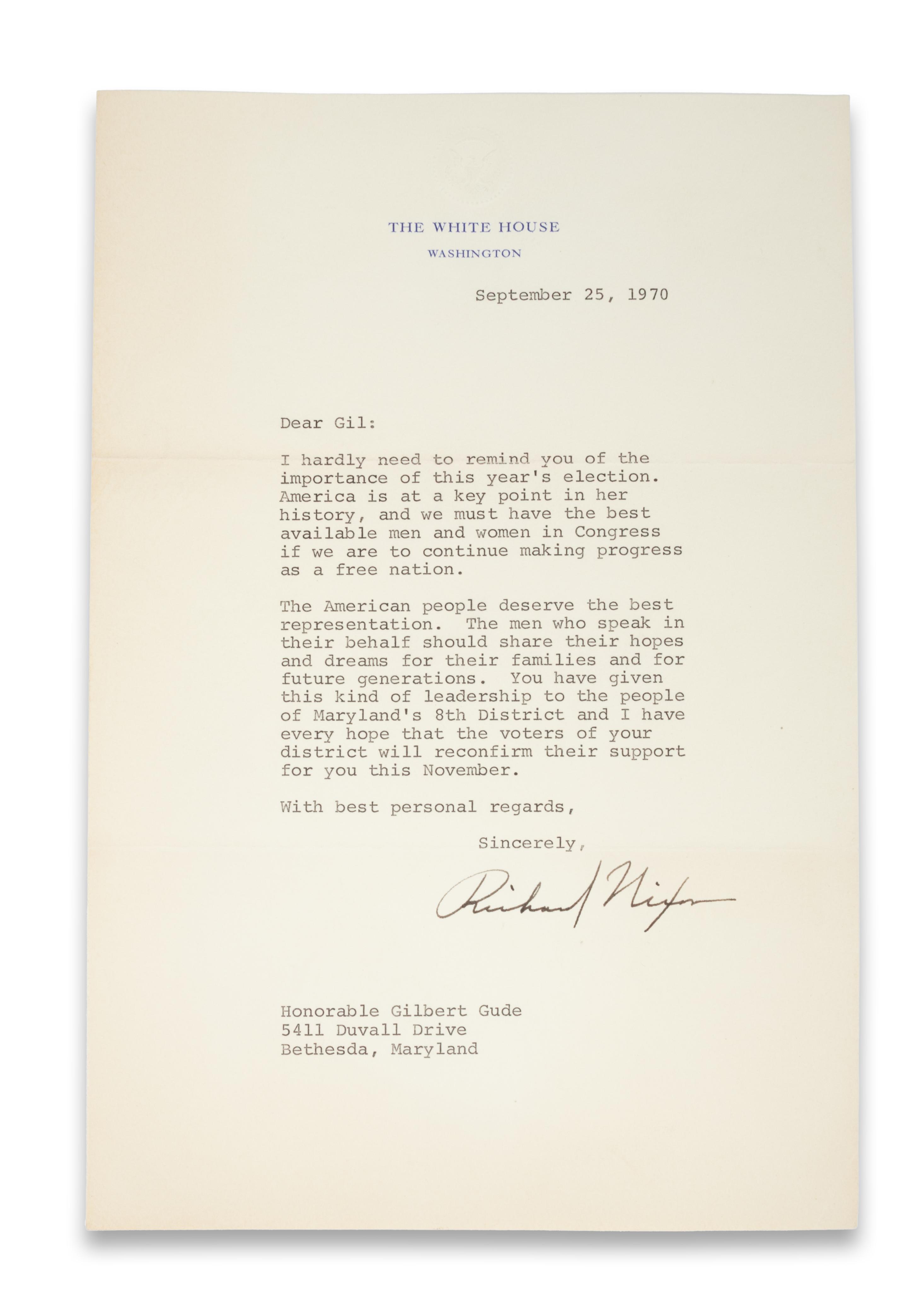Személyes, baráti hangvételű levél Gilbert Gude republikánus képviselő részére a választásokkal kapcsolatban. Egy gépelt oldal, a Fehér Ház fejléces papírján. Richard Nixon, az Egyesült Államok harminchetedik elnökének aláírásával. Kelt: Washington, 1970. szeptember 25. Mérete: 265 × 180 mm.